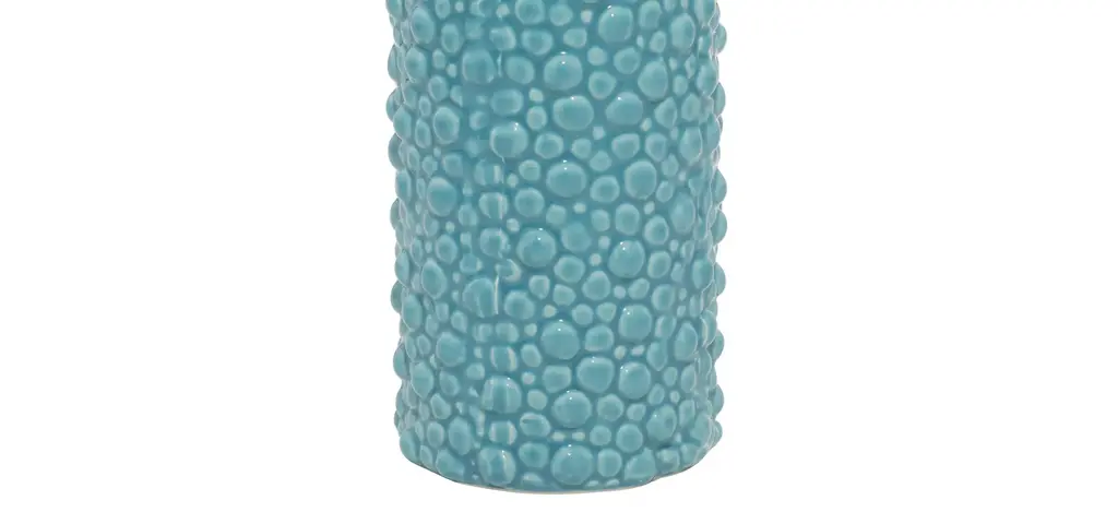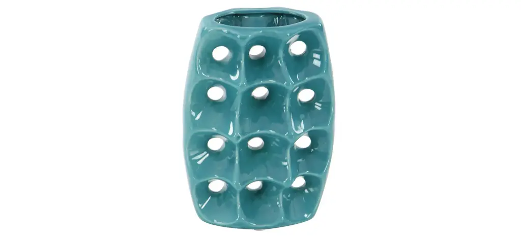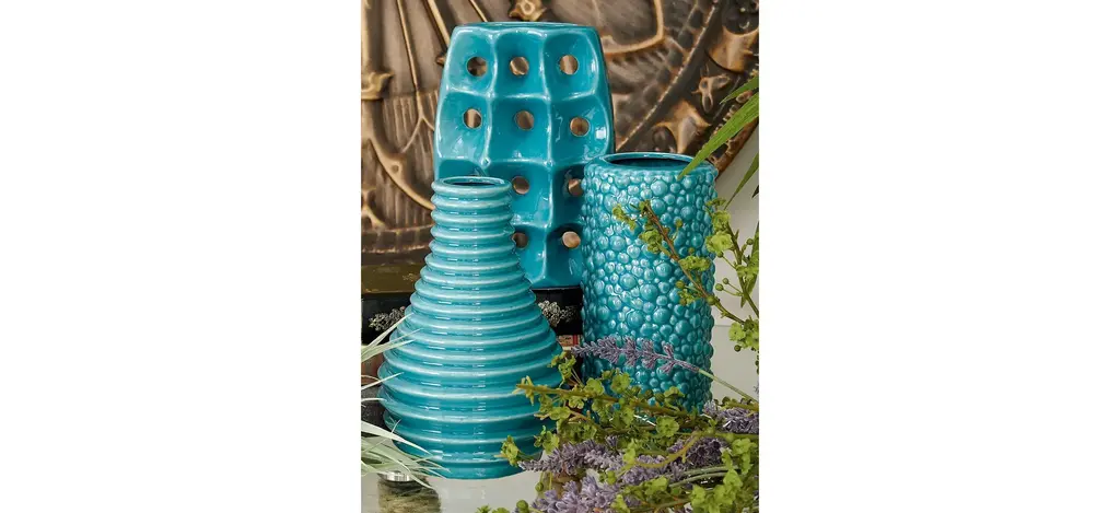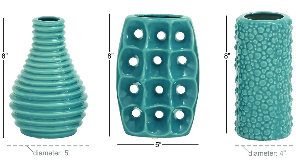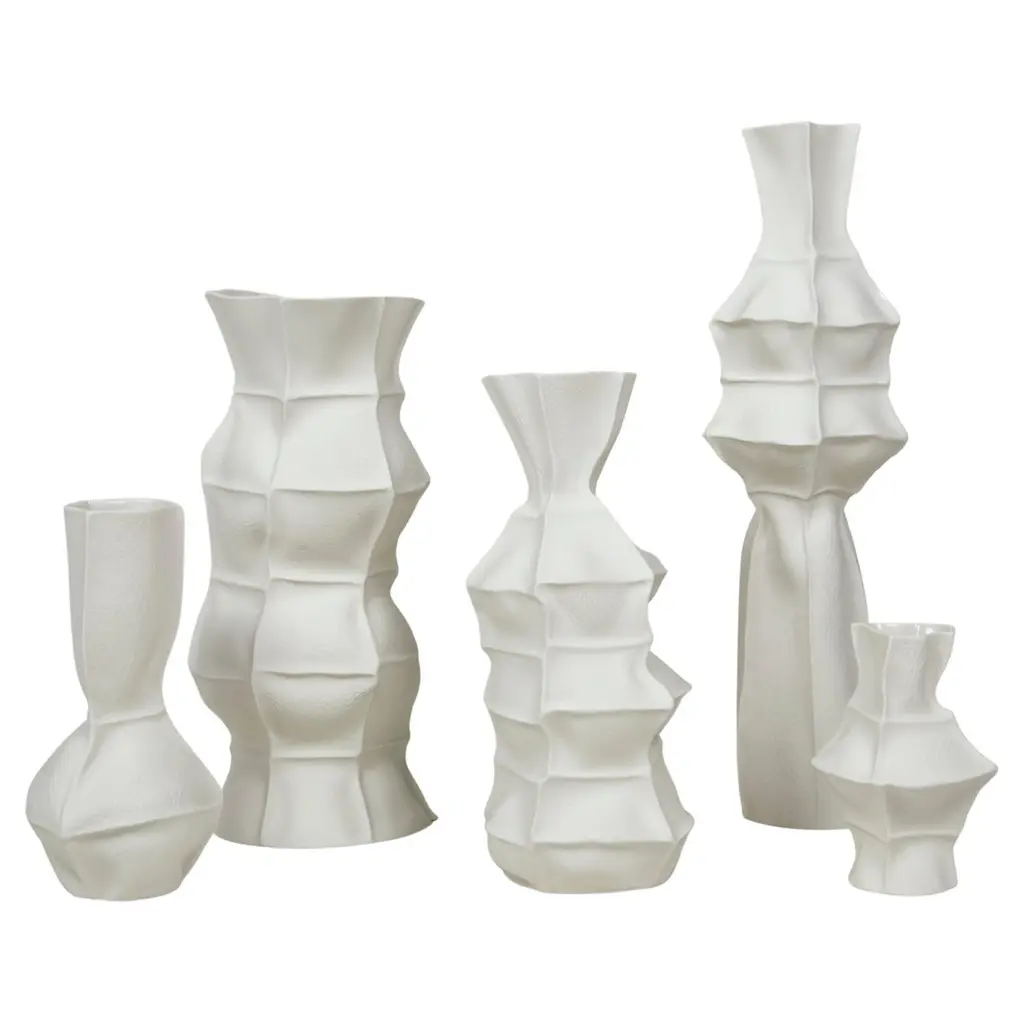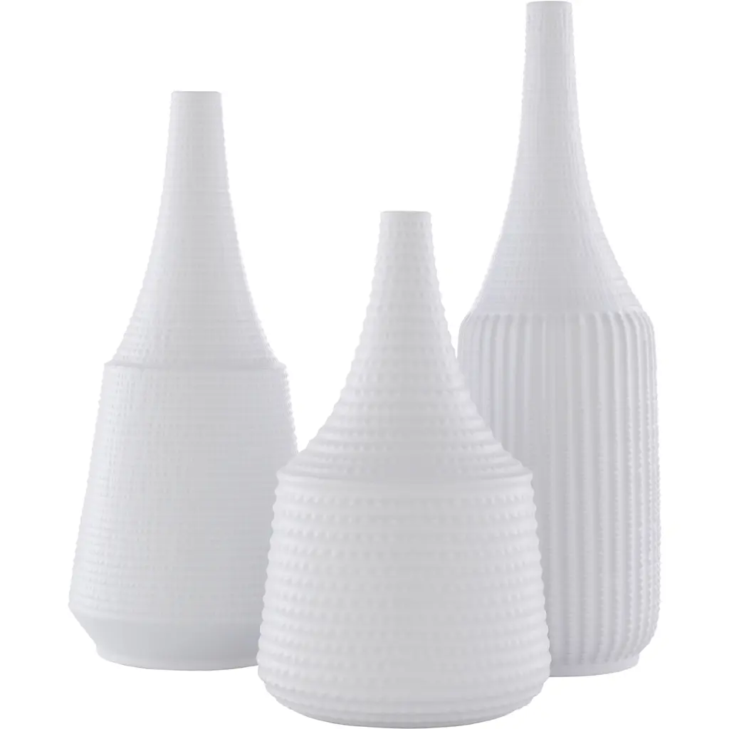 The Ivy Collection Concepts Set of 3 has a glossy alabaster white finish and symmetrical heights to display as a set seamlessly. The bold, modern textures include an uneven knobby texture around the cylindrical vase, a horizontal ridged texture around the gourd vase, and a super-unique pierced hole grid vase that holds a single stem in each of the two vertical spaces. Both fun and sophisticated, this modern art vase set looks especially dynamic against a solid-colored wall, bringing bold shapes and textures to your space. Designed with black rubber stoppers at the base that prevent scratching furniture and table tops, as well as sliding around.