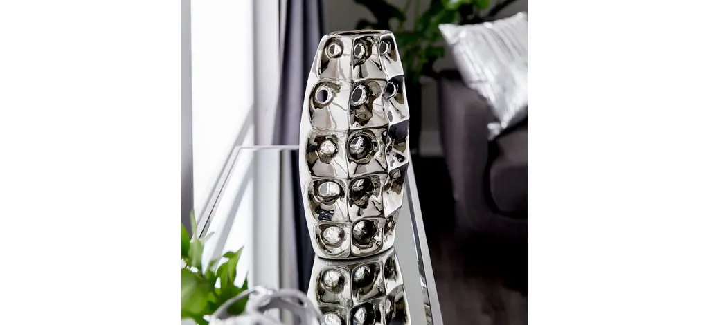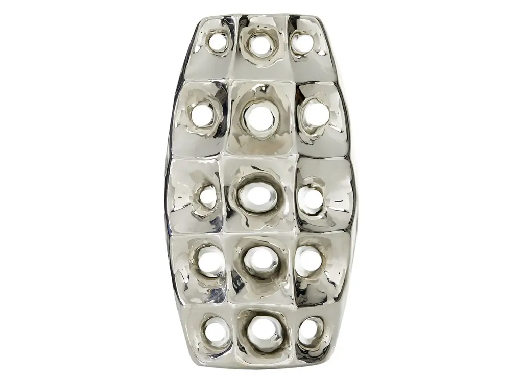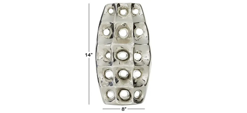 The Ivy Collection Donut Vase is a unique vase with rounded rectangular shape from the front and narrow width from the sides. Let your eyes play tricks on you with the 15 punched-out holes in a grid pattern for a geometric artistic look. But the opening at the top allows for up to 2 single stem faux flowers or vase filler to stay propped up in the center. Designed with rubber stoppers at the base that prevent scratching furniture and table tops, as well as sliding around.