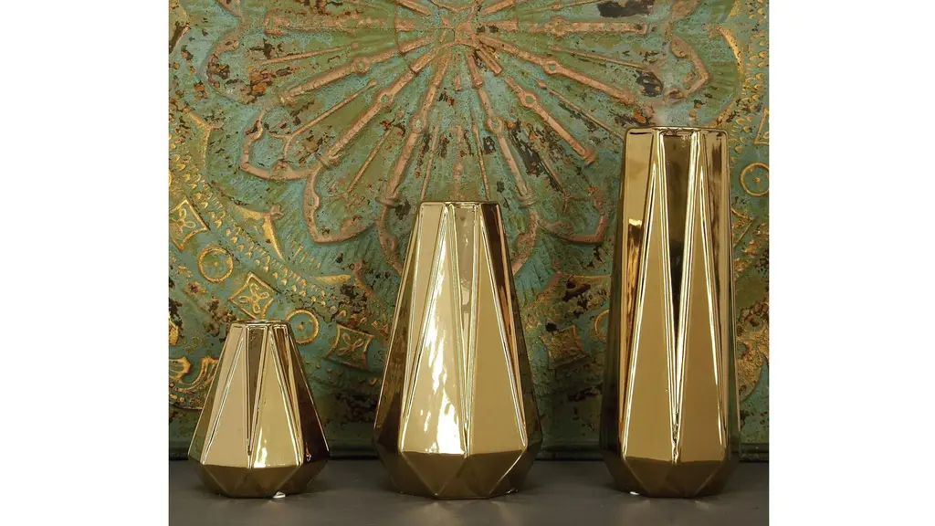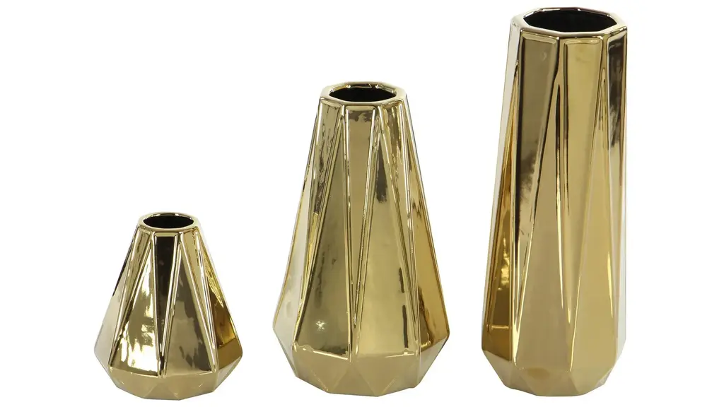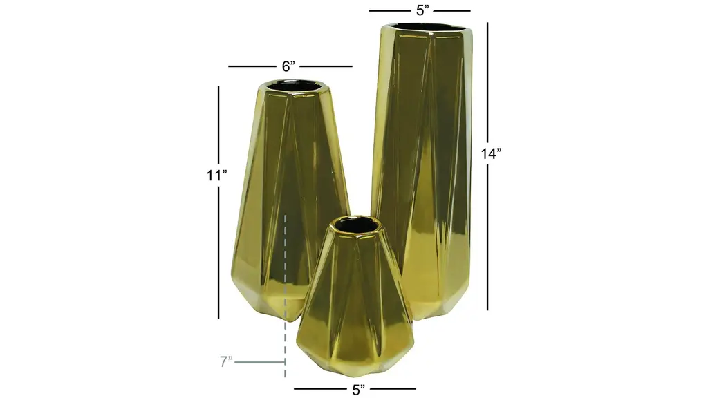 Enjoy the finest gold luxury with this Ivy Collection Gold Ceramic Glam Vase Set of 3. These vases feature a unique geometric exterior that adds a fancy taste to the set. These vases feature a polished gold finish on ceramic material. These vases look good together in any order. Display them in your glam inspired space on top of tables or surfaces together with other similar decor and witness the power of gold as it takes over the spotlight. Designed with rubber stoppers at the base that prevent scratching furniture and table tops, as well as sliding around.
