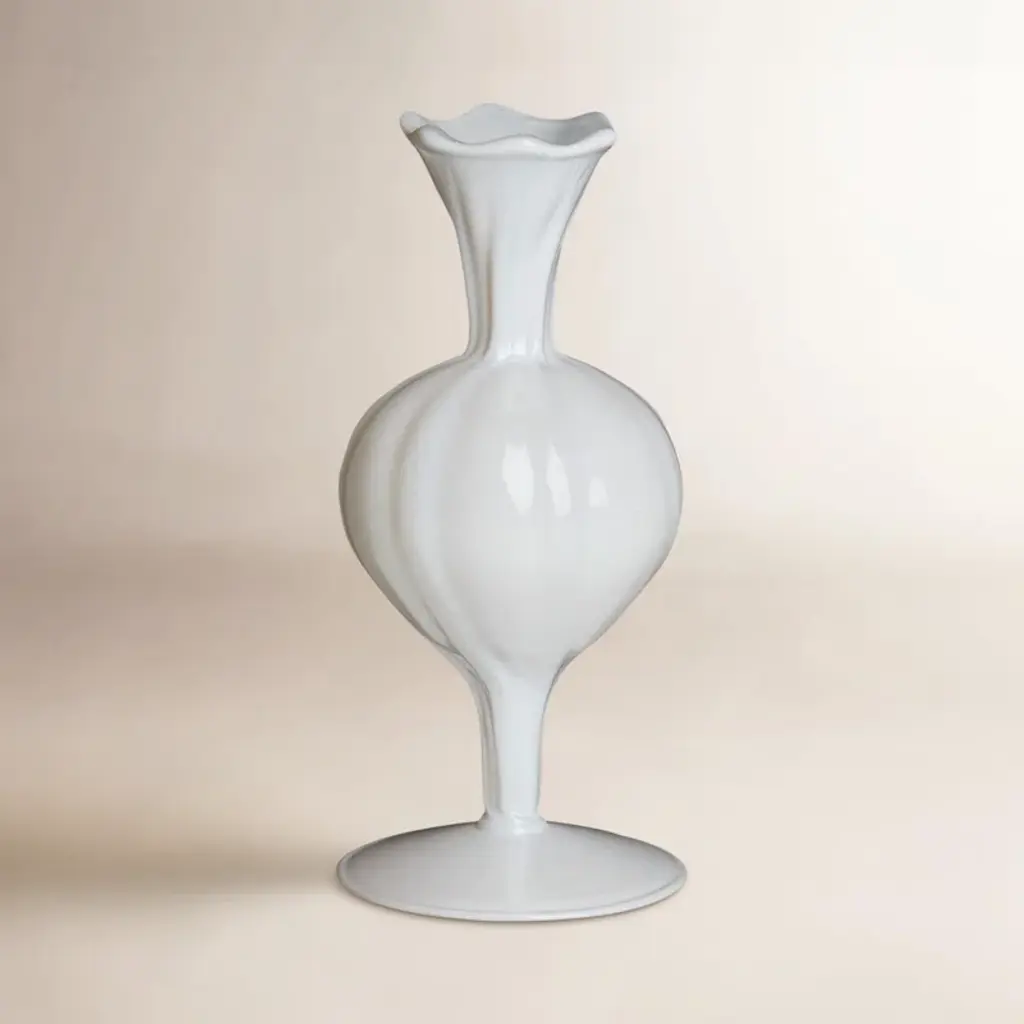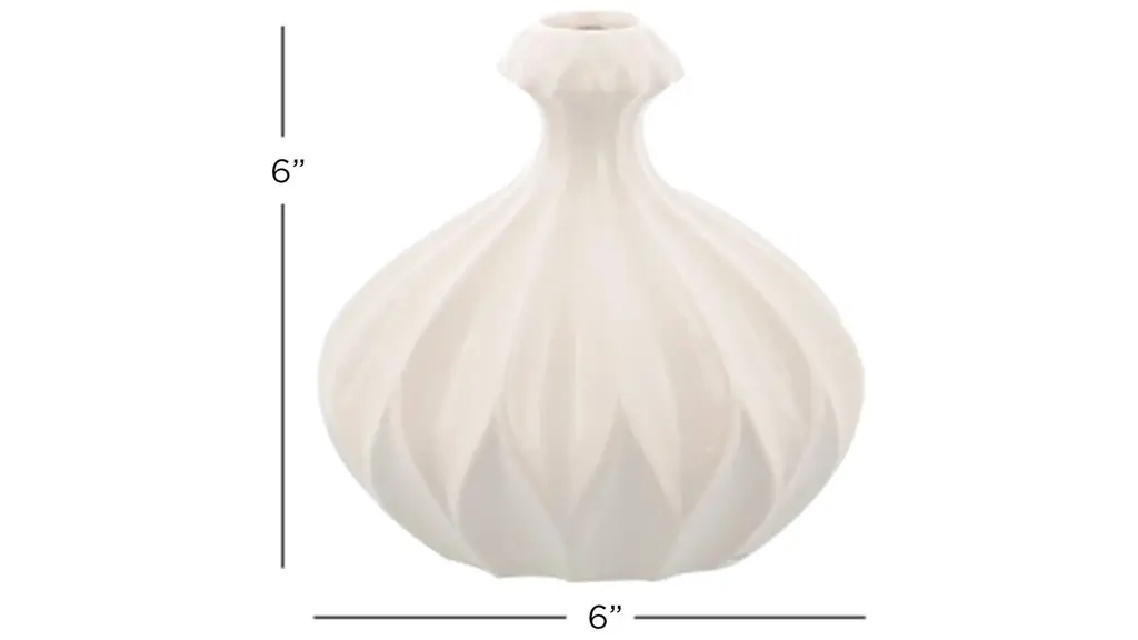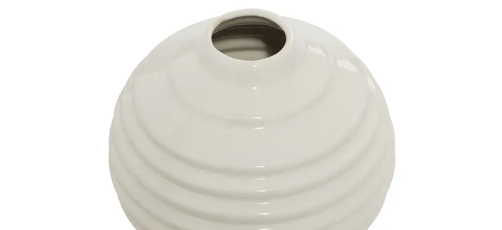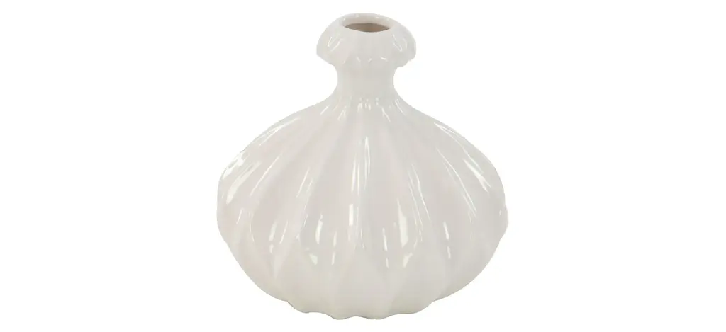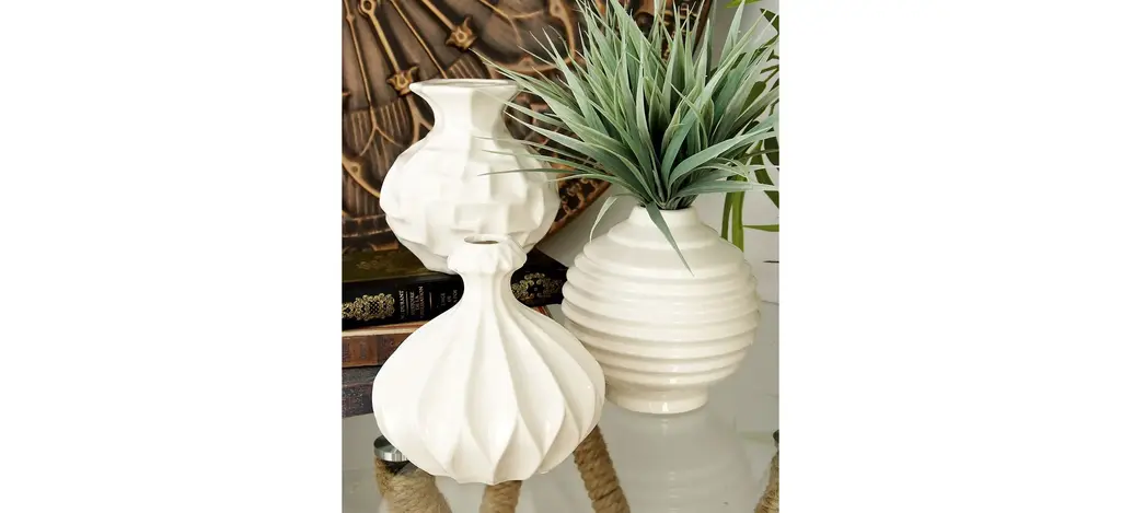 Ivy Collection Ultimate Vase Set of 3 adds a bright pop of light and unique modern shapes to your tables or shelves. The solid stoneware vases are each glazed with glossy soft white glaze for modern monochrome looks. All uniform in size, features gourd-shaped with a narrow neck and opening, round with a small no-lip opening and horizontal lines formed by using a tool on the potter's wheel to make angular indentations, and a round vase with a wide fluted mouth and square relief patterns. Designed with black rubber stoppers at the base that prevent scratching furniture and table tops, as well as sliding around.