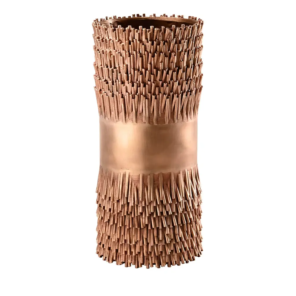 Jack fruit is a numbered vases edition, an object that for its exclusivity completes every environment with its strong sculptural presence.The vases are available in two different finishes.The first is a single block of hand casted bronze. (CB501PB104)The second mixes two materials, brass and wood, and is divided into three sections: the upper and lower are composed of an articulated brass casting, the central part is in wood. (CB501BW104)Both are presented as absolute protagonists of the living.