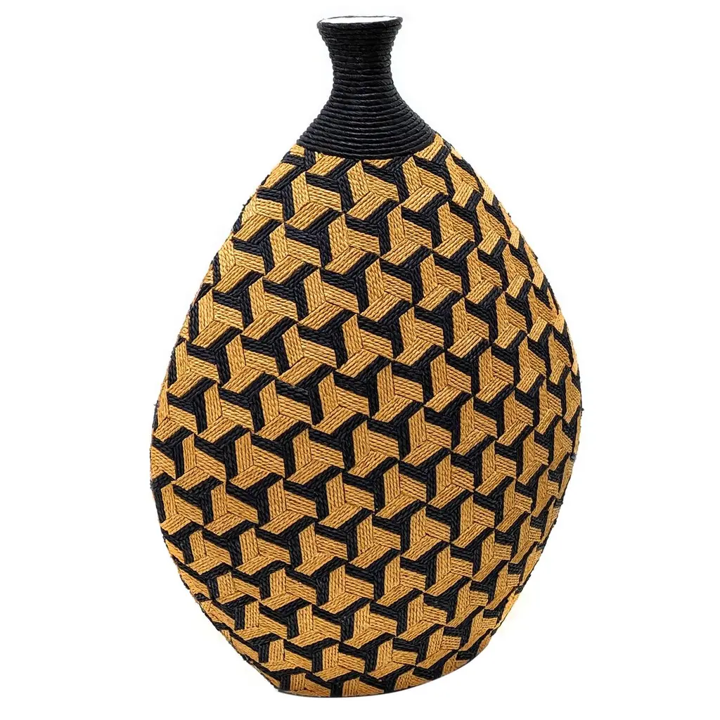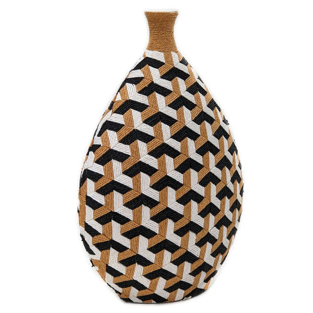 Introducing the Jahia Decorative Vase, a masterpiece of meticulous craftsmanship available in either a bold geometric or an avant-garde Cubism pattern, where each roped tile is hand-placed with precision, demanding hours of dedicated effort. Its distinctive shape, crowned with a delicate, small neck, is perfectly designed to hold minimalist branches, transforming a simple arrangement into a striking display. This decor vase is not just a vessel but a piece of art, ready to elevate the charm of your home. It is ideal for styling your next selfie with a touch of bold uniqueness.