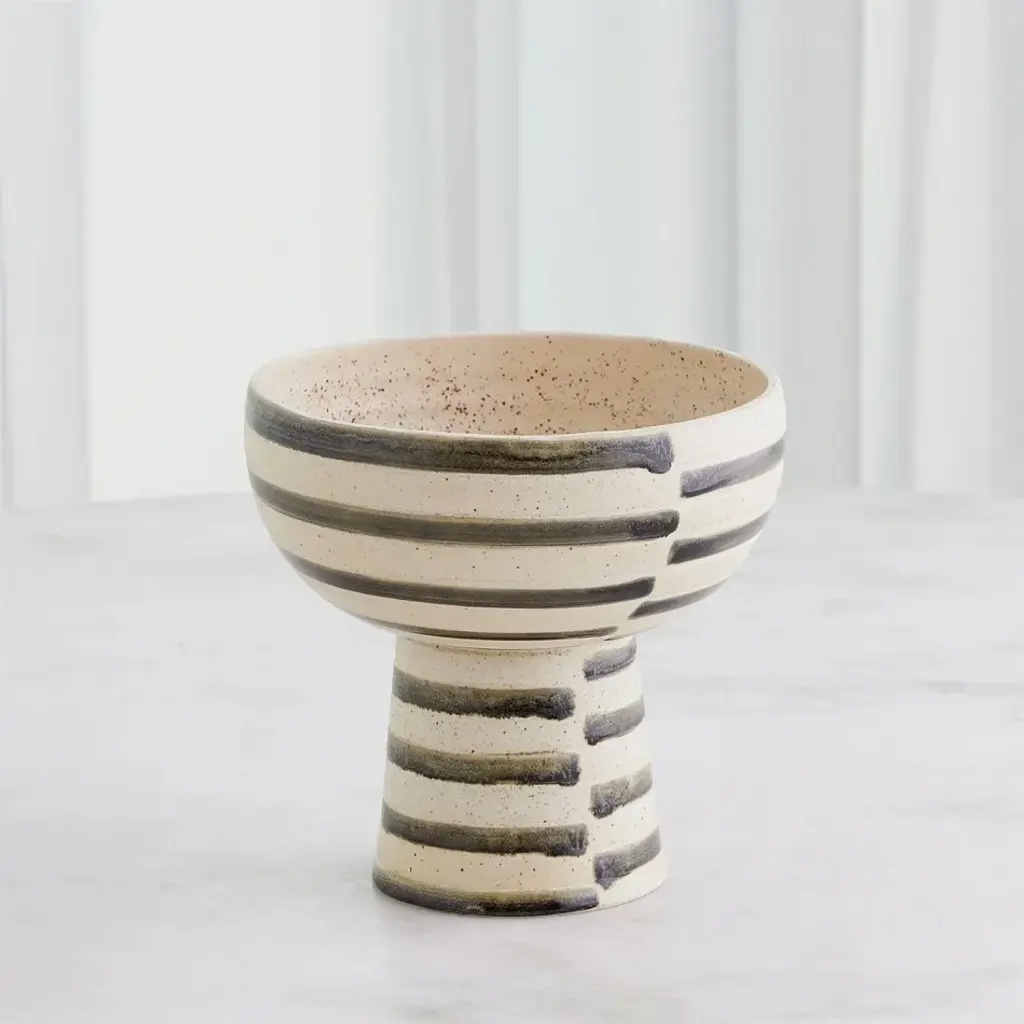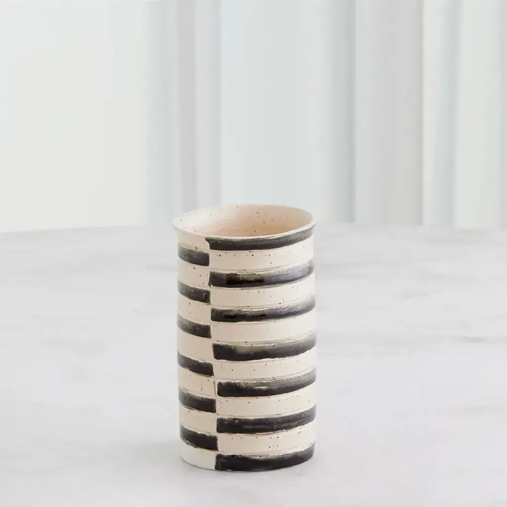 The Jail Break Vases and Bowl are beautifully crafted from ivory Portuguese slip-molded ceramic. The hand-painted black stripes evoke a sense of boldness and individuality, making them a standout addition to your decor. From a fashion forward perspective, Global Views offers accessories, furniture, statement lighting, and an assortment of rugs and mirrors to add beauty and joy to your home.