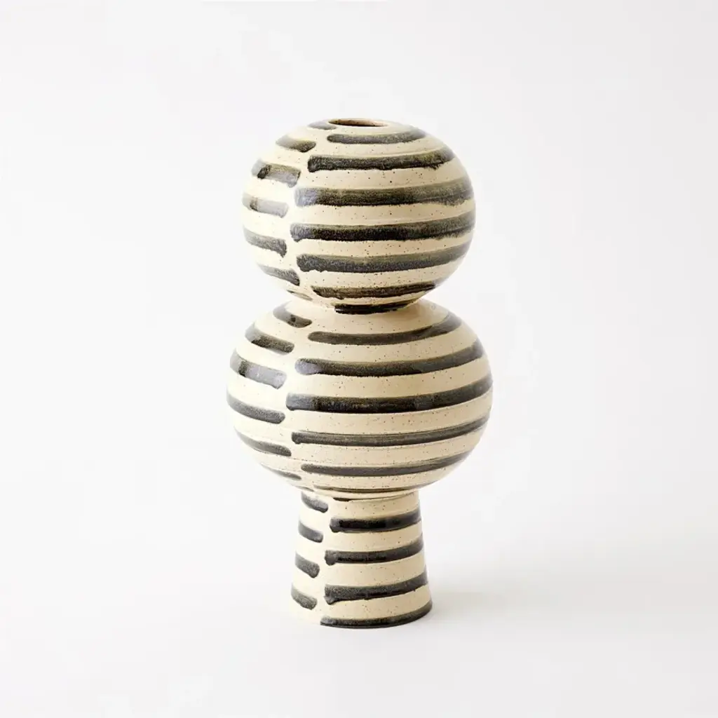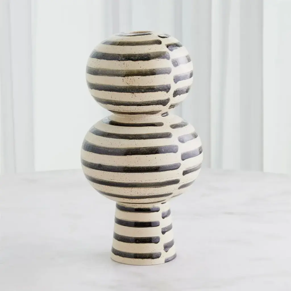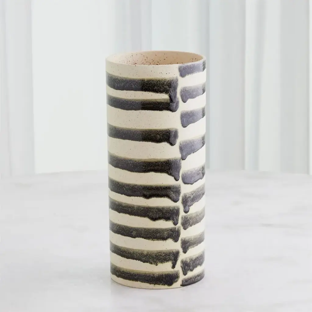The Jail Break Vases and Bowl are beautifully crafted from ivory Portuguese slip-molded ceramic. The hand-painted black stripes evoke a sense of boldness and individuality, making them a standout addition to your decor. From a fashion forward perspective, Global Views offers accessories, furniture, statement lighting, and an assortment of rugs and mirrors to add beauty and joy to your home.