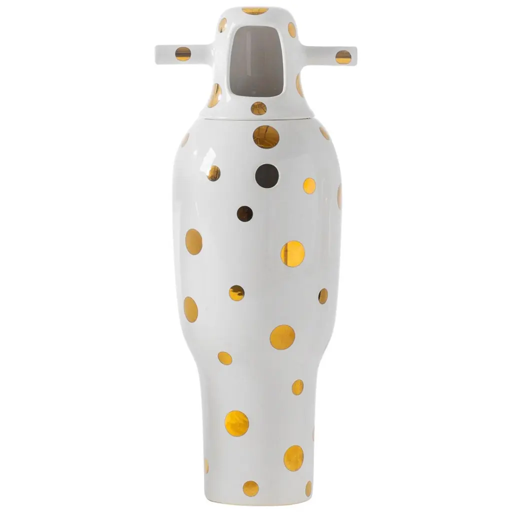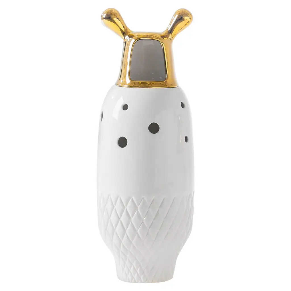 Contemporary showtime 10 vase number 2 by Jaime Hayon.Manufactured by BD Barcelona (Spain).Made up of two pieces in glazed stoneware, with a white finish and 24-carat gold-plated decorations.Measures: height 34 cm x diameter 13 cm.