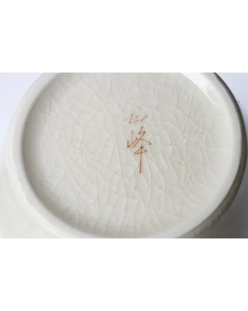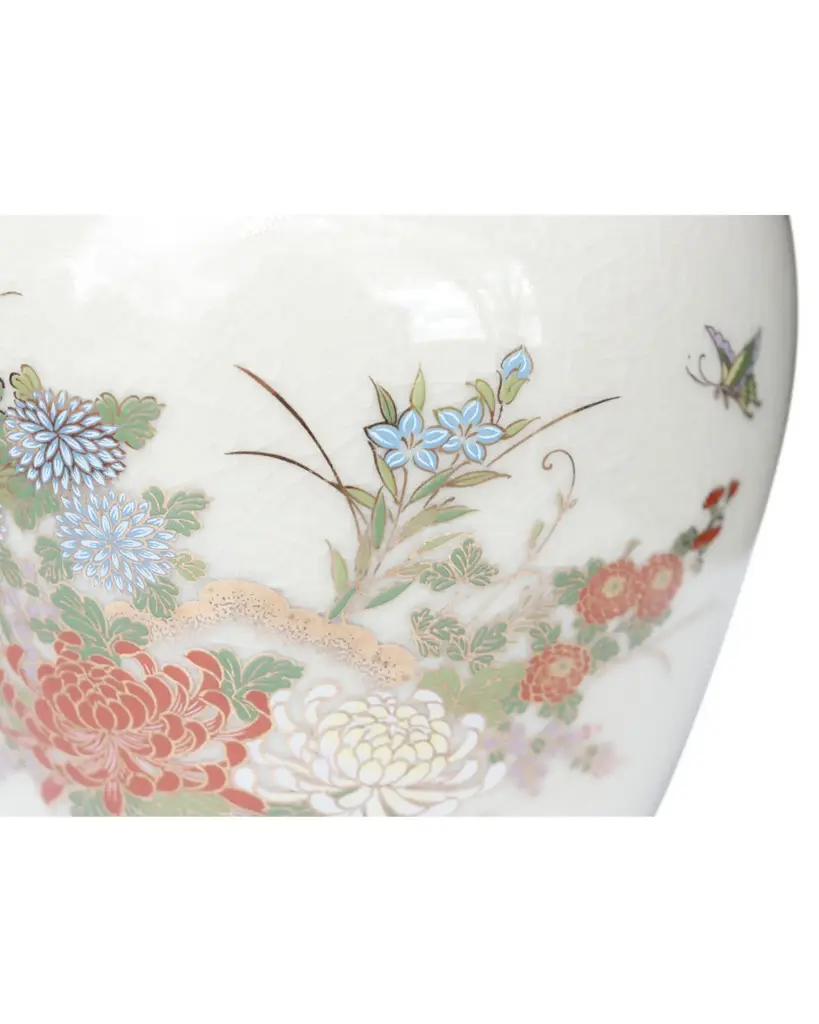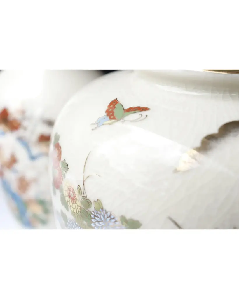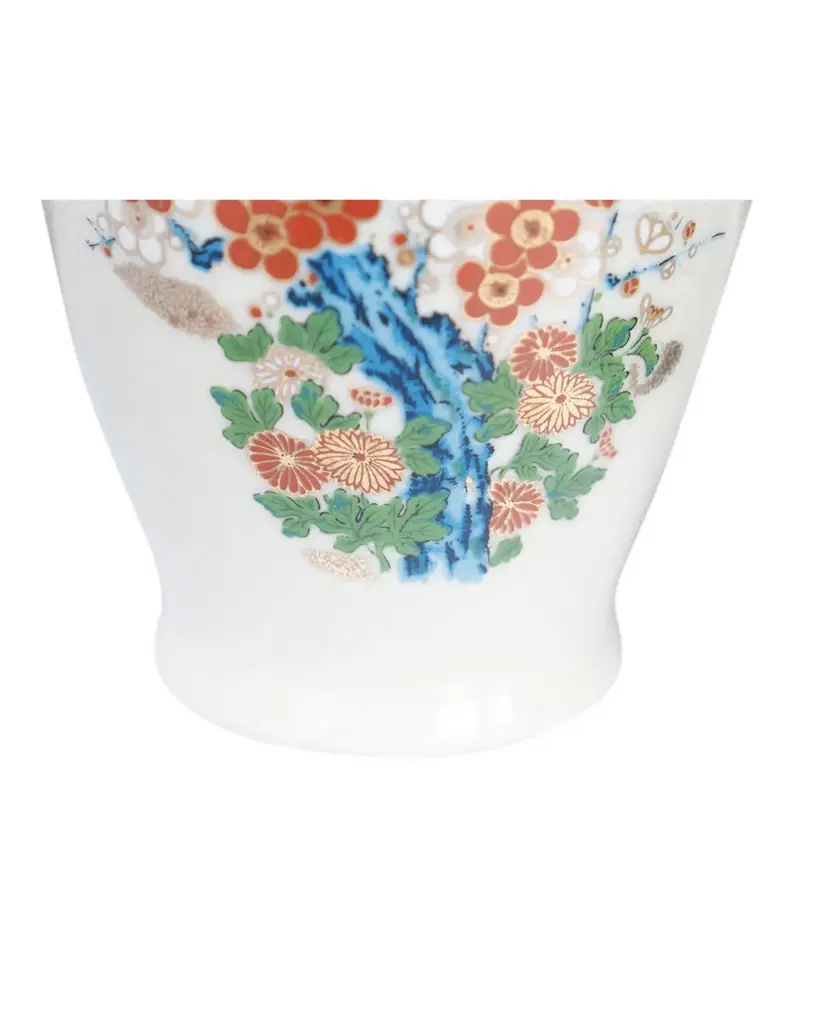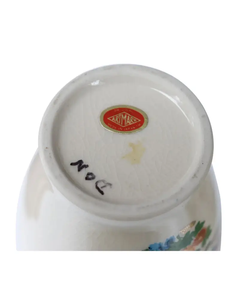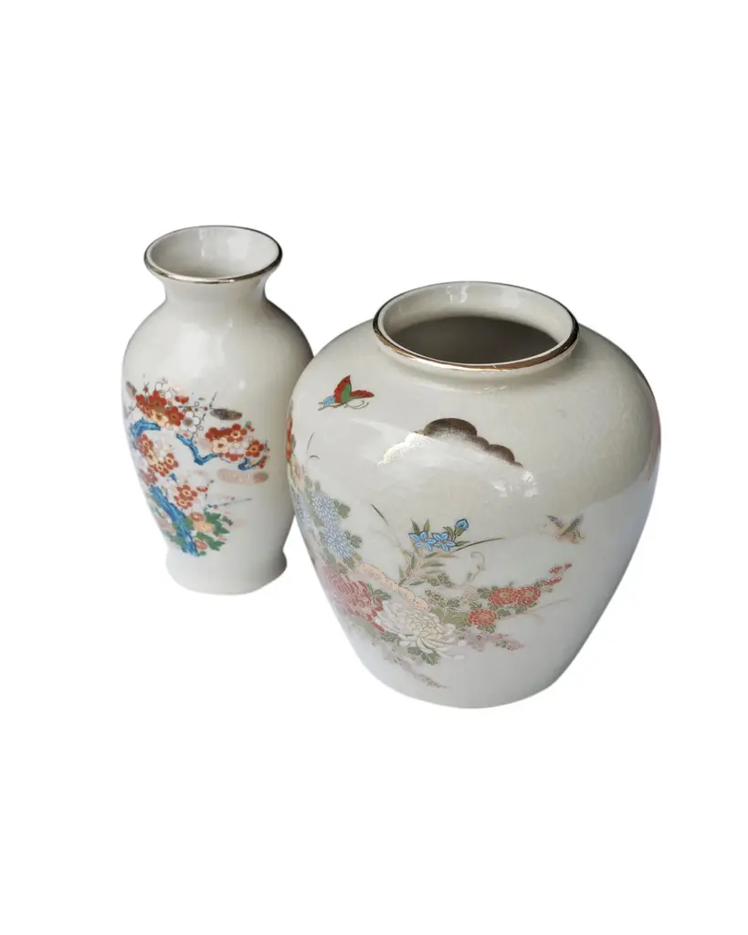A pair of Japanese Imari style vases. White porcelain with a craquelure glaze is hand painted with beautiful bold florals in red, blue and gold. One is signed underneath, the other is marked Art Mark. Large vase measures 5.5"W x 5.5"D x 6"H, smaller vase measures 3"W x 3"D x 6"H.