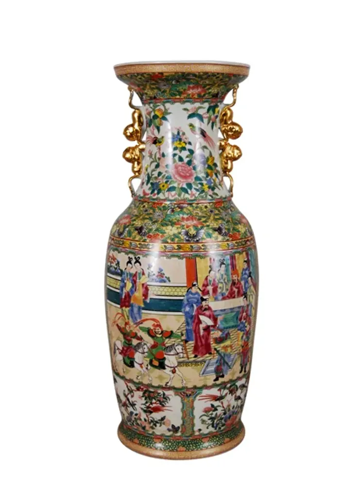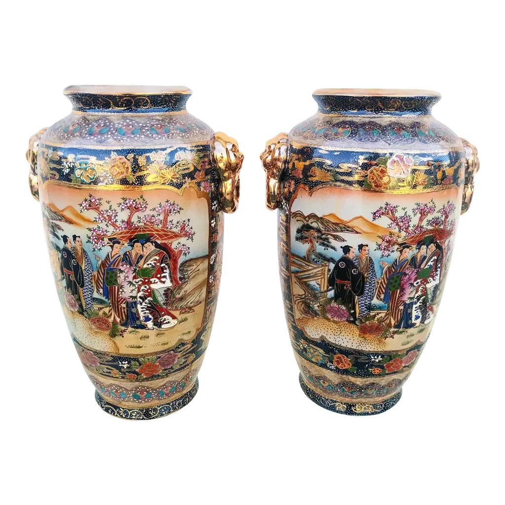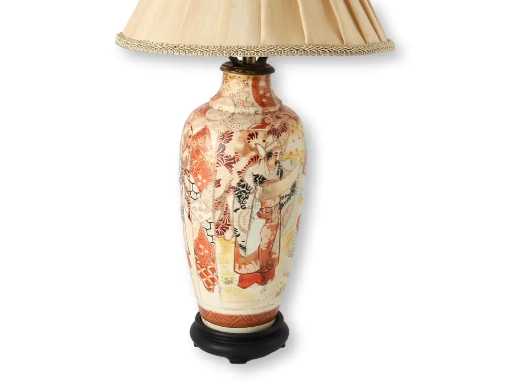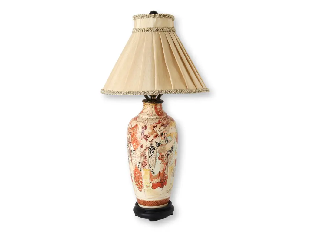 Discover the exquisite charm of our Vintage Satsuma Vase Lamp. Handcrafted with intricate details, this elegant piece combines timeless beauty with functional lighting. The delicate Satsuma porcelain, adorned with vibrant hand-painted motifs, creates a captivating centerpiece. Illuminate your space with a touch of vintage sophistication. Completely rewired with best quality components. Shade included. Height is 22" with shade/15.25" without.