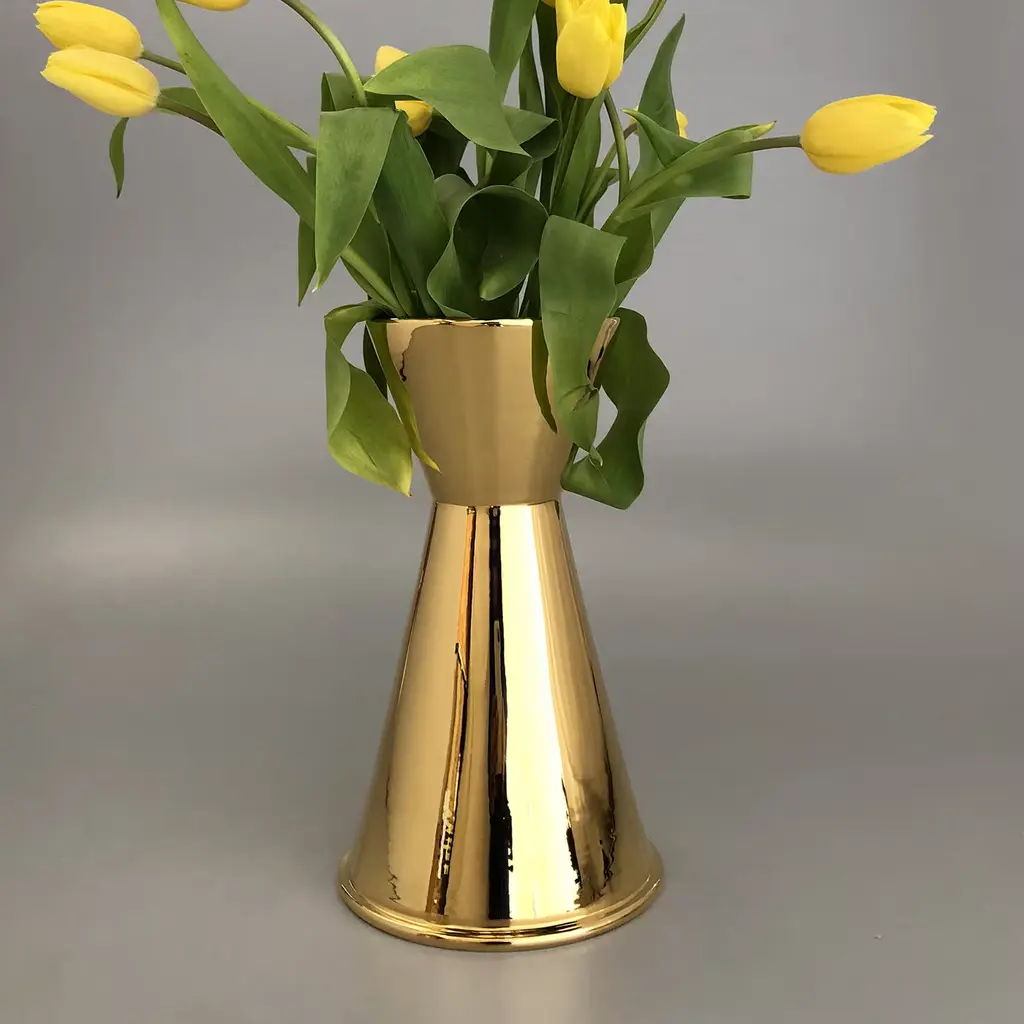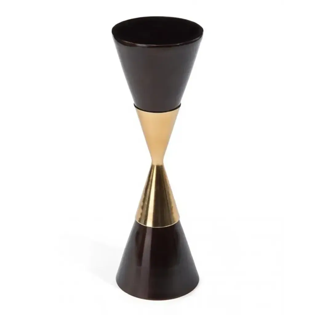 Inspired by the essential barware tool, the Jigger Misture Gold Terracotta Flower Vase sets a playful tone in a minimalist home bar area. Hand-spun in white terracotta, the vase is coated in white enamel and gold with a soft brush before being fired for the last time. A variety of jigger-inspired vases are also available.