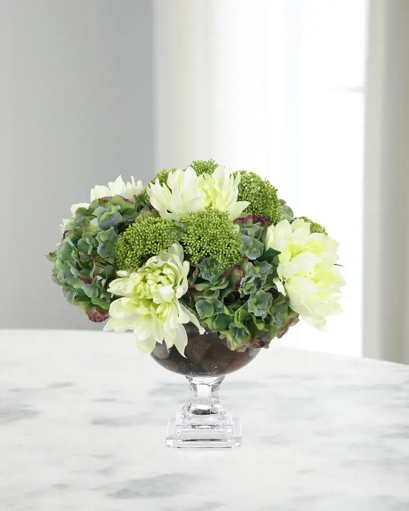 Vibrant green hydrangeas are accented with seed bush and simply contained in a glass vase and set in acrylic water. Handcrafted of polypropylene, rayon/cellulose acetate, and glass Approx. 18"Dia. x 16"T Item weight, 9.0 lbs. For indoor use Wipe clean Made in USA from imported materials Proposition 65 warning for California residents Backed by a limited manufacturer’s warranty. ( Click here for warranty information ) About the John-Richard Collection Founded in 1980 in Greenwood, Mississippi, the John-Richard Collection is known for a strong design staff that travels the world for inspiration. Channeling cultural and historical influences, the company creates distinctive artisan-crafted furniture, lighting, wall art, mirrors, and decorative accessories that make a lasting impression. What's more, an eye for future trends in luxury home furnishing sets the John-Richard Collection apart. They skillfully blend the best of what is new in home fashion with the great designs of the past, resulting in updated designs that fit perfectly with an array of styles.