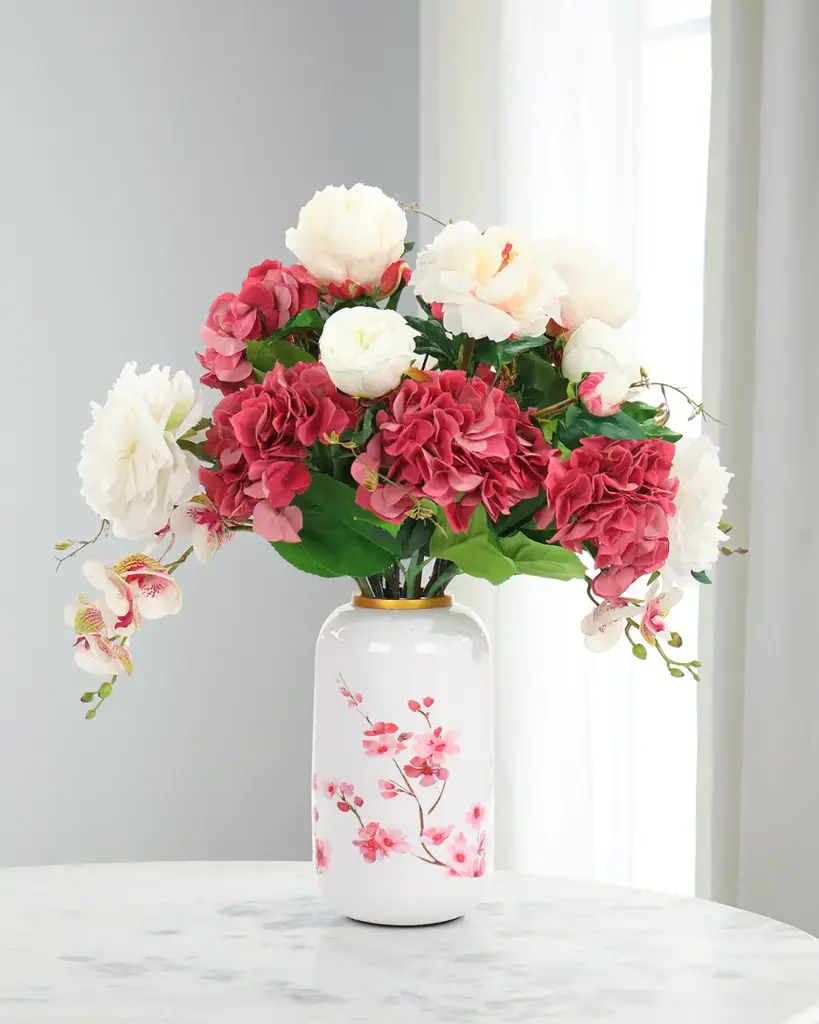 Wispy Mauve features a stunning arrangement of hydrangeas, garden roses, peonies, and orchids contained within a gorgeous vase with pink florals, faux water, and naturally toned reindeer moss. Faux florals are handcrafted polypropylene and ProViscose® rayon Galvanized metal vase with a heavily enameled finish Overall, approx. 24"W x 22"D x 25"T Item Weight (Lbs.): 7.0 Wipe clean Made in USA Proposition 65 warning for California residents Backed by a limited manufacturer’s warranty. ( Click here for warranty information ) About the John-Richard Collection Founded in 1980 in Greenwood, Mississippi, the John-Richard Collection is known for a strong design staff that travels the world for inspiration. Channeling cultural and historical influences, the company creates distinctive artisan-crafted furniture, lighting, wall art, mirrors, and decorative accessories that make a lasting impression. What's more, an eye for future trends in luxury home furnishing sets the John-Richard Collection apart. They skillfully blend the best of what is new in home fashion with the great designs of the past, resulting in updated designs that fit perfectly with an array of styles.