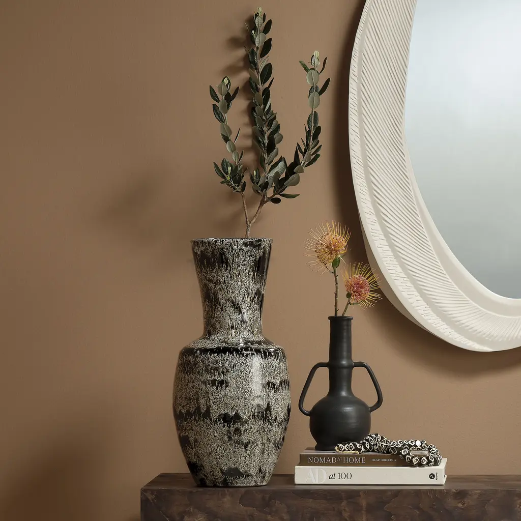Vibrant patterns in a neutral palette that enhance, not overwhelm, elevate this ceramic vase. Water-safe, it can be customized with your choice of filler or grouped with similarly hued items for a stunning display. Due to the handmade nature of this piece, variations in finish, pattern & shape will occur. No two will be alike.