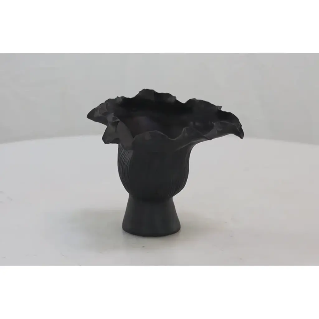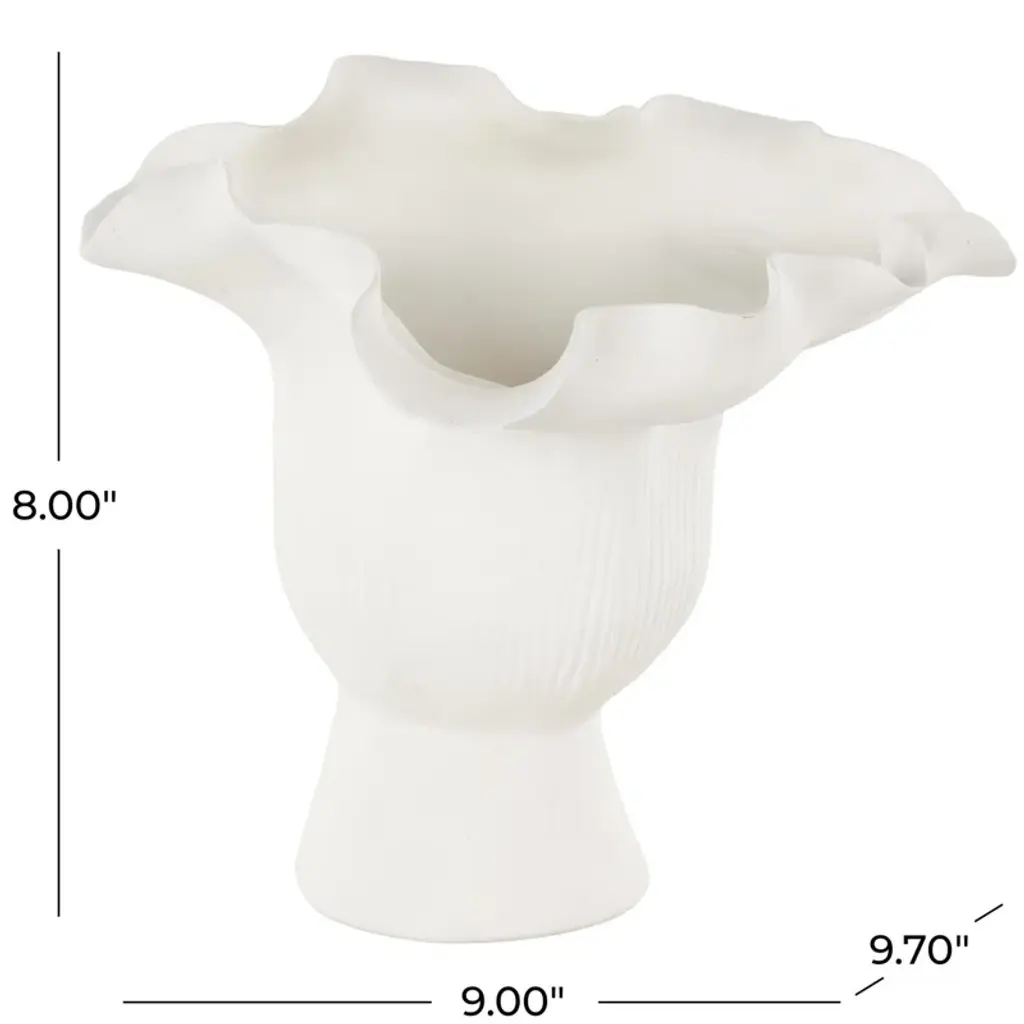 Artful elegance. Our ceramic floral-inspired vase boasts a modern design with a touch of organic charm. The cylinder shape features linear grooves, while the wavy, petal-like edges add visual interest. Its solid white hue complements various decor styles, making it a versatile statement piece for living rooms or offices. Felt or rubber stoppers at the base prevent scratches and sliding. This contemporary vase is a thoughtful gift for any occasion.