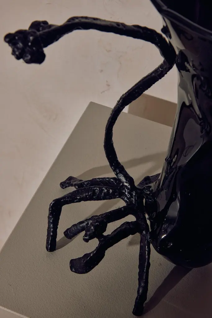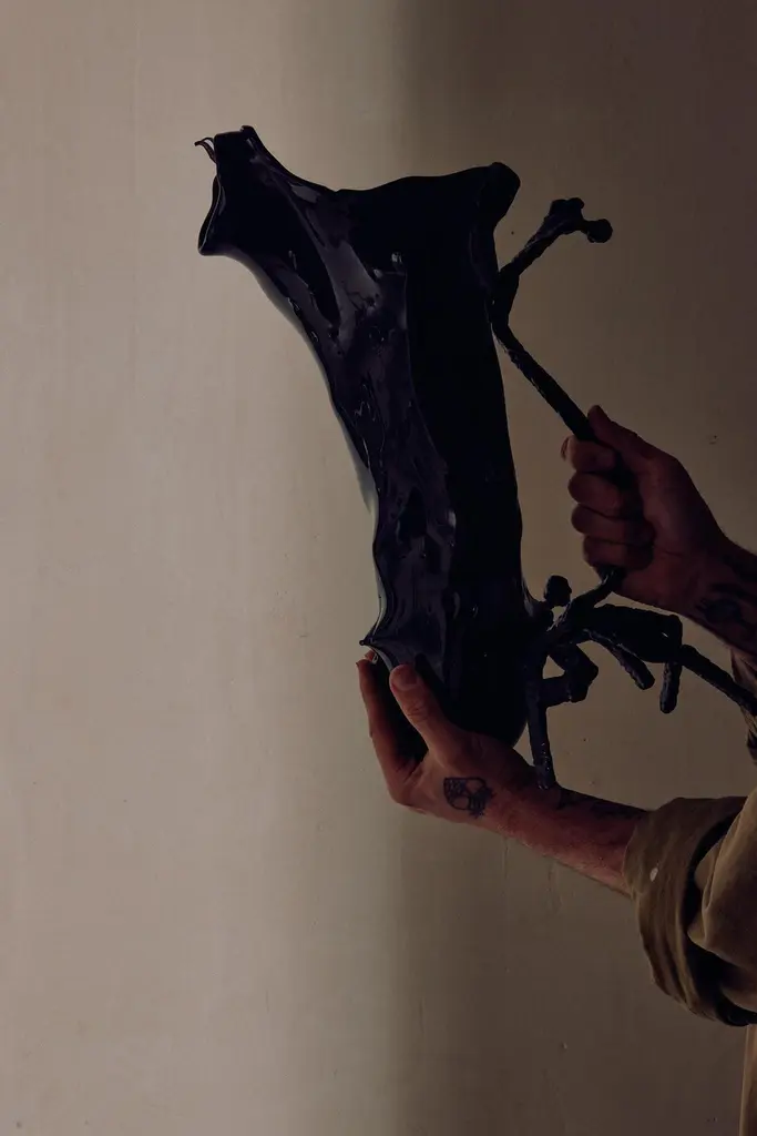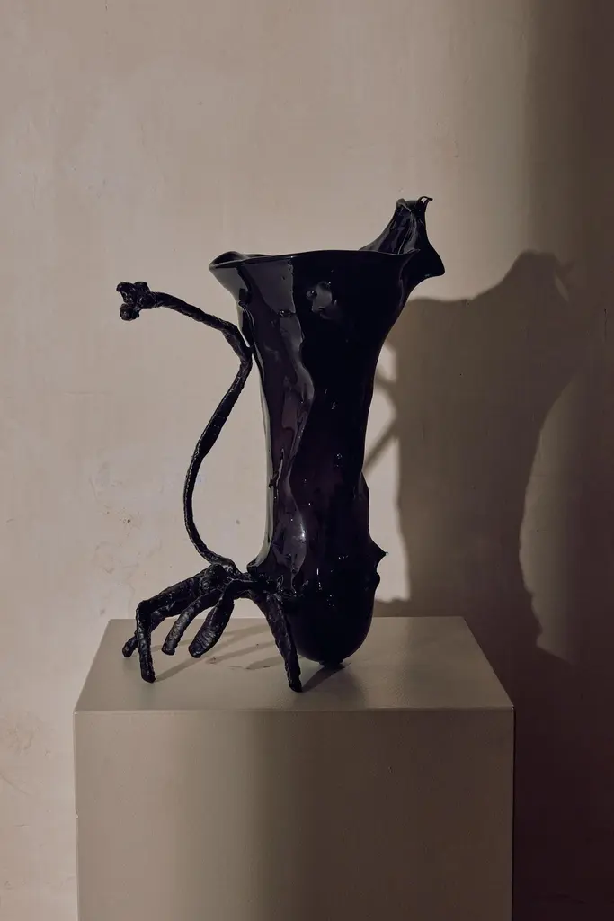 Jug for water vase by Michael GittingsDimensions: D 36 x W 36 x H 46 cm.Materials: Stainless steel, glass.Michael GittingsMichael Gittings imagines with his hands. Since establishing his studio in 2016, the Melbourne based designer and sculptor has built an impressive practice,producing a vast array of curious and covetable objects. With work featured in Sydney Design Week 2022 and an upcoming solo exhibition at Oigåll Projects in Melbourne, Gittings is excitedly (and busily) preparing to share his talent and craft with new audiences. I recently sat down with Gittings to discuss his recent work and broader creative process. There was the sense of someone quietly buzzing with productivity and ideas, thrilled to be making and exploring new techniques. Whether it be envisioning a new collection of kink inspired polished metal objects, or tweaking a pair of heat-proof gloves to interact more intimately and gesturally with blown glass (a new material obsession). Playful, speculative and down-to-earth, Gittings conveyed the impression of a designer hitting their stride, propelled by curiosity and a wealth of gathered experience. After the last two years of restrictions, Gittings says “it kind of feels like the start”. Originally crafting more classic furniture shapes in his signature metalwork, Gittings’ creations have become increasingly marked by organic abstraction, subversion and evolution. This intertwines with Gittings’ process of making – one that is extremely intuitive and guided by experimentation. Aside from the deep technical traditions he engages with, there is an openness to the possibilities and whims of the materials themselves; as if they are living, feeling substances. According to Gittings, it wasn’t always destined to be furniture or sculpture. “I originally wanted to make guitars” he admits with a smile. “But then I quickly worked out I can’t do that, because there’s certain... limitations. Like a guitar or violin actually has to sound good [laughs]. Like you can’t just make a shit sounding guitar” he quips. “What I like about furniture, is that there’s a starting place to begin from. There’s still some constraints... but there just feels like all of these possibilities. You can make so many different shapes, textures, weird forms. I don’t necessarily think about it conceptually, I just find it more interesting to play with these things and ideas and see where the work wants to go.”For his solo exhibition at Oigåll Projects, Gittings took a twisting journey down a nocturnal, overgrown path. He relished the opportunity to create somethingunrestricted and unfettered. “When I came to [Andy Kelly and Mitchell Zurek] with the idea for what I wanted to make, they were like just go wild. Which was a relief. I get excited when I start putting a plan together. I wanted that energy and excitement shared, otherwise it’s quashed and crushed. It’s grown massively since it’s conception.” The show, titled ‘when the night ripped a hole through Eden’, is an exploration of organic plant-like shapes and rippling, almost reptilian textures, prompting dystopian narratives and conveying an elegant savageness. They appear almost like Jurassic artifacts, recovered from tar. “It’s heaps darker now than I originally imagined. When I first started thinking about the show, I liked the idea of it existing within a kind of fantasy realm. It was very colourful, there was lots of mirrored surfaces. But that idea just morphed when I discovered how to texture the metal in this specific way, instead of polishing. I also started thinking about panpsychism, the consciousness of plants and animals, a more psychological direction than the last collection I made. I started having weird dreams, which usually happens in the lead up to a show. I’m working constantly and so a symbiosis occurs. There’s a dark violence to them now.”Gittings’ work for ‘Future Ruins’, which exhibited last year at Gallery Sally Dan-Cuthbert in Sydney, also renders scenes of nature taking over, reclaiming andinfiltrating domestic objects and architectural spaces. For the designer, this aesthetic is ultimately a result of the overall design process and discovering how to make new shapes and forms. “My thought processes are aligning with my abilities, so the organic elements are kind of appearing as I work”.