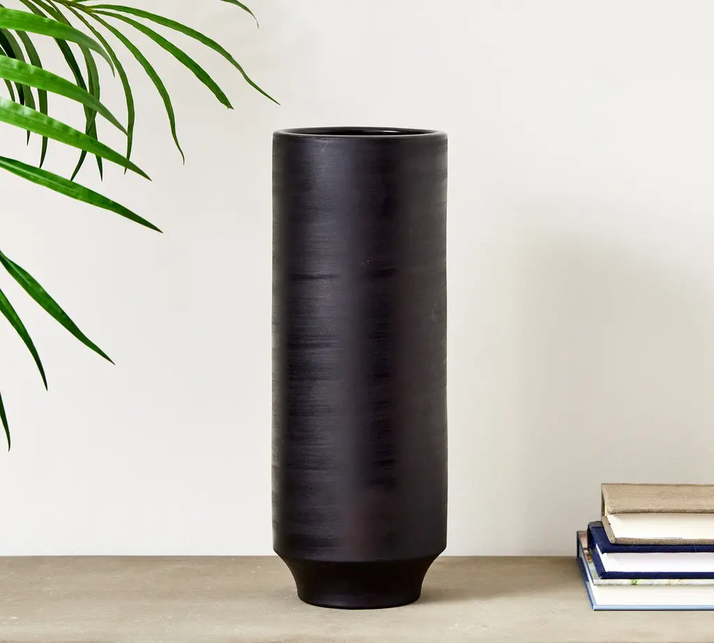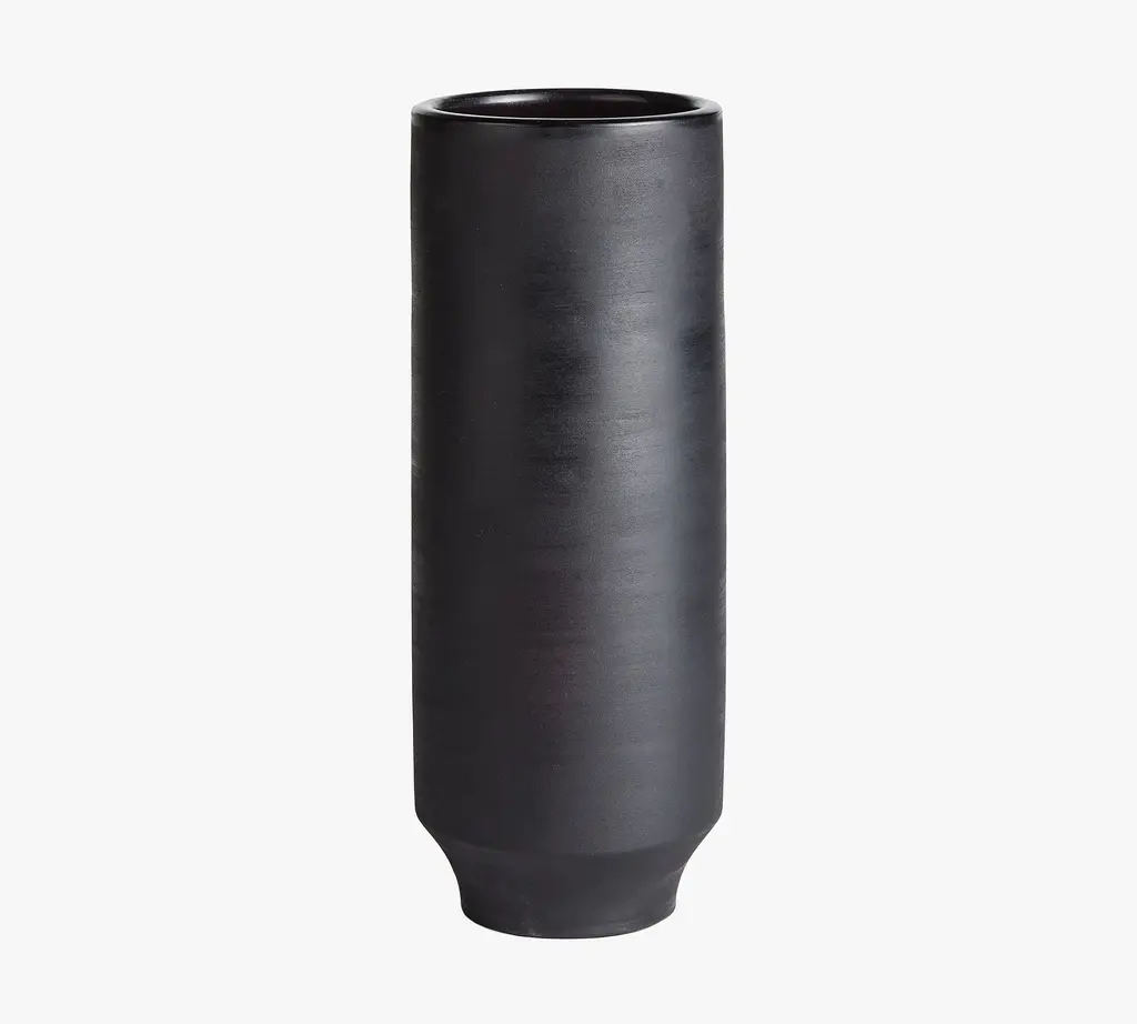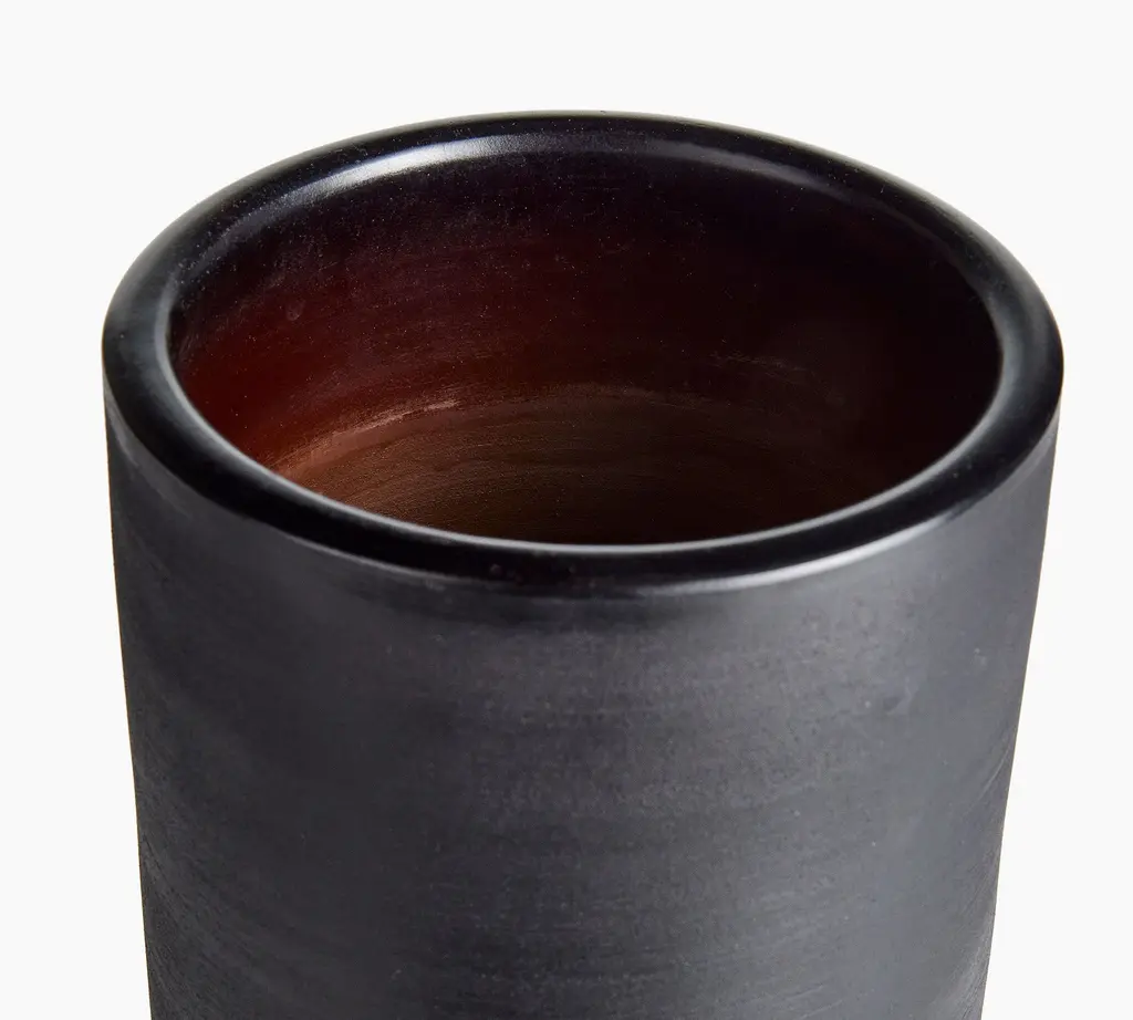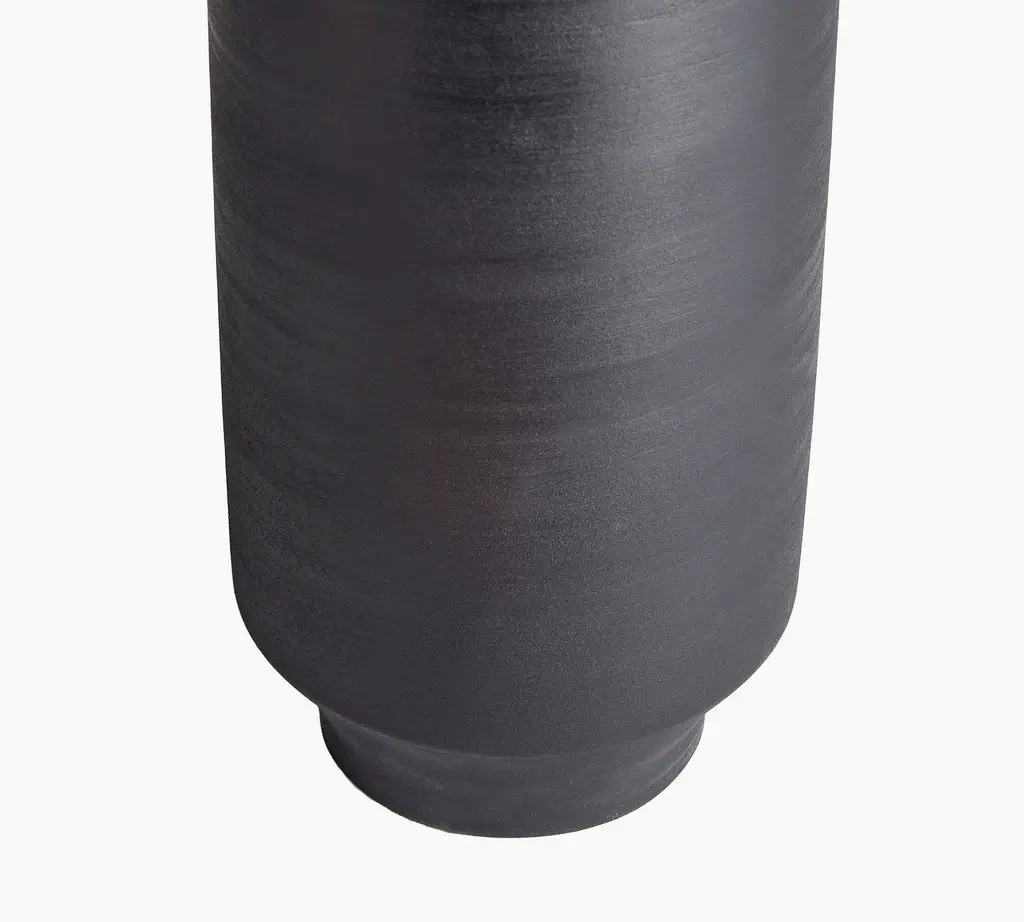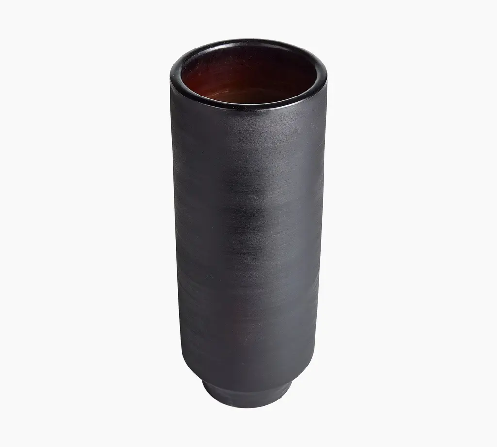 Expertly handmade in Peru, our terracotta vase telegraphs organic, artisanal appeal. Skilled craftsmen fire the clay, then smoke it in mango leaves and buff it with a wire pad to achieve its subtle texture and rich pigment. Perched on a tapered pedestal base, the cylindrical form plays sleek counterpoint to the raw material, lending it an earthy, one-of-a-kind elegance.