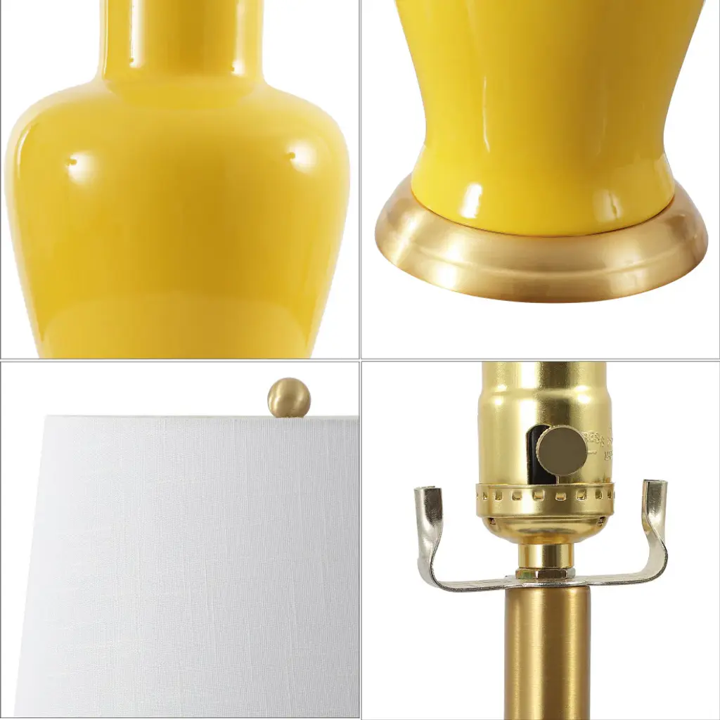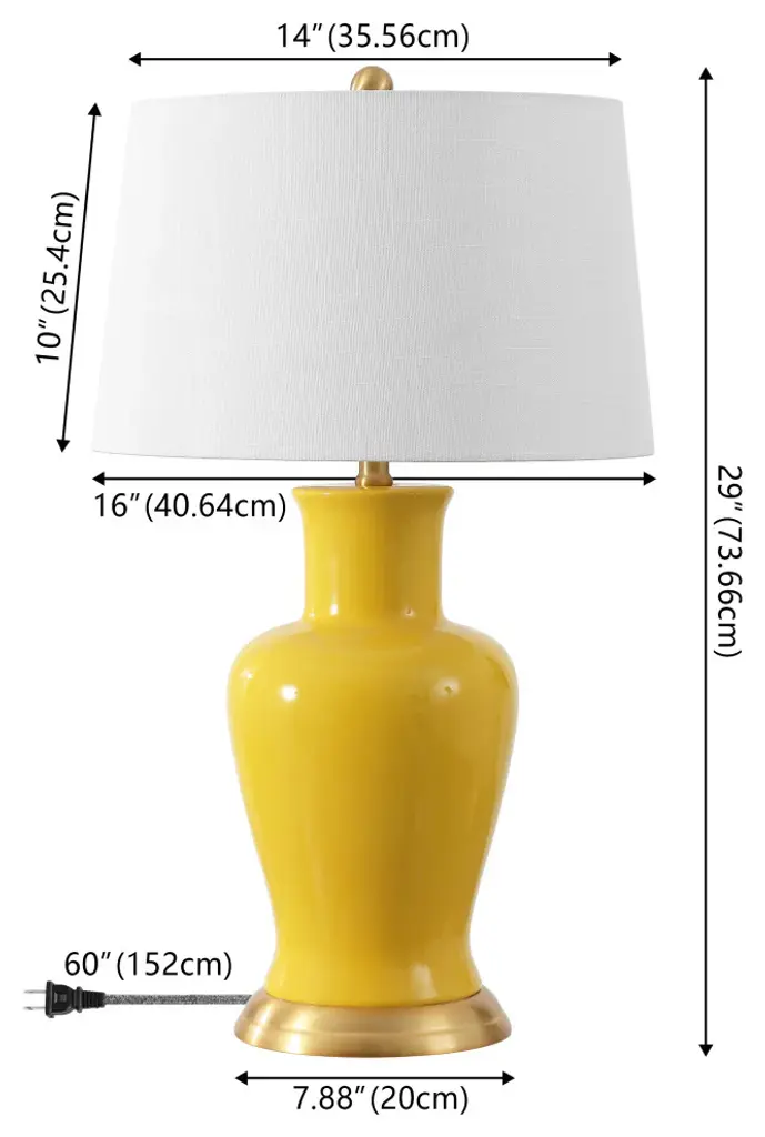 Designed from finial to plus with every element considered for timeless appeal, this lamp''s tasteful urn-inspired profile offers a statuesque ambiance. Ceramic with a glazed finish complements a base made from brushed brass and matching accents. A cotton linen shade with a slightly tapered silhouette offers a soft finish.-Classic in shape, color, and finish, this table lamp is sure to be an instant heirloom-100% linen hardback drum shade-Beautiful to display or easy to conceal: the 60" cord is silk-wrapped-Eco-friendly 9W LED bulb included-Takes 1 bulb and compatible with TYPE "A" 100W or CFL 23W or LED 12W-Color Temperature: 2700K-CRI: 80-Color: Yellow With White Shade-Body Material: Ceramic-Base Material: Iron-Finial Material: Metal-Finial Color: Brass Gold-Harp Color: Gold-Includes: One (1) lamp-Assembly Required-Lamp: 29.00 inches high x 16 inches wide x 16 inches deep-Shade: 10 inches high x 16 inches wide x 16 inches deepYou see a lamp.We see a decorative work of art.A perfectly curved shade casts a dramatic shadow on a floor. A silk cord you never want to hide. Compatible with LED lightbulbs: as easy on the environment as they are on the eyes. The JONATHAN Y Lighting collection considers every detail from impeccably sourced materials to designer styling. And our prices are so attractive, weuve transformed a functional necessity into a fashion accessory.JONATHAN Y Lighting - a fashion revolution in home decor.