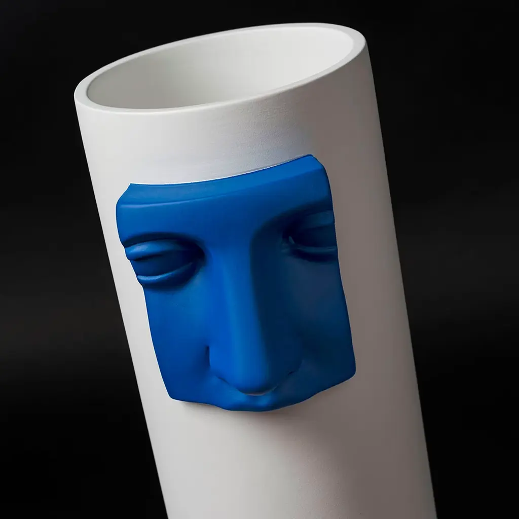 Classic Italian art and modern design stunningly merge in this sophisticated piece: a clean, cylindrical white ceramic vase decorated with a vivid blue insert recreating the nose of timeless, unmistakable representation of Juno as depicted in classical and neo-classical sculpture. This evocative piece will effortlessly infuse a touch of sophistication into both modern and minimalist interiors.