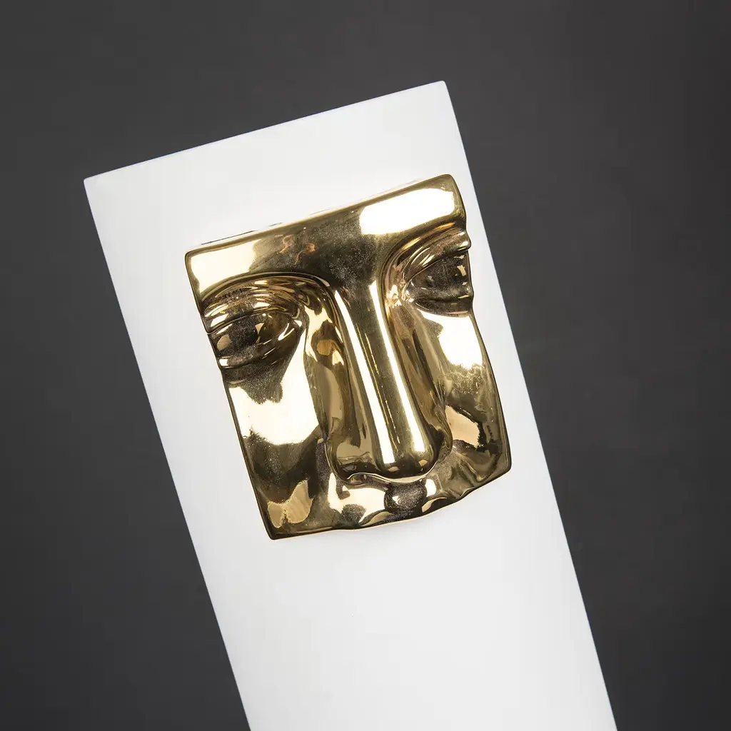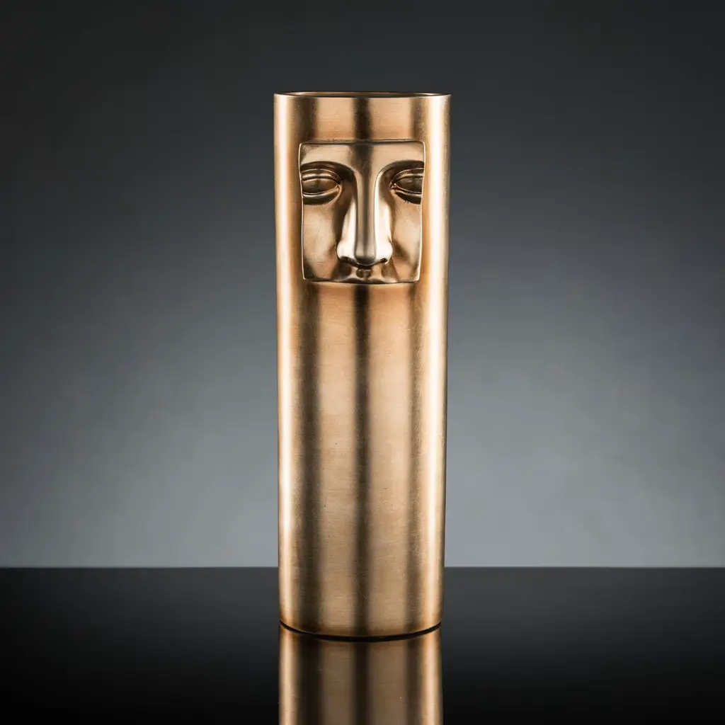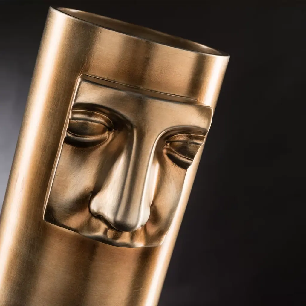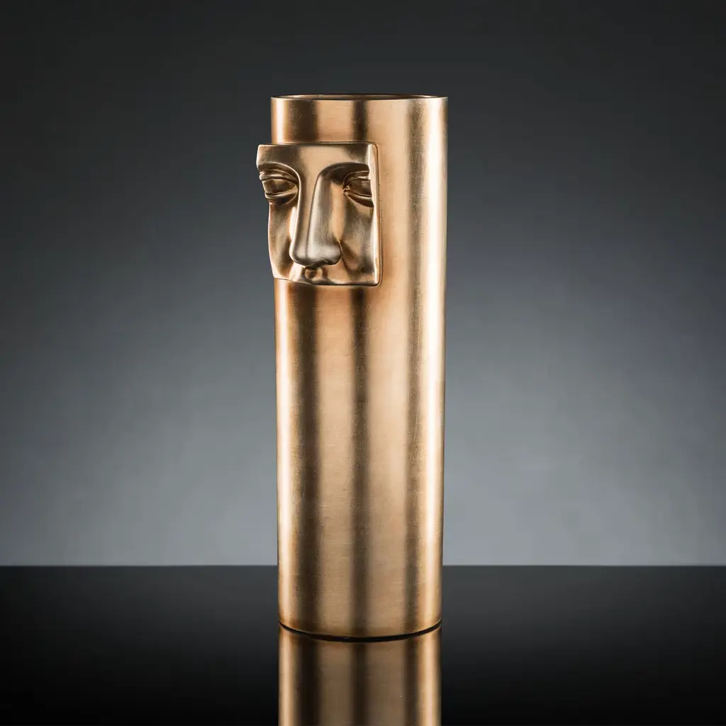This exquisite decorative vase will infuse a contemporary living room or entryway with a unique and sophisticated aura. Superbly handcrafted of ceramic and finished in a metallic brass color, this cylindrical piece is enriched with a striking low relief that depicts a close up of Roman goddess Juno's visage.
