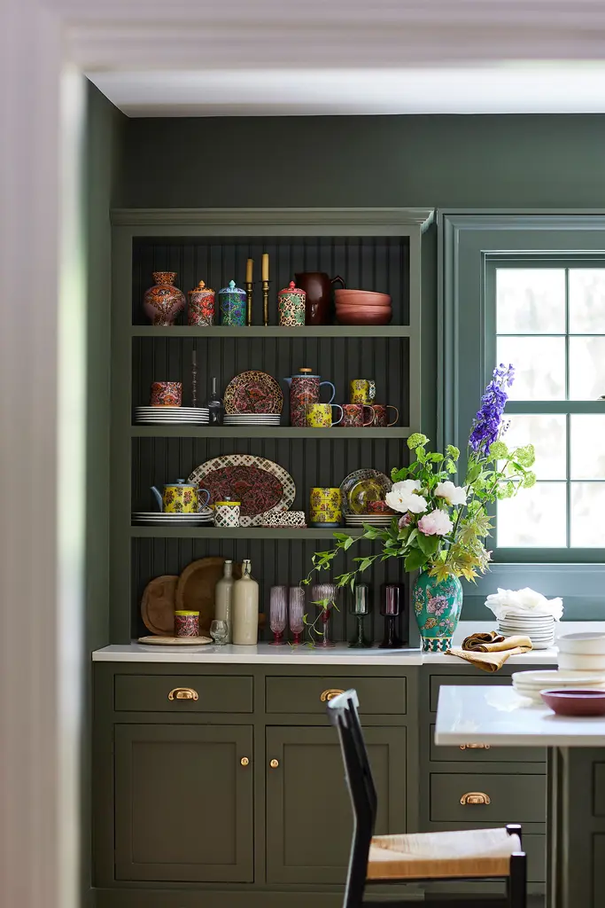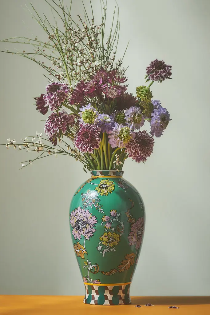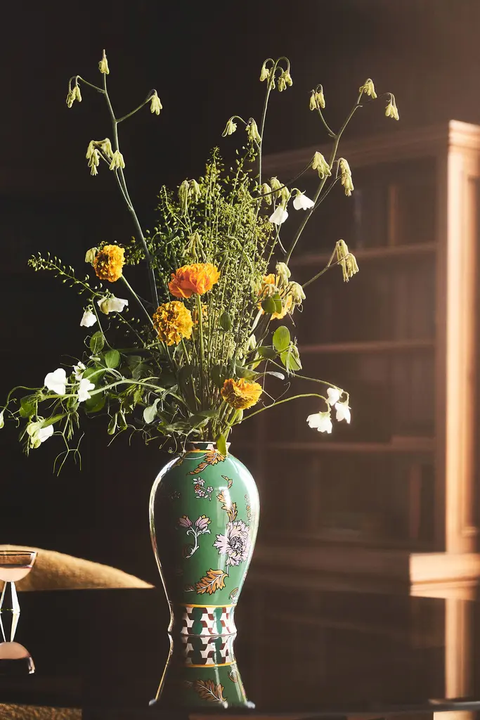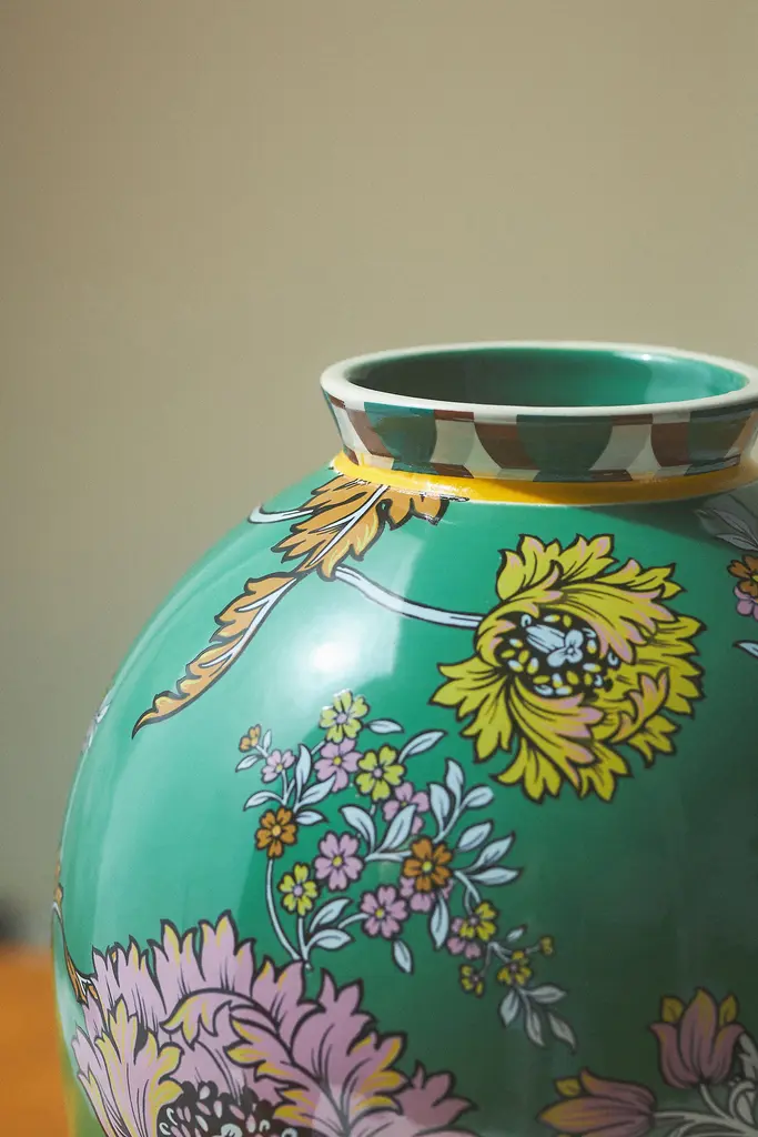 A vibrant botanical print ornaments this maximalist stoneware collection.