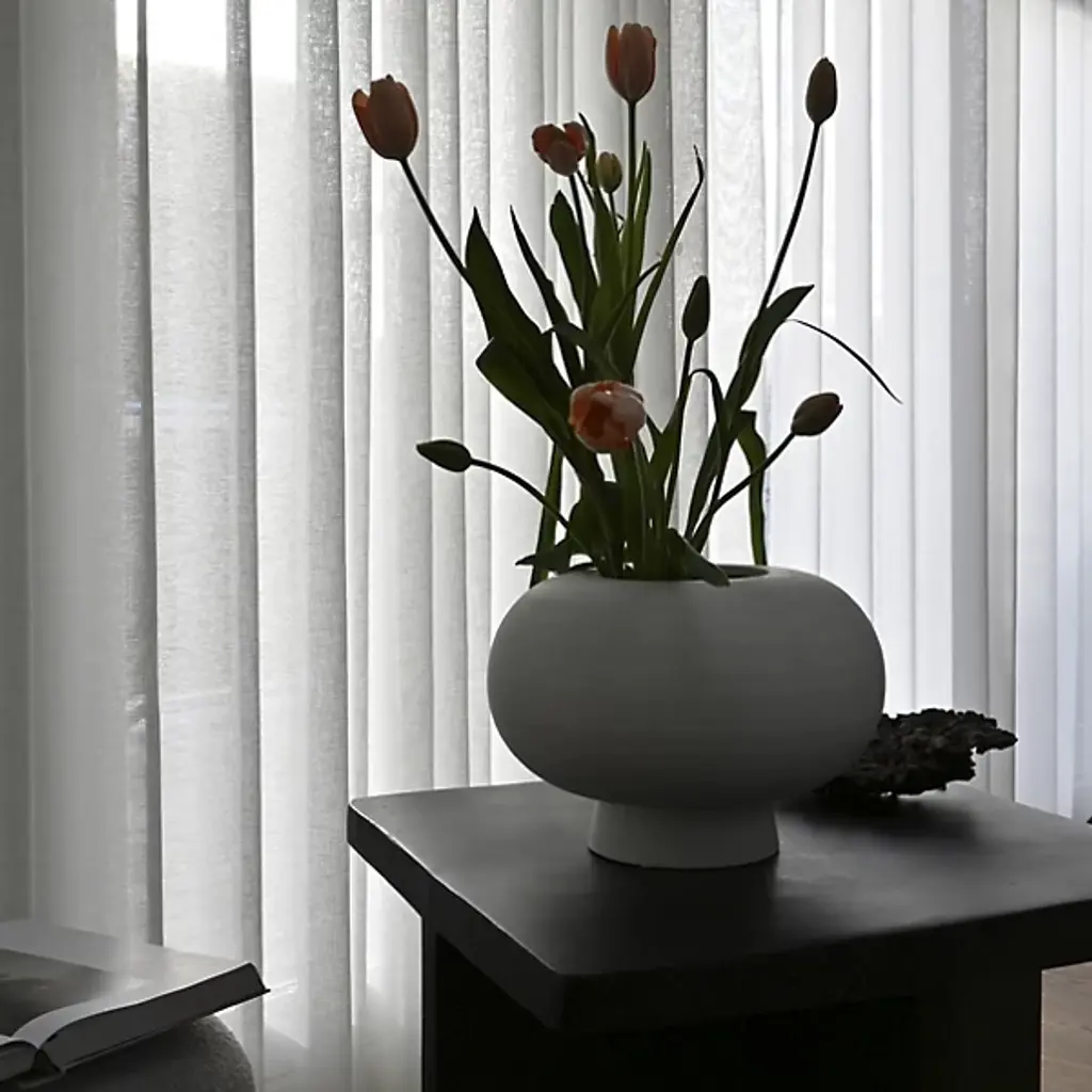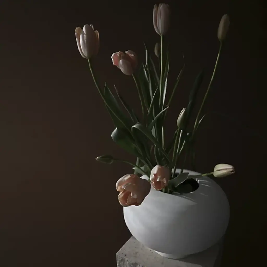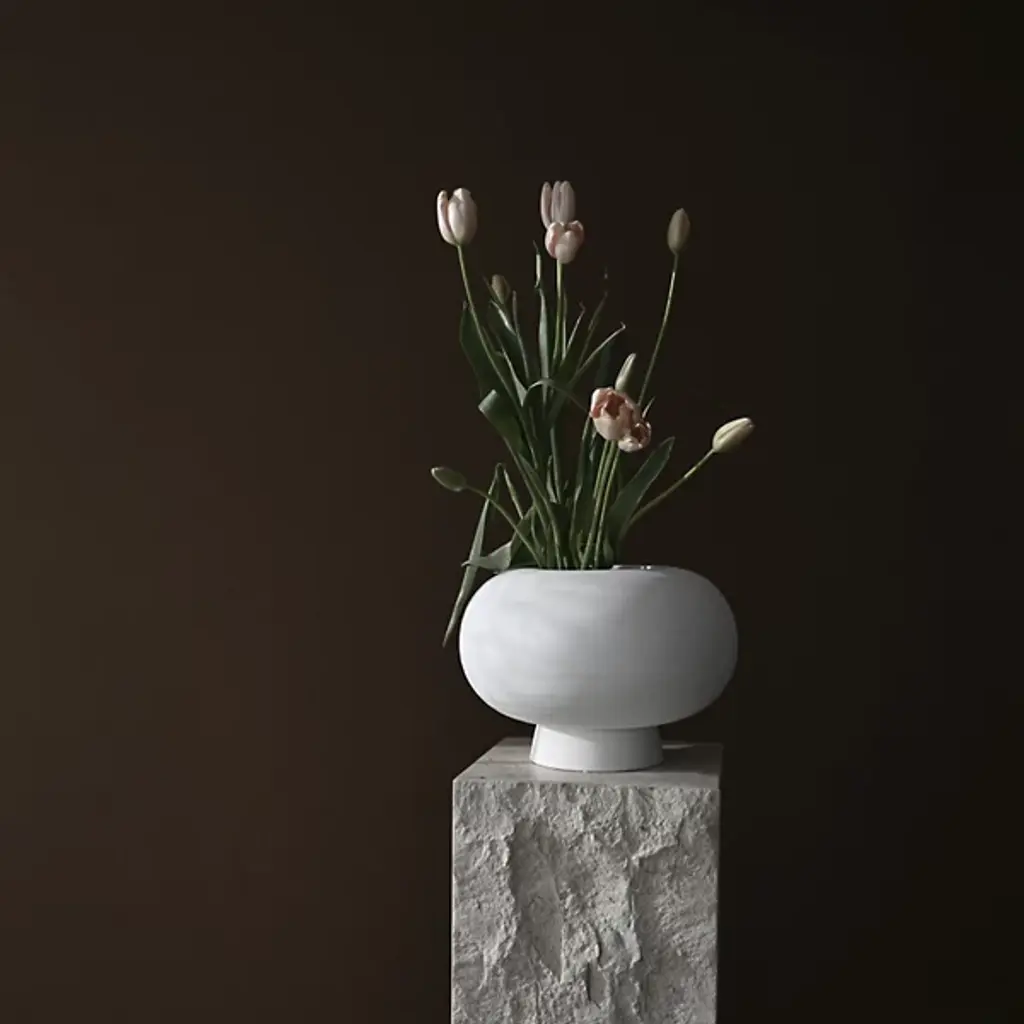 The Kabin Fat Vase from 101 Copenhagen matches the minimalism of Japanese design to the simplicity of Scandinavian character. A design collaboration between Kristian Sofus Hansen and Tommy Hyldahl, each vase is handcrafted from ceramic and draws inspiration from traditional Japanese tea bowls. It features a refined oval body perched on a small pedestal. The minimalist design creates stability and elegance, making it a perfect centerpiece, while each vase includes a protective bag for fresh flowers, accommodating its non-waterproof nature.