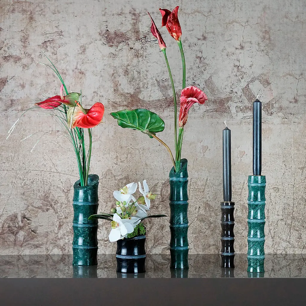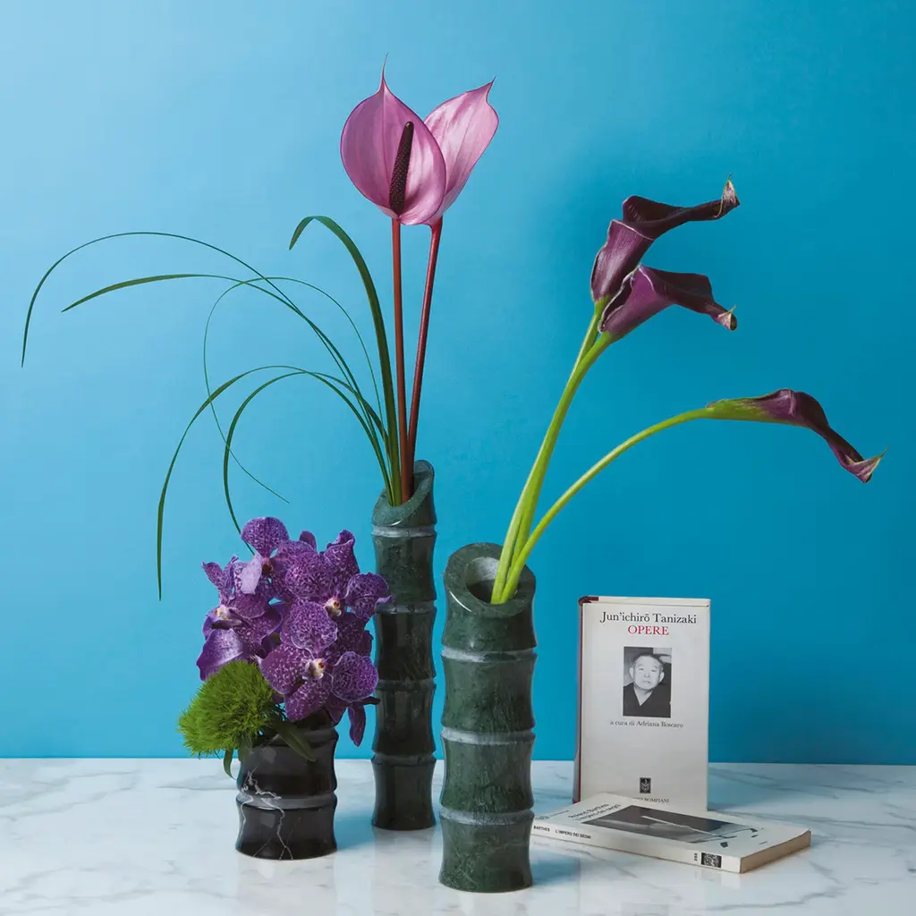 This sophisticated small vase from the Kadomatsu Collection impeccably exemplifies the fascination for Asian culture marking the entire series. A fine piece of rare charm crafted of prized black Marquina marble, it displays a compact phytomorphic design with horizontal grooves reproducing a bamboo cane, a type of plant that indisputably evokes Japanese landscapes and couples graceful lines with scratch-proof quality. The vase is available in larger sizes upon request. Please note that marbles and stones are natural materials and they can differ also if coming from the same quarry or the same block. The product shown may differ from purchased items. Every piece is unique.