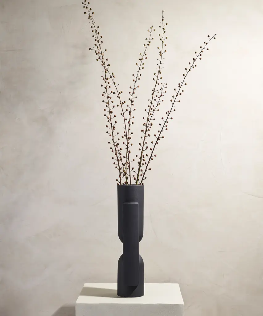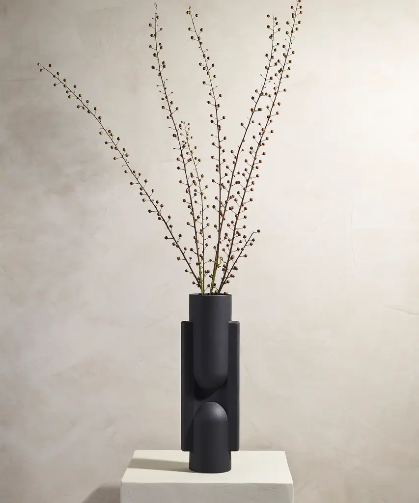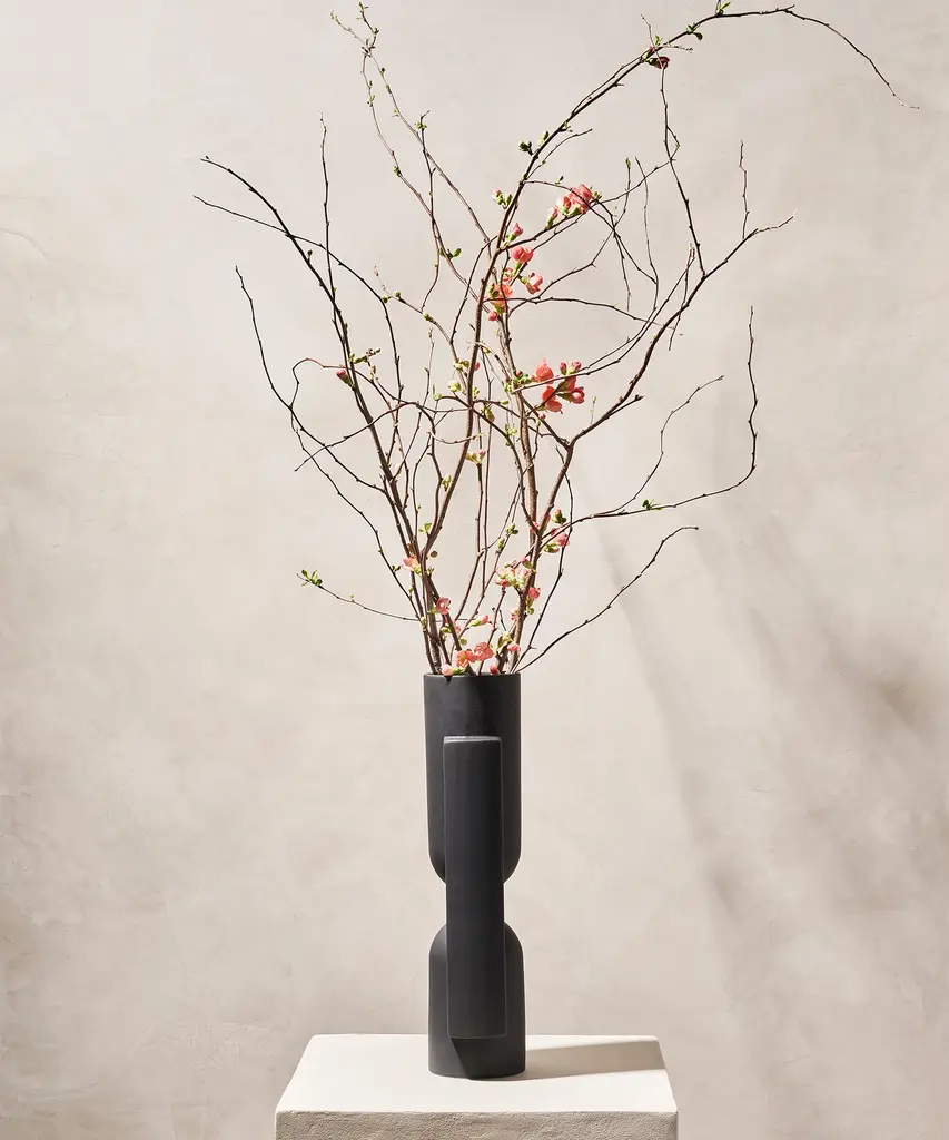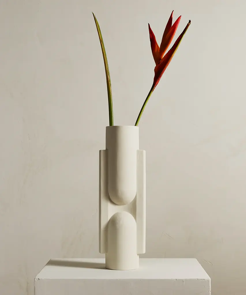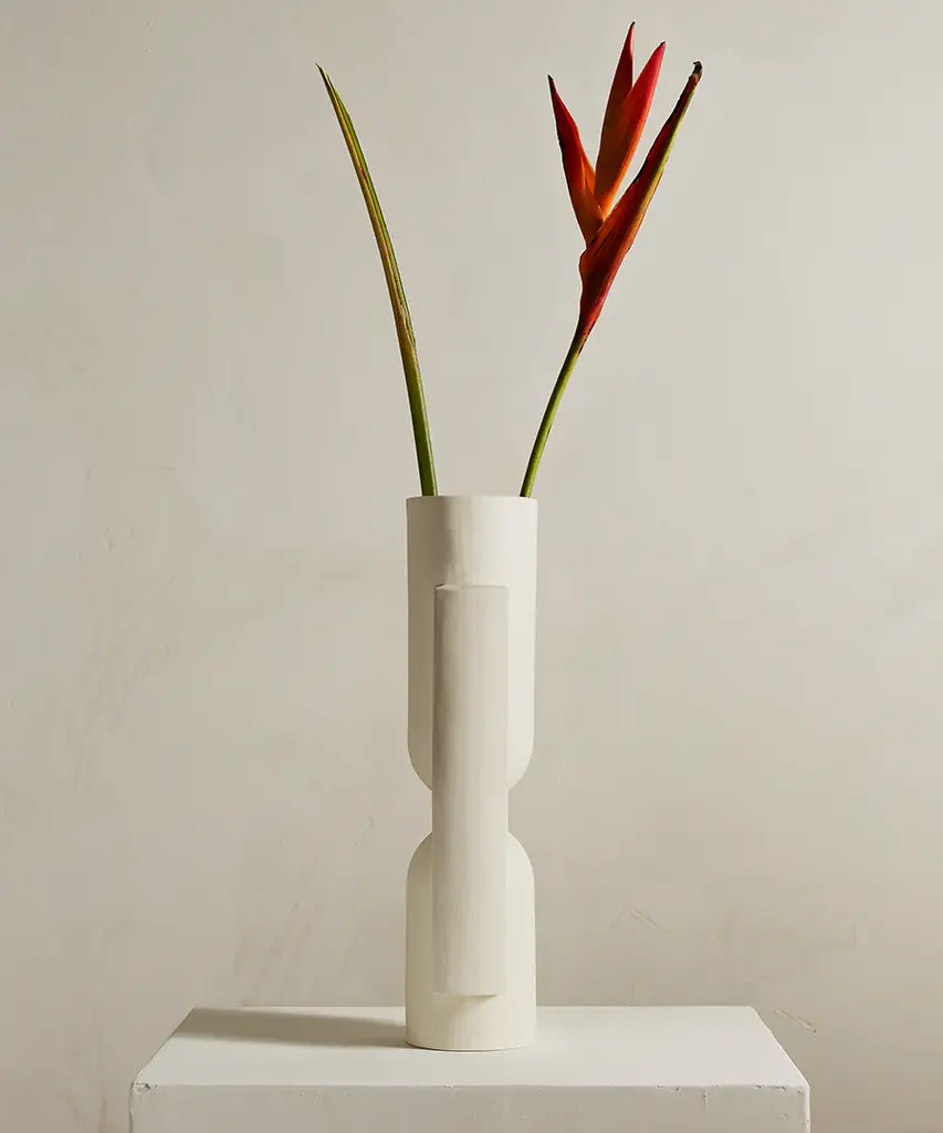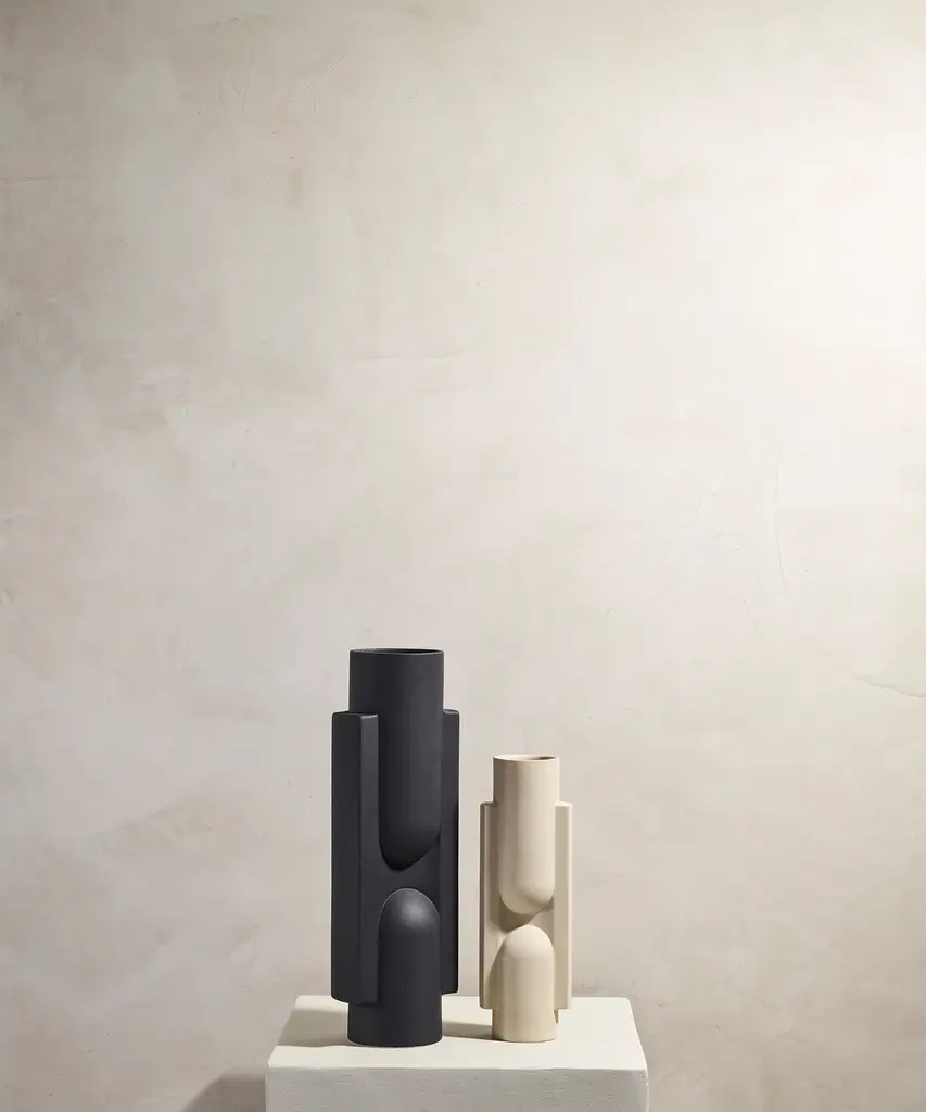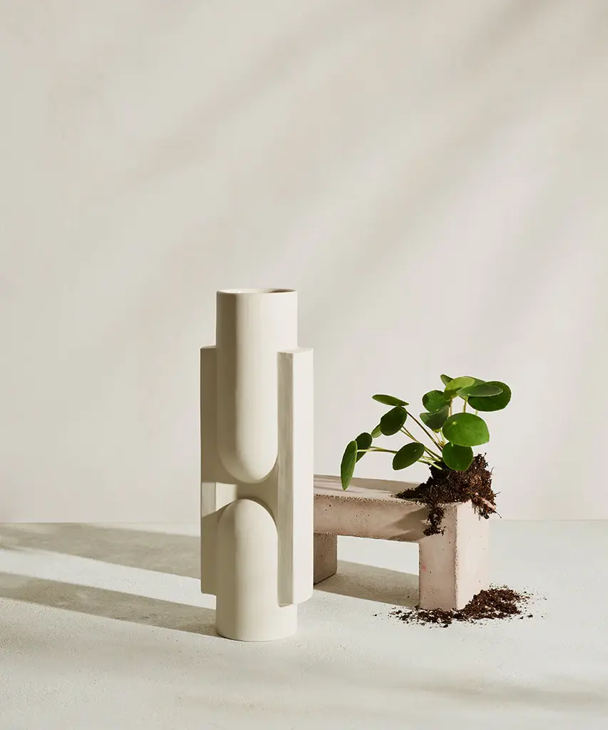 Geometric forms intersect to create this functional work of art. Kala is a slender, statuesque vase created through the playful interaction between forms. Realized in snowy white, sand or coal. Designed by Brooklyn-based studio, Light + Ladder.