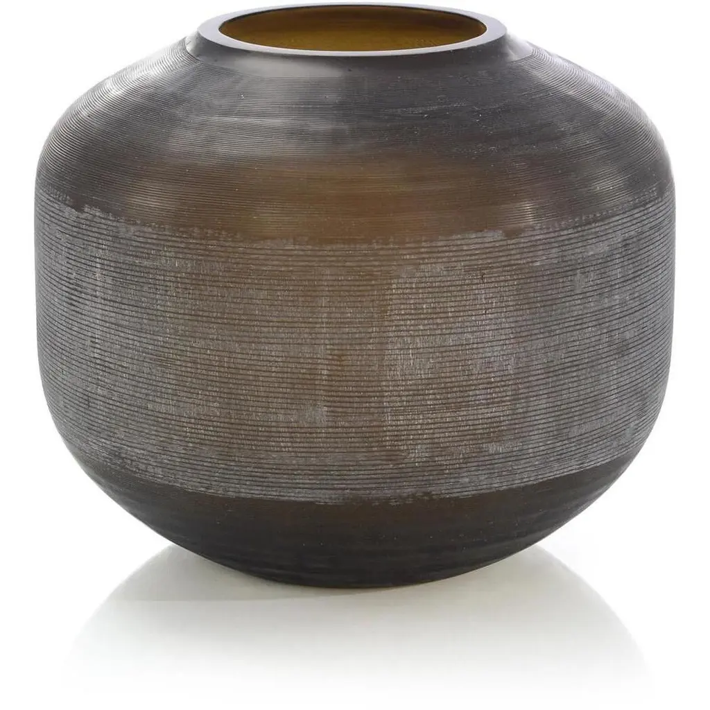 Delicately crafted from mouth-blown glass, this sophisticated vase showcases subdued black and brown tones. The piece features a distinct, hand-carved texture across the entirety, introducing a human element to your interior space.
