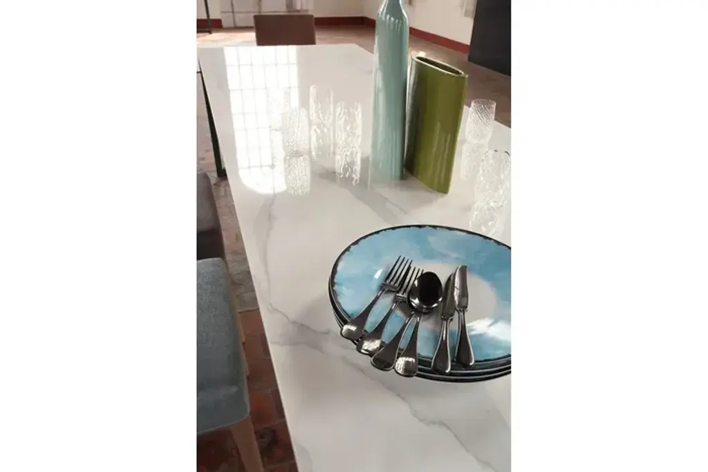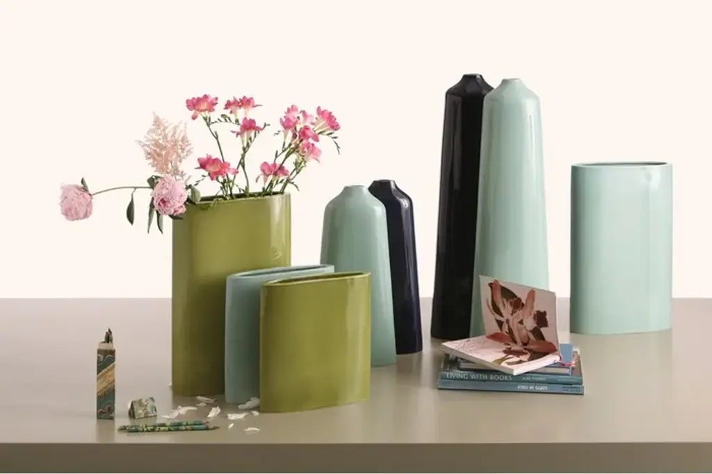 Long and narrow shape ceramic vase refinished by hand, with row white finish or refinished by hand, polished and enamelled in Lime, Aqua and Marine colours.Two heights available.