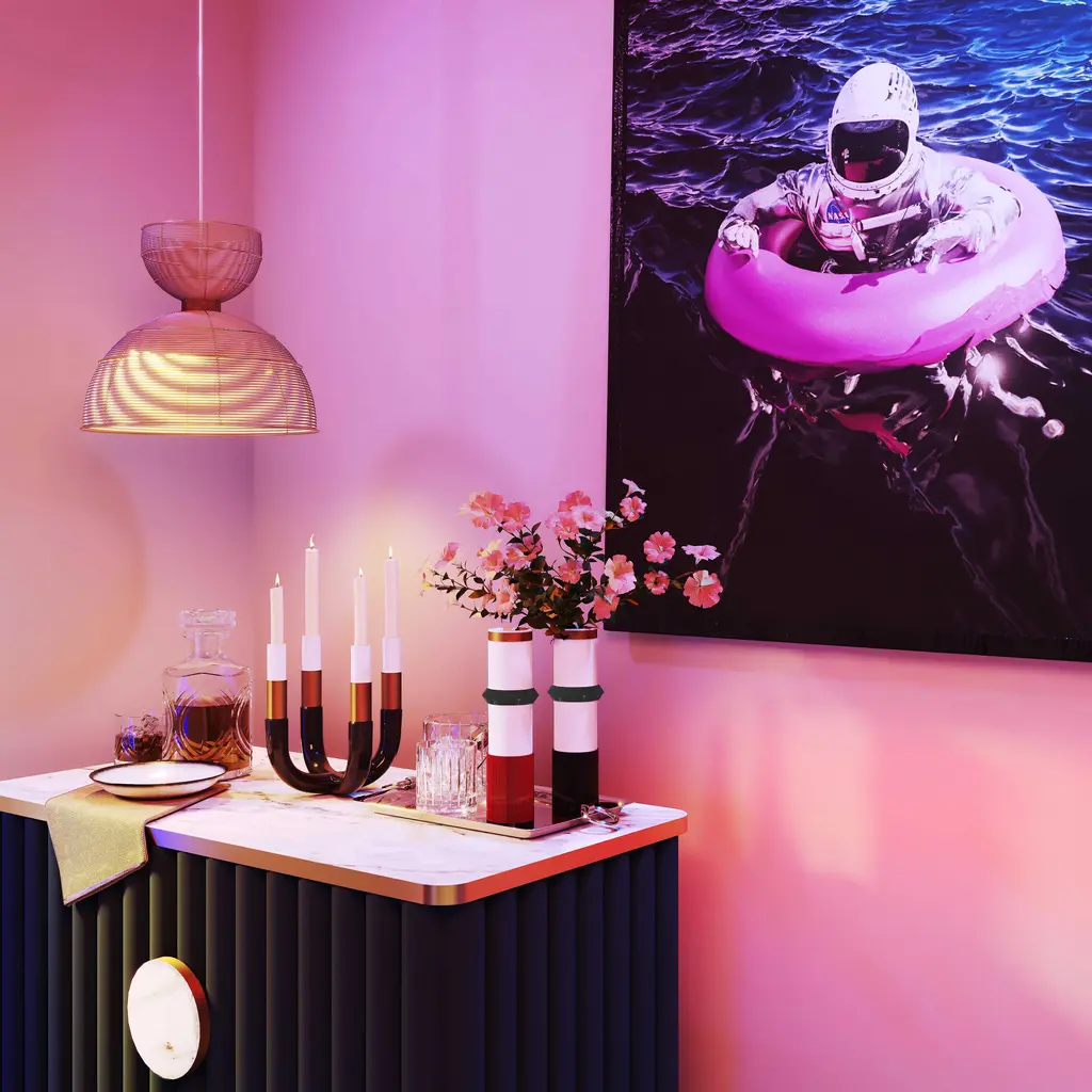 Go for the bold with the Kaonashi Vase, inspired by iconic Memphis postmodern style. Handmade by skilled artisans, this candelabra showcases impeccable craftsmanship. Constructed with a combination of iron and aluminum, it exudes both durability and modern flair. Available in black, burgundy, and mustard yellow, it offers a range of striking colors to complement your unique decor. Decorate your space with this standout piece that effortlessly combines form and function.
