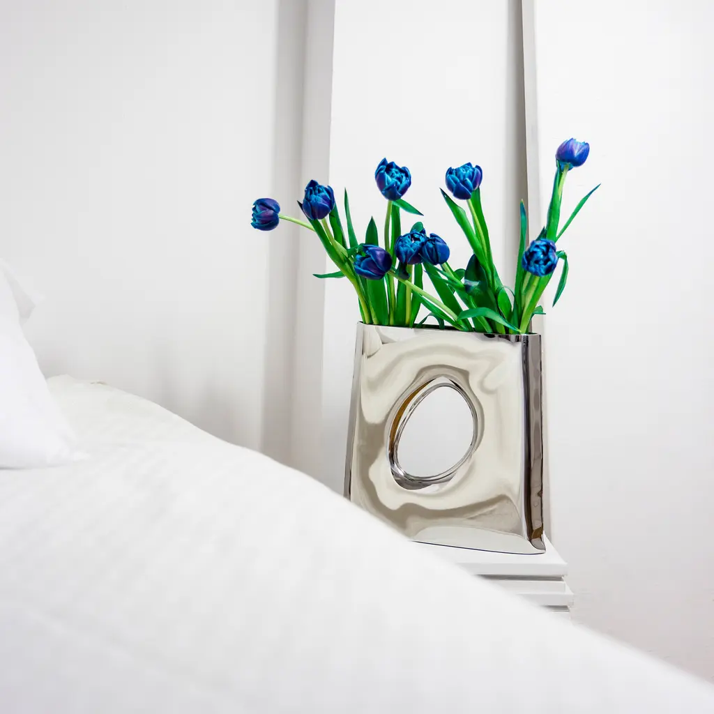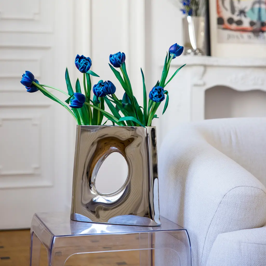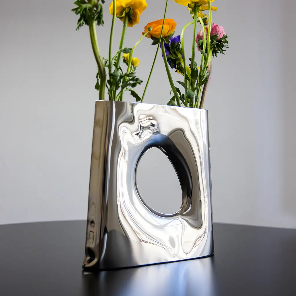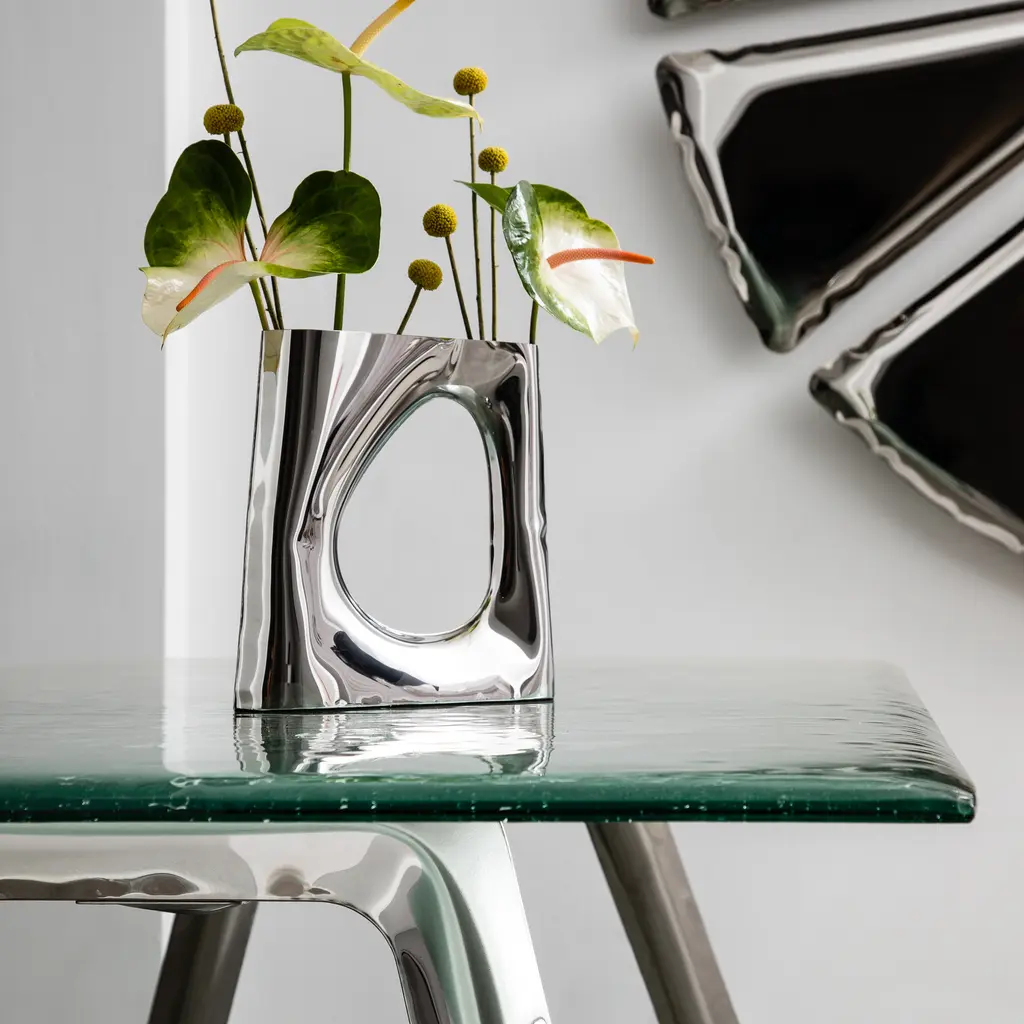 The Karava Vase is a geometric steel piece that redefines traditional flower arrangements. Its trapezoidal shape and central cut-out create a structured display, guiding the placement of stems and transforming floral compositions. Made from polished stainless steel, the vase reflects its surroundings with shifting light and dynamic distortions. Beyond function, it stands as a sculptural object. Crafted using FiDU technology, the steel expands under pressure, forming a lightweight yet durable structure. Designed for indoor use, Karava adds a modern architectural presence to any space.