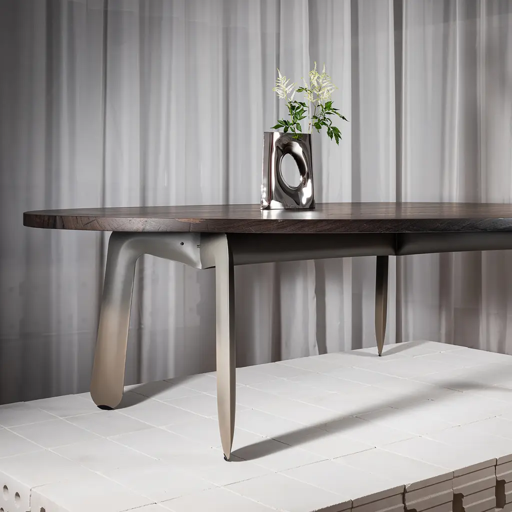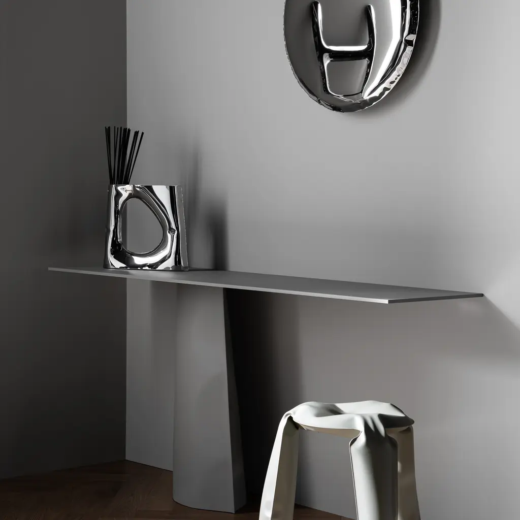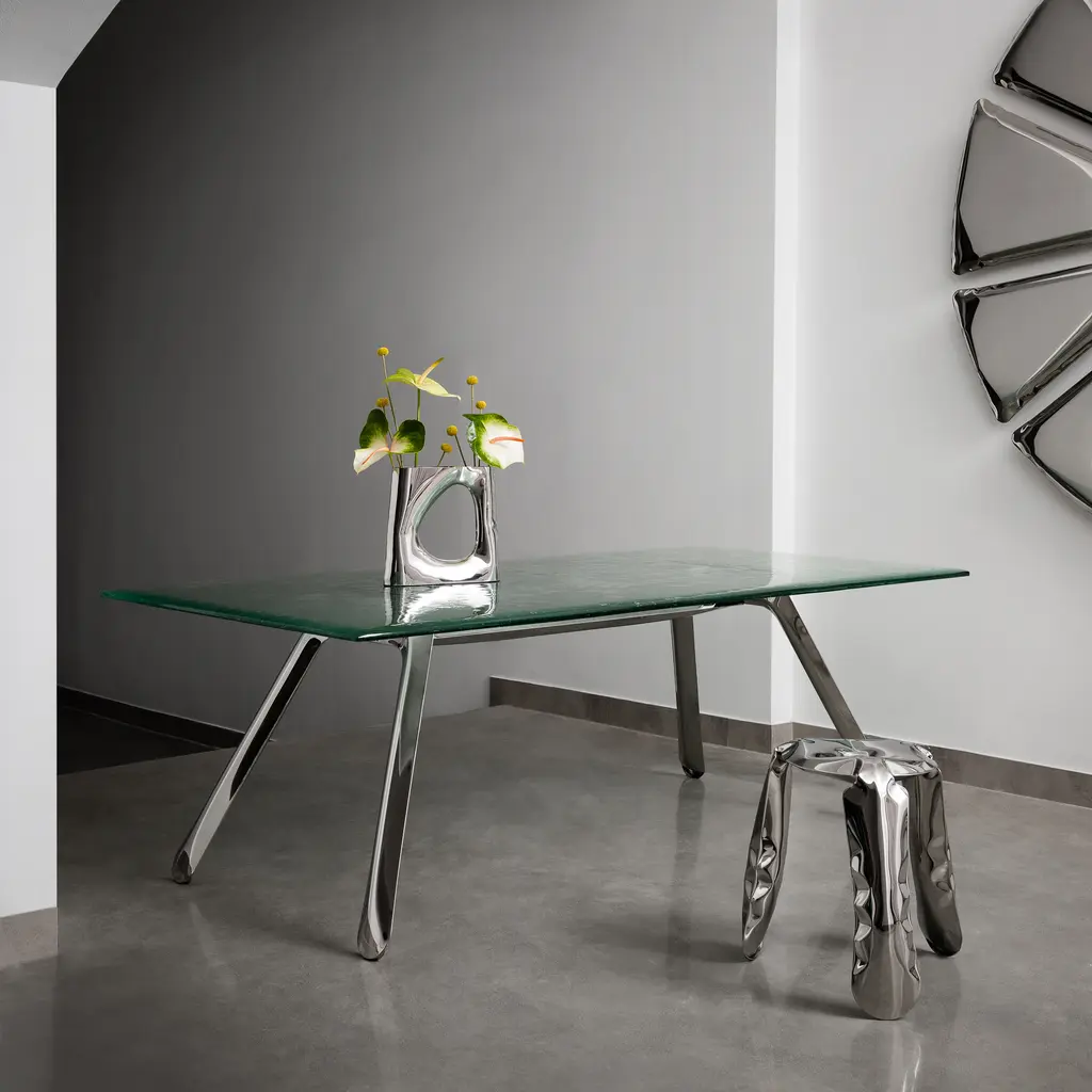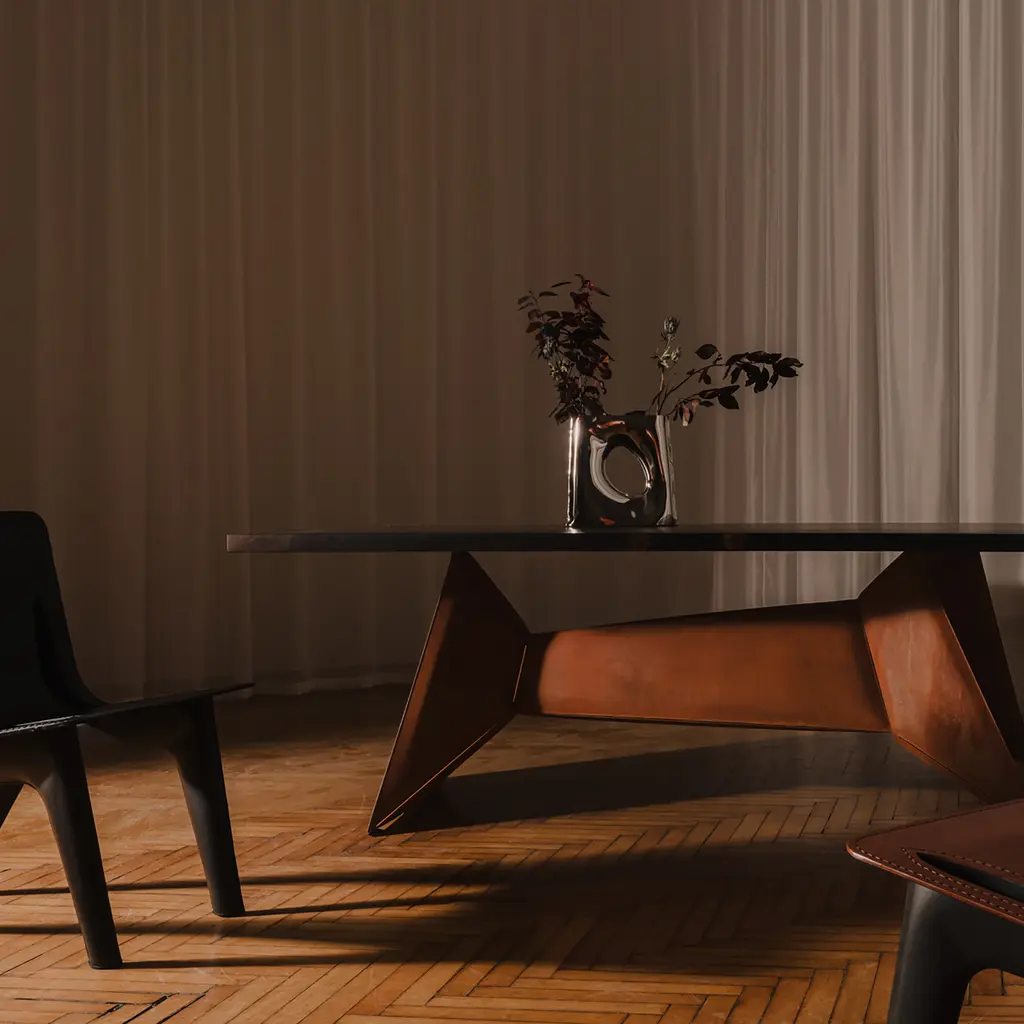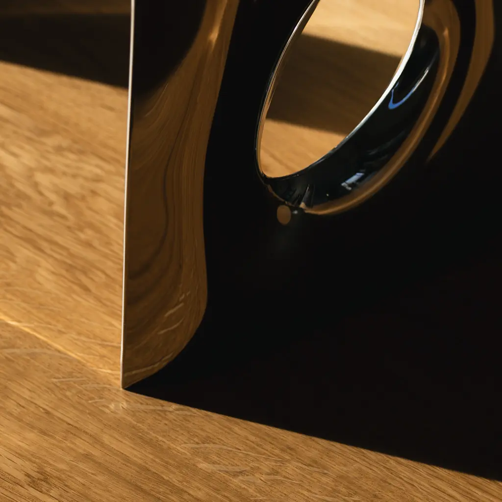 The Karava Vase is a geometric steel piece that redefines traditional flower arrangements. Its trapezoidal shape and central cut-out create a structured display, guiding the placement of stems and transforming floral compositions. Made from polished stainless steel, the vase reflects its surroundings with shifting light and dynamic distortions. Beyond function, it stands as a sculptural object. Crafted using FiDU technology, the steel expands under pressure, forming a lightweight yet durable structure. Designed for indoor use, Karava adds a modern architectural presence to any space.