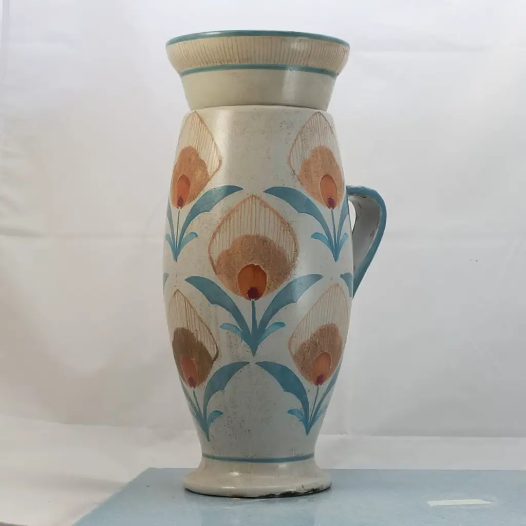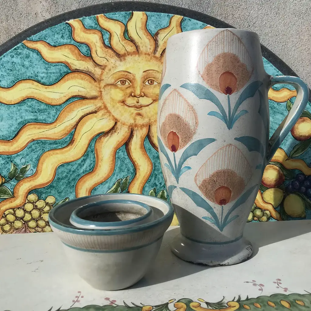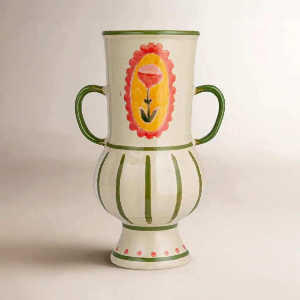 The Karma vase embodies retro elegance, with its hand-painted floral design in soft blues and oranges. The muted matte gray background enhances the earthy tones of the flowers, creating a warm and inviting aesthetic. Made from terracotta, this vase's two-part design, featuring a removable lid, brings both versatility and visual interest. Its timeless look adds character to any interior. For additional details, please get in touch with the Concierge.