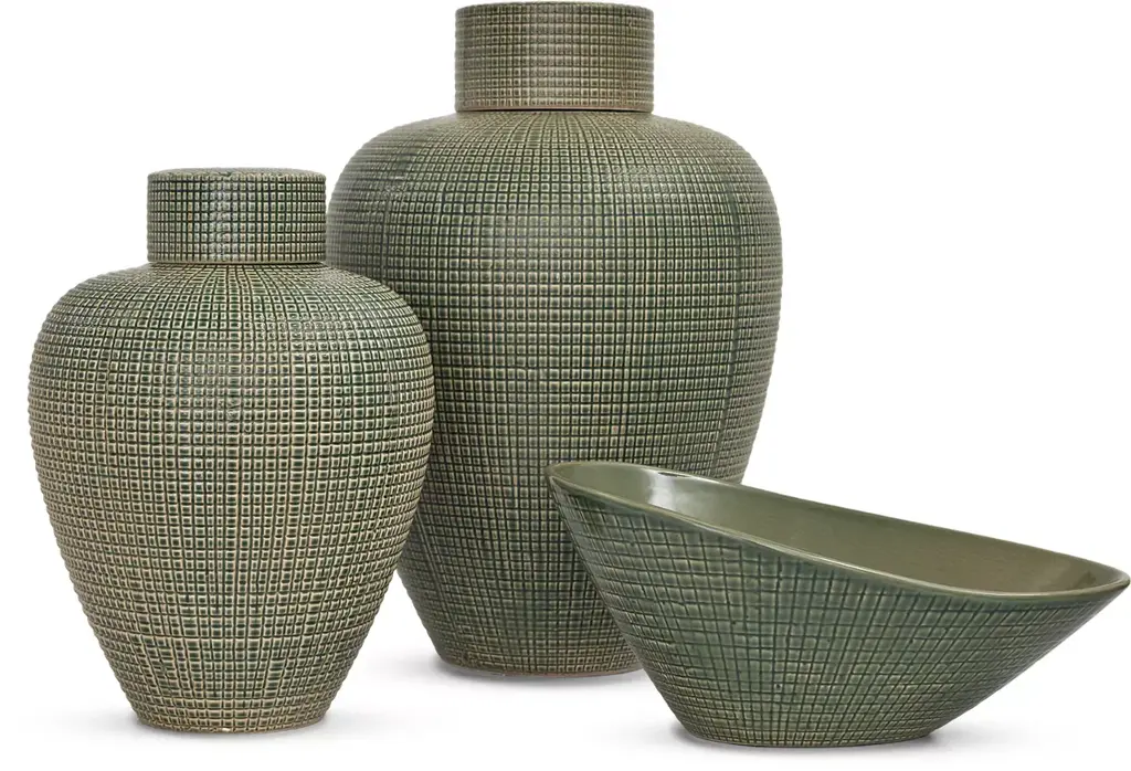 Step into a world where elegance meets nature with our Kempner vase. Each vase, cloaked in a reactive glaze of earthy green, narrates a saga of rustic charm interwoven with modern poise. The hand-sculpted texture, akin to the artistry of woven fabric, spins a yarn of tranquil allure and refined beauty. Choose from the 15-inch stature for a subtle infusion of grace or the 21-inch for a more pronounced statement. Whether standing solo or paired for a composed ensemble, these vases offer a sanctuary of peace and visual delight. Select your preferred size before adding to cart.