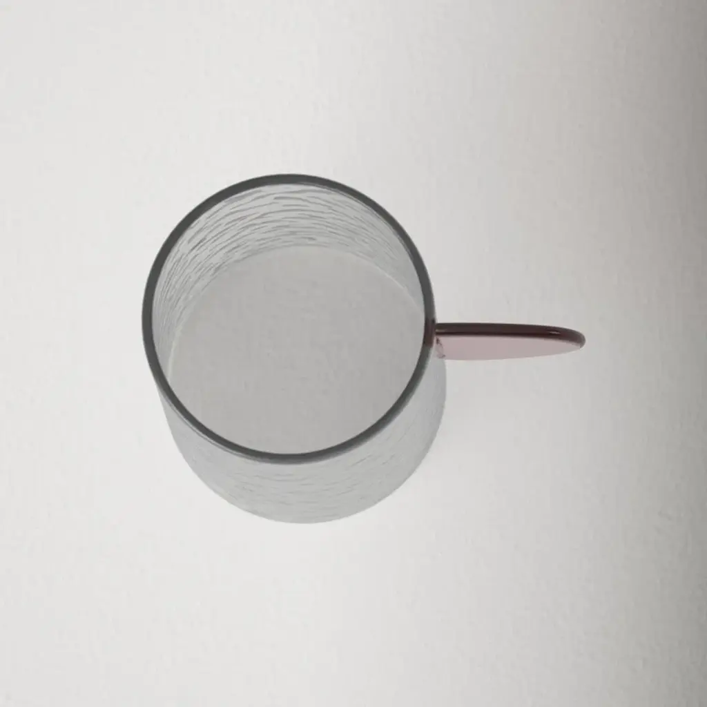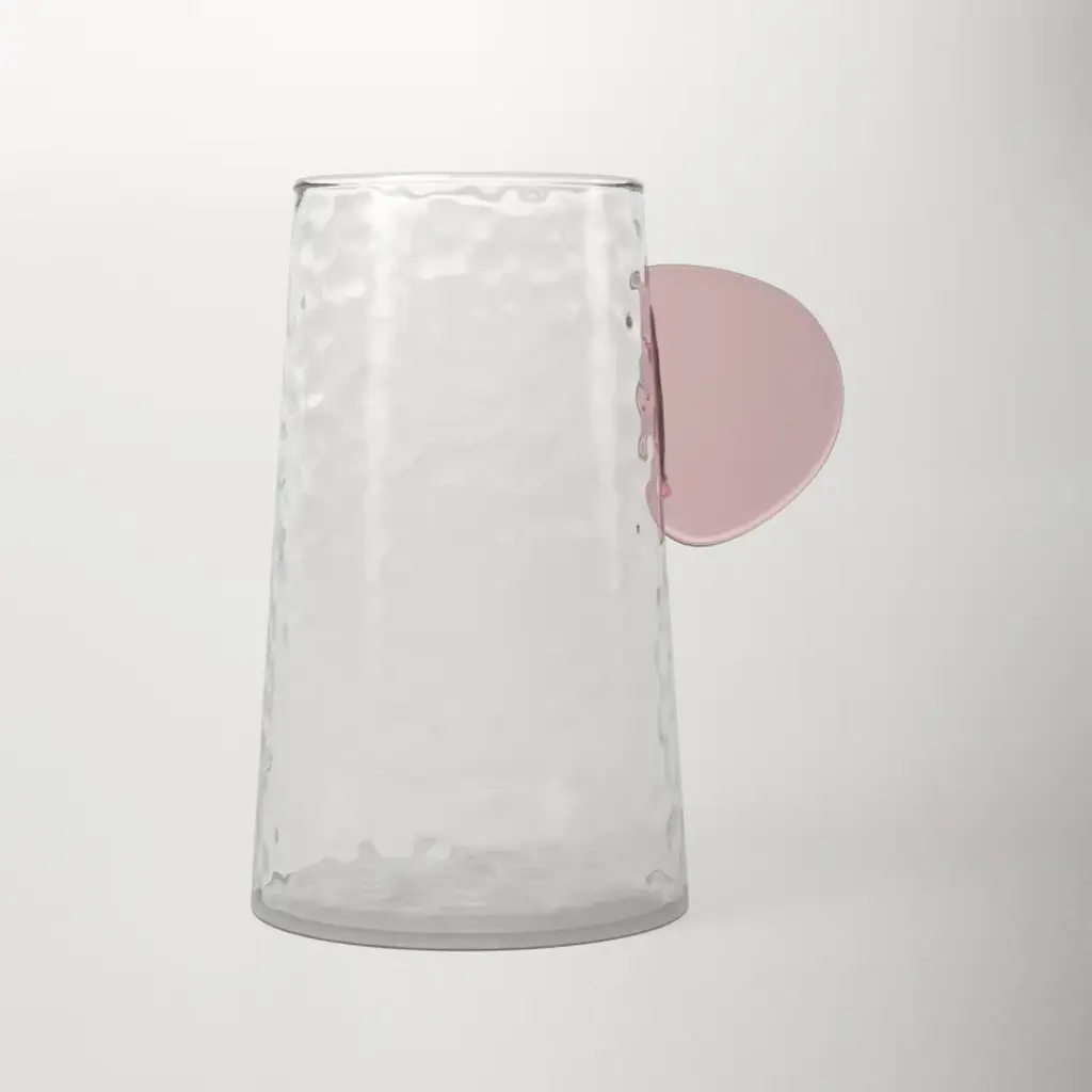 Crafted from wavering recycled glass + accented by an ear-like blush pink handle, this pitcher calls to mind an ‘80s-era block glass window, bathed in a warm neon glow. A transparent tapered silhouette emphasizes texture + filters light compellingly. Wash by hand to keep it looking its best.