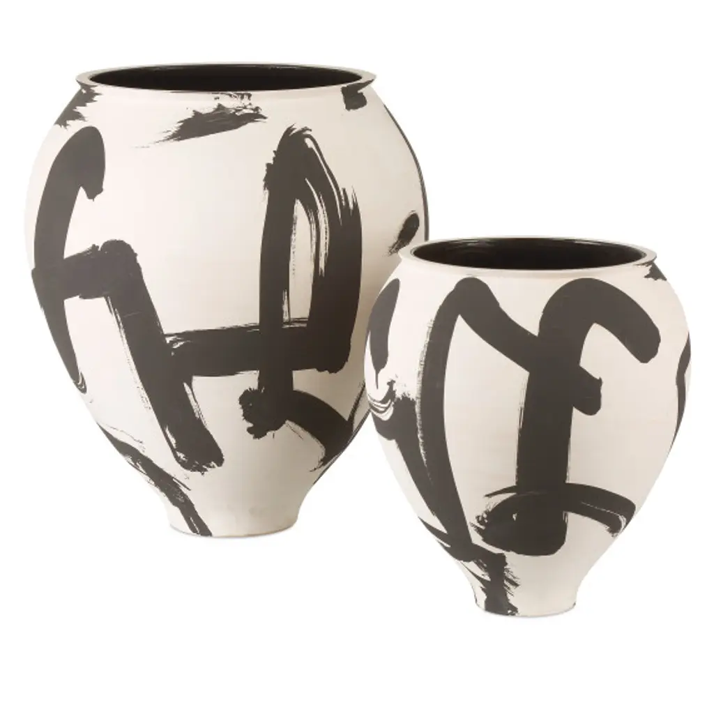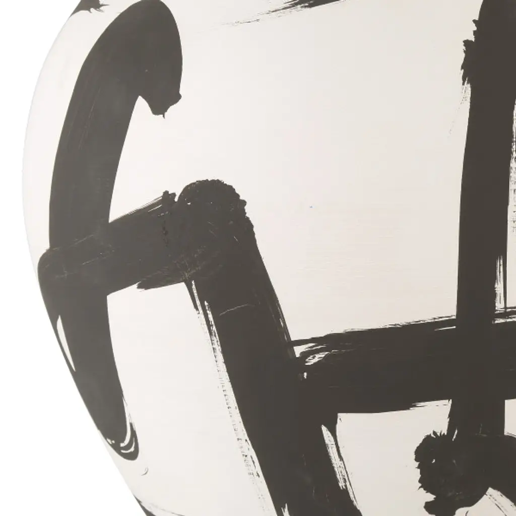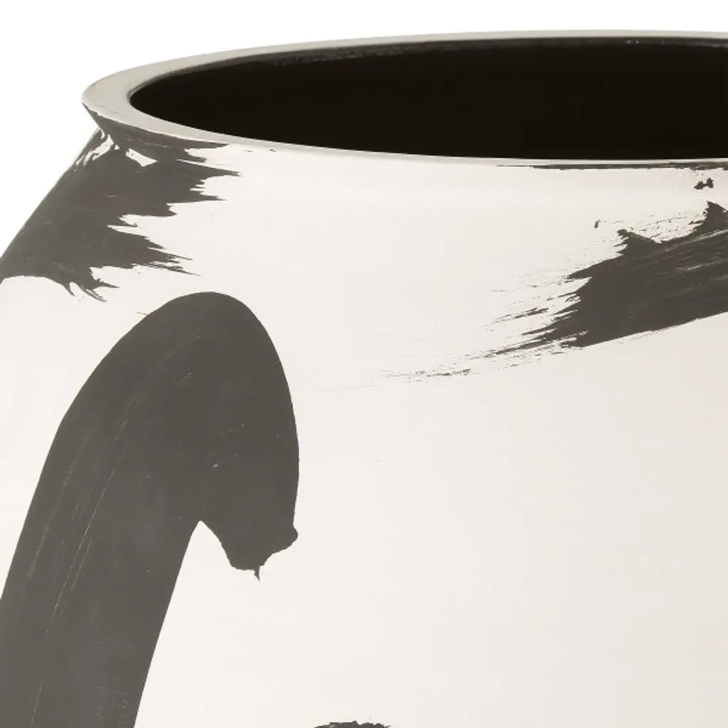 The sketched pattern on the surface of the Kenzo Vase was inspired by the art of Imperial Japan, particularly the Enso, a prolific symbol in the Zen practice of painting. Made of porcelain, the vessel is finished on the inside; and it is hand-thrown, hand-glazed, and hand-decorated so the patterns on each vase will vary slightly.