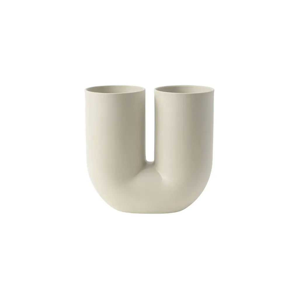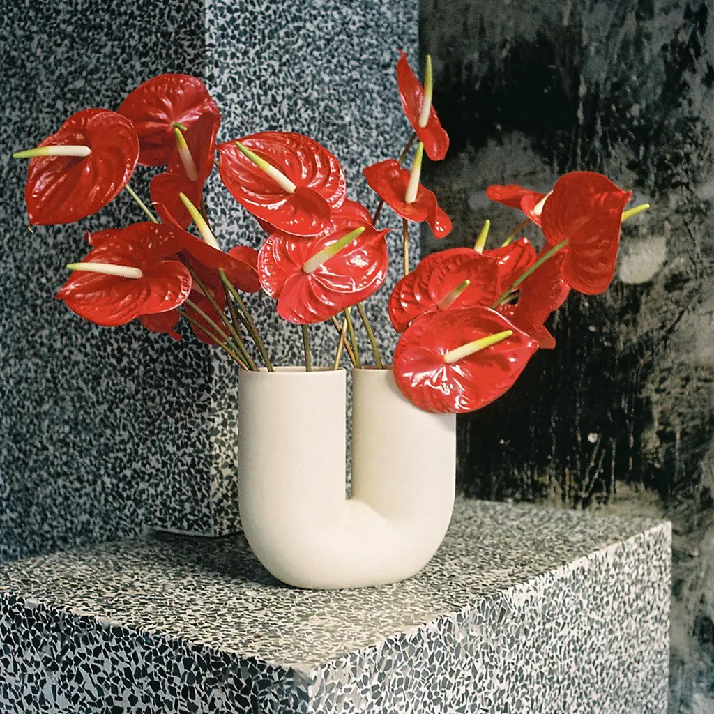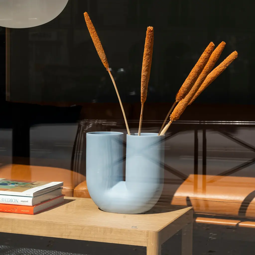 American-born and now Rotterdam-based, Rachel Griffin’s double vase reflects both her sense of whimsy and her experience as a graphic designer. Kink’s unusual shape is achieved with digital means to fashion the molded porcelain vessel before firing and a final glazing just on the inside for a refined contrast. Fill either or both of the openings with flowers or leave unfilled as a sculptural addition on a desk, table or sideboard.