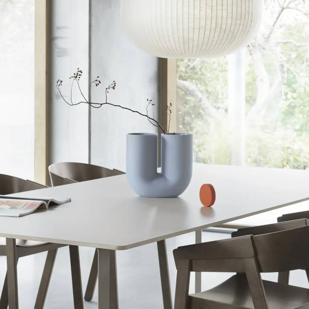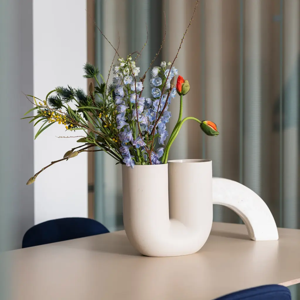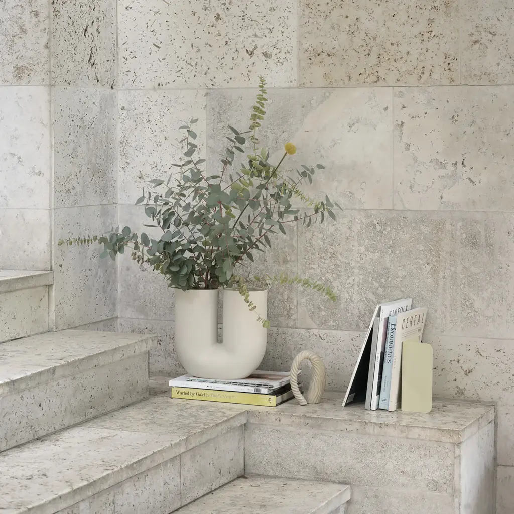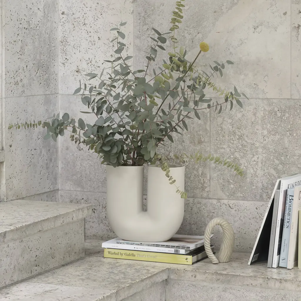 American-born and now Rotterdam-based, Rachel Griffin’s double vase reflects both her sense of whimsy and her experience as a graphic designer. Kink’s unusual shape is achieved with digital means to fashion the molded porcelain vessel before firing and a final glazing just on the inside for a refined contrast. Fill either or both of the openings with flowers or leave unfilled as a sculptural addition on a desk, table or sideboard.