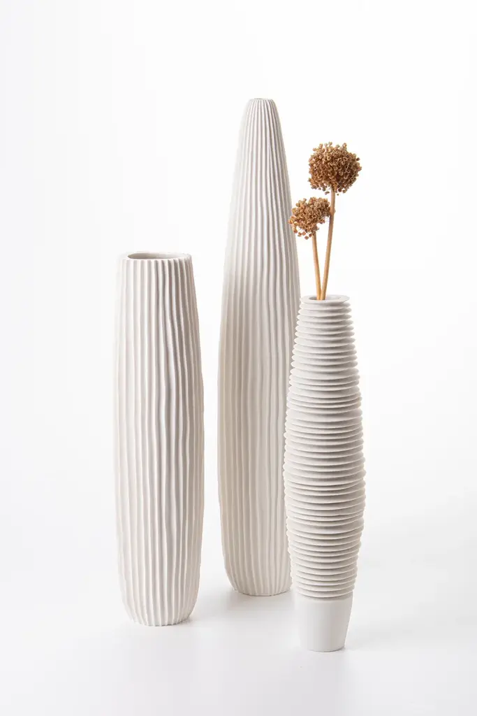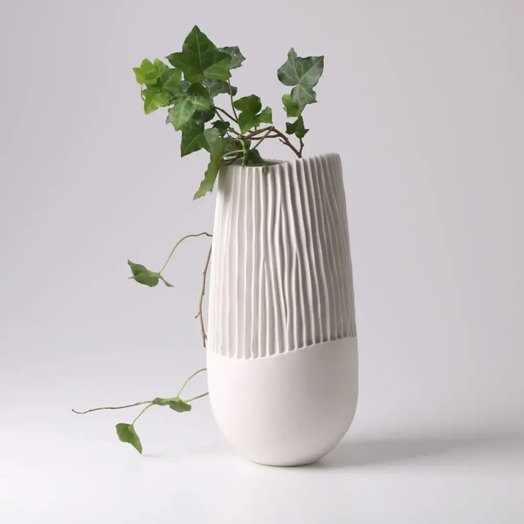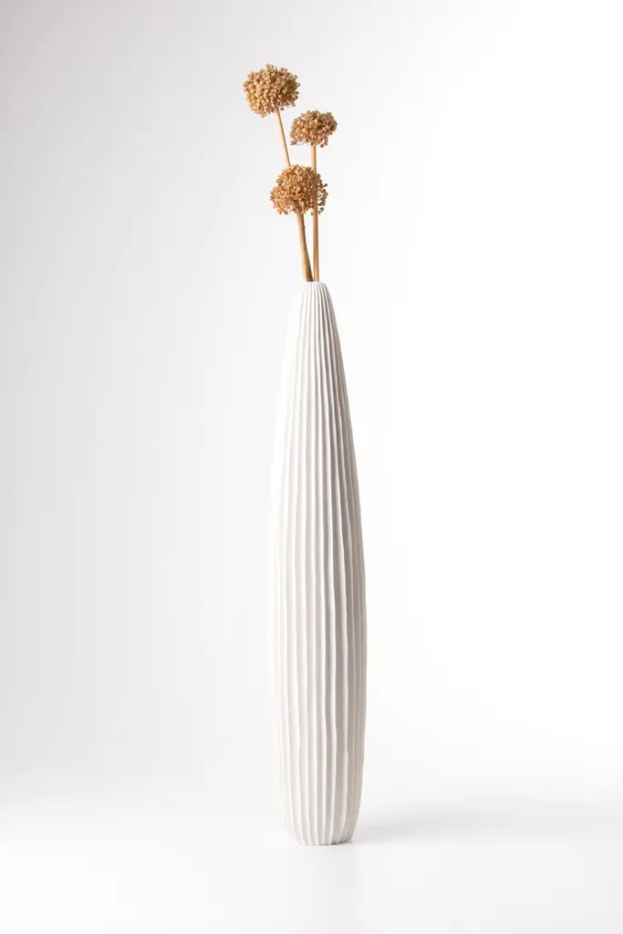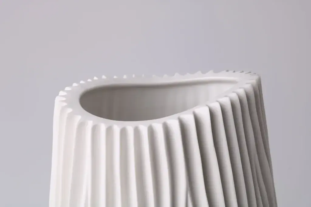 The eye loses itself amid a thousand channels in a succession of plans chasing the dense lamellar structure. Pure white porcelain vases, like elegant columns, vestiges of a classic beauty with a contemporary design.NOVALIS - Items to show, but also to use. The eye lose itself amid a thousand channels in a succession of plans chasing the dense lamellar structure. Snow-white porcelain bowls and bottles from which emerge bright colours as well as sparkling gold and platinum. A liquid and iridescent palette contaminates the smoothed river-bed of limed fossils, and settles without hurry on peaks and ridges of archaic and material cruets.