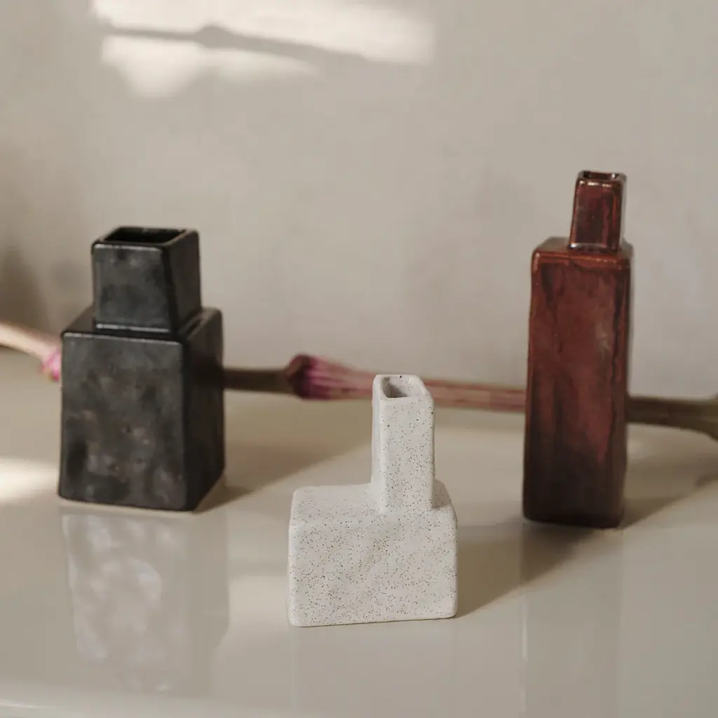 The Koa Family marries brutalist aesthetics with a rugged, handcrafted charm. Each vase features a unique geometric shape, evoking the beauty of architectural structures, while subtle imperfections in the glaze lend an artisanal touch. Featuring varying proportions and sizes, from tall and slender to squat and wide, they create a rhythmic, eye-catching composition. Perfect for showcasing a single flower, the Koa vases embody the strength and valor reflected in their name, which means `warrior' or `valiant one.' The set of three miniature vases makes a perfect gift for any occasion, whether for friends, family, or yourself. Variation in the finish may occur due to the glaze type.