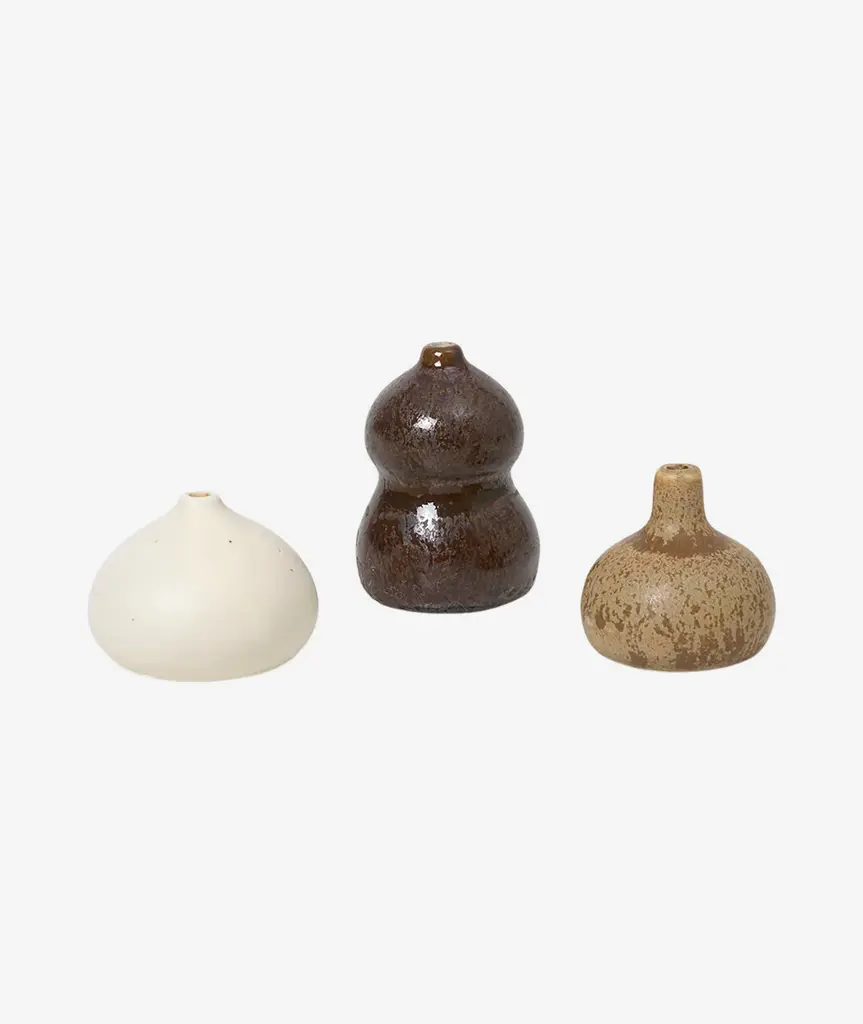 Create a decorative still life with the family of Komo Mini Vases. The small, chubby vases come in a set of three that all have their own reactive glaze, giving each of them a unique expression. Use them on your favorite bookshelf together with other cherished objects, on the table with single stem flowers or place a tray underneath to use them for incense sticks.