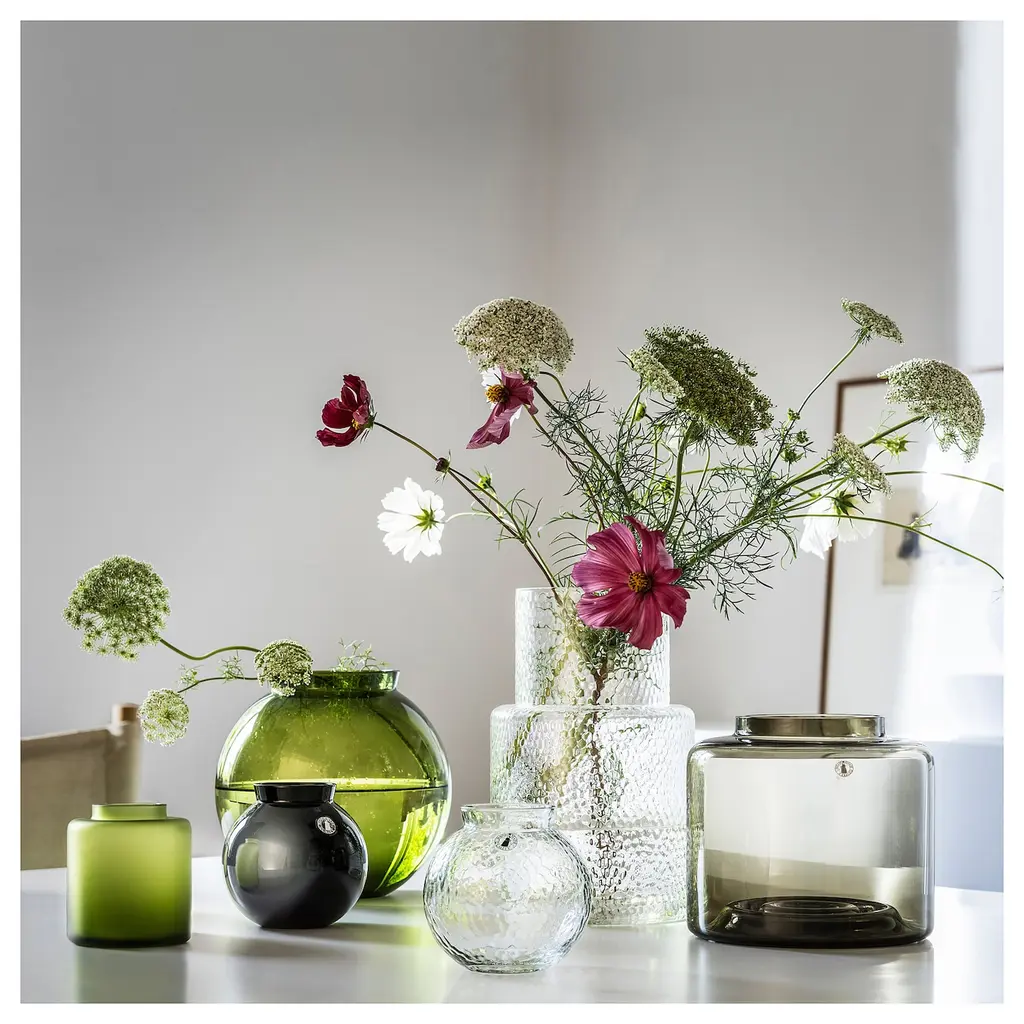KONSTFULL Vase - clear glass/patterned 10 ¼ ". This tall semi-transparent glass vase with texture has a shimmering surface and goes nice with something like long and elegant roses or other bouquets. The rings at the bottom hold the stems at the desired angle and create space between the flowers.