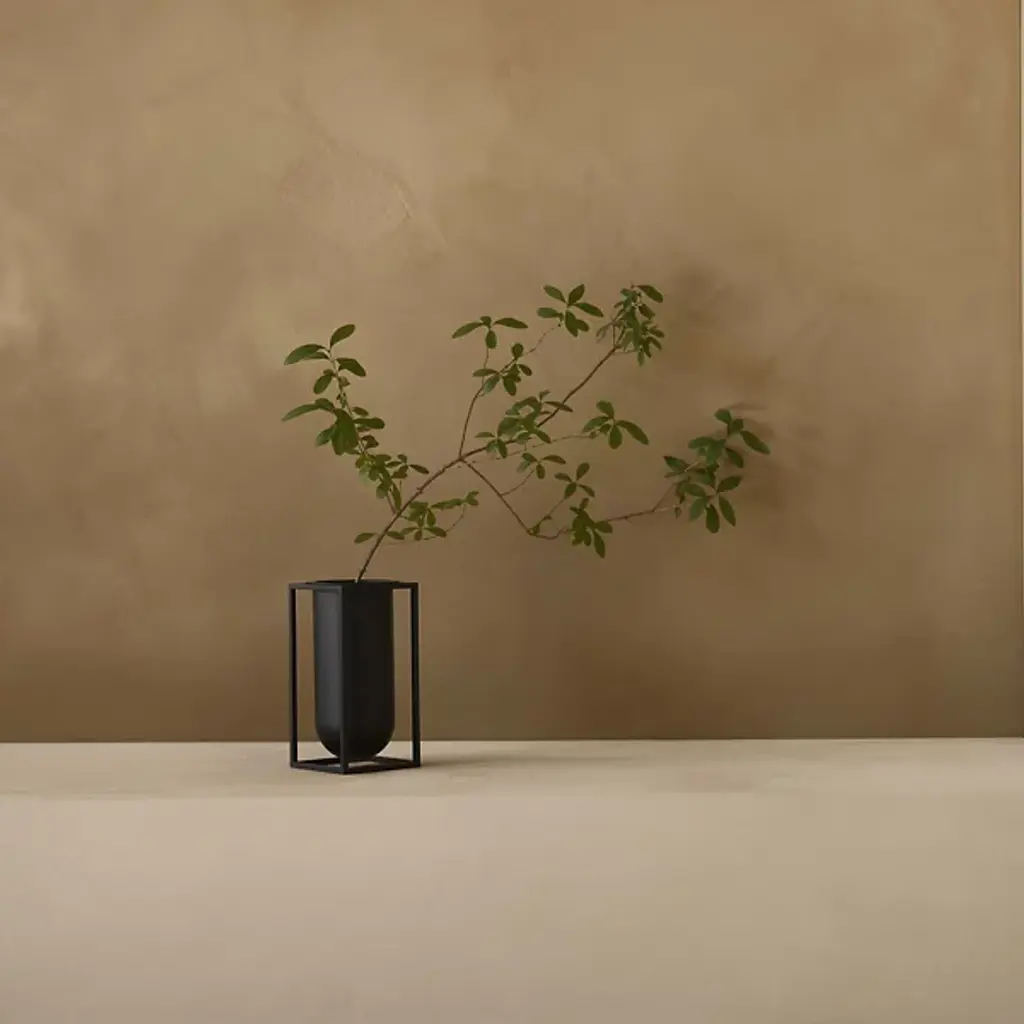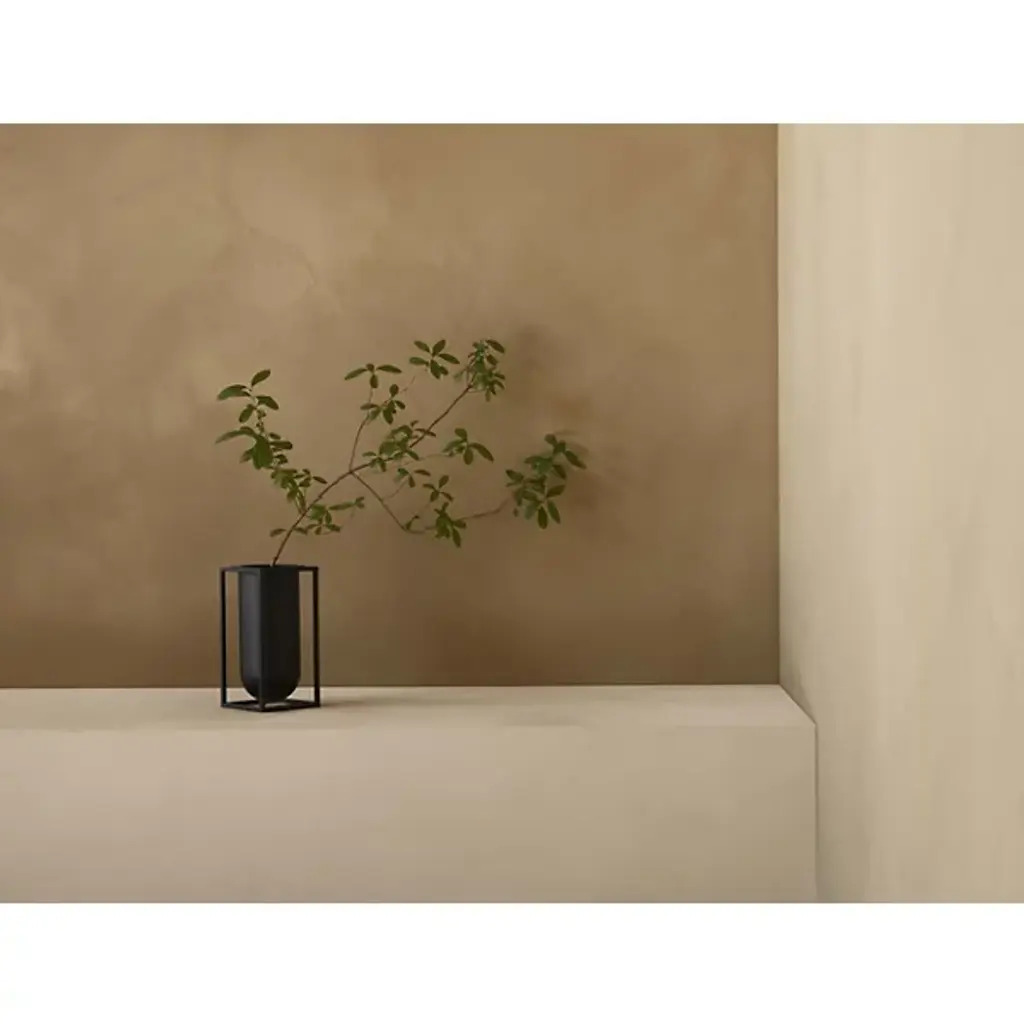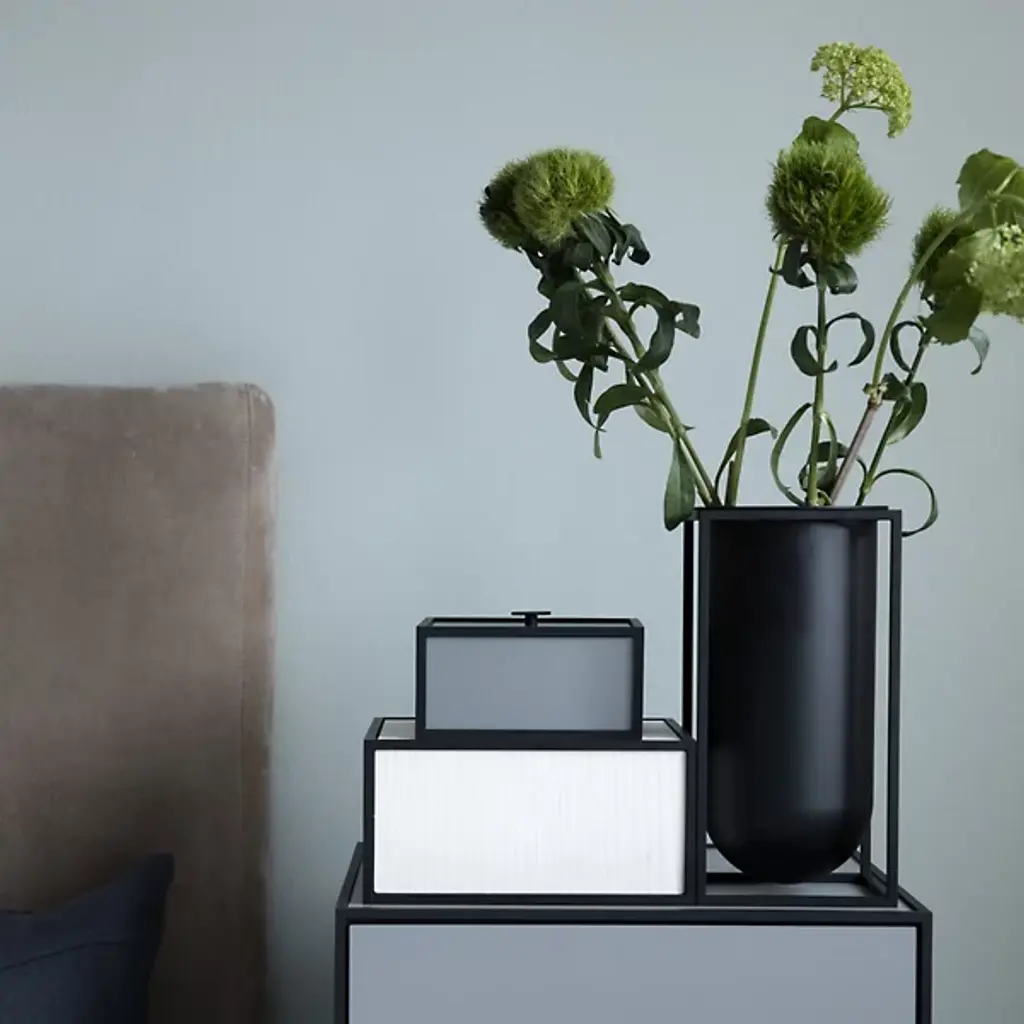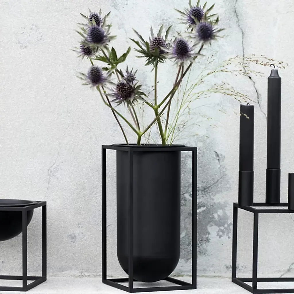 Lend an inspired addition to your inside spaces with the sleek surfaces and open construction of the Kubus Vase Audo Copenhagen, formerly known as Menu. It is designed by Soren Lassen who artfully blends Scandinavian and contemporary styles, working with zinc and aluminum. Starting with a tall rectangular prism frame, it seats an elongated dome that calls to mind an opaque test tube inside it, ideally sized to secure several stems upright. The powder-coated matte texture contrasts beautifully with colorful flowers or natural herbs placed inside it, ensuring they stand out proudly from the fixture.