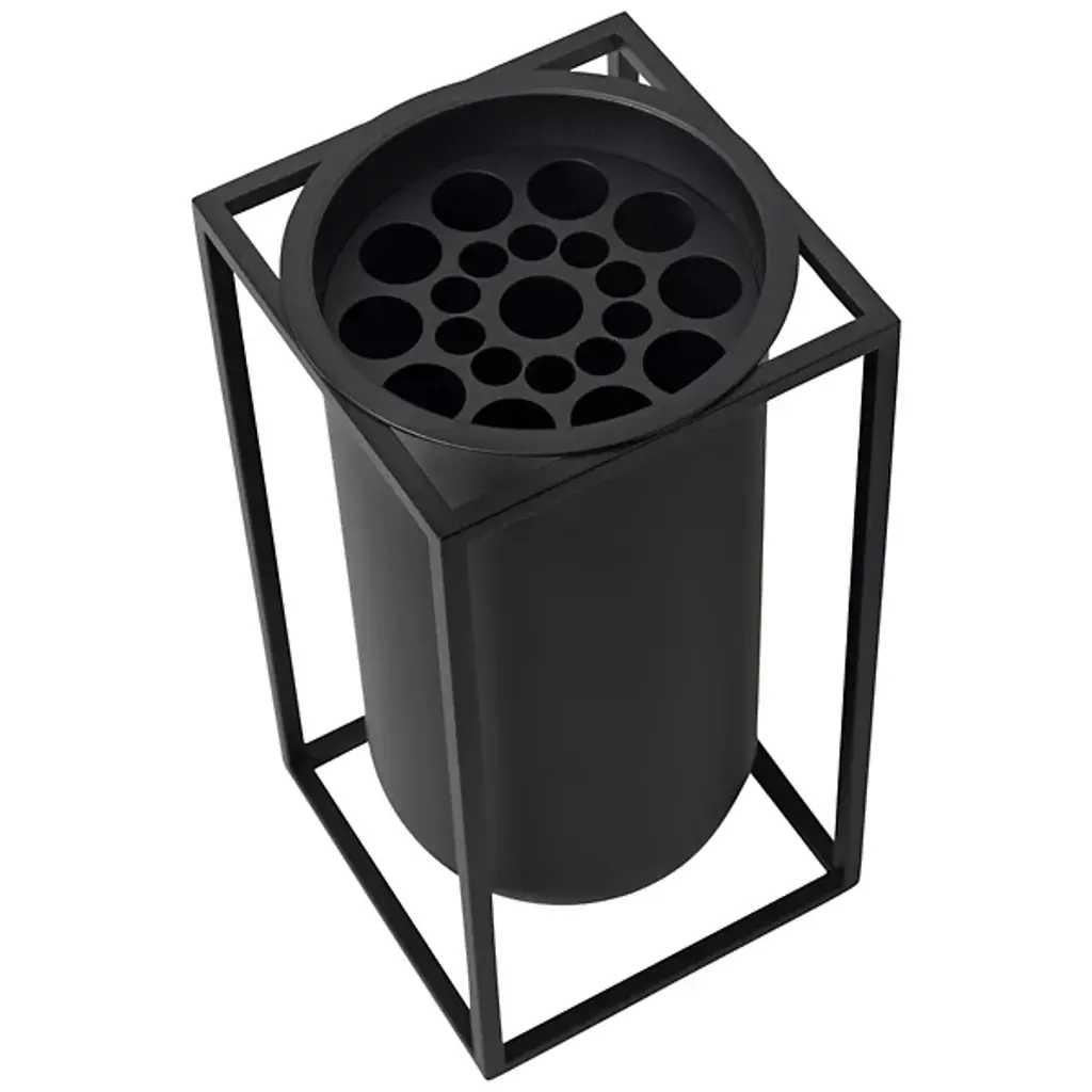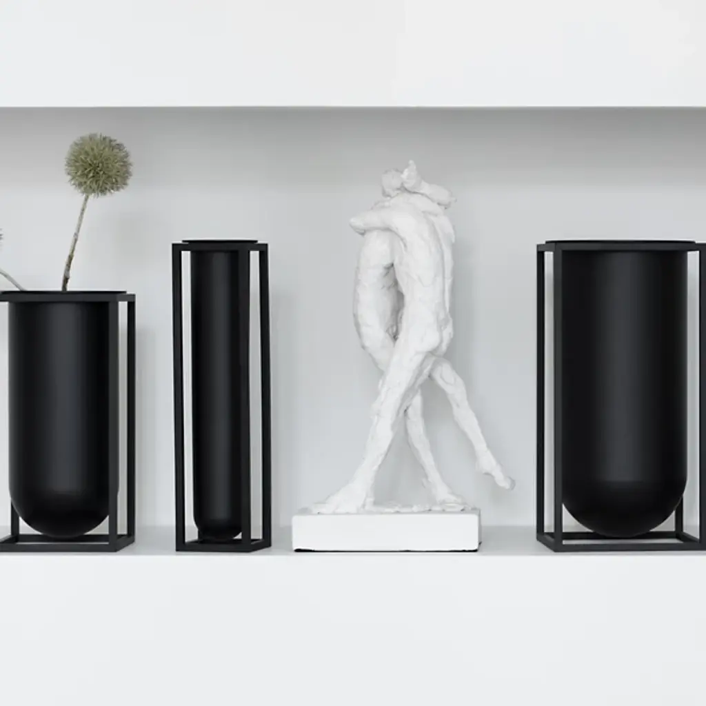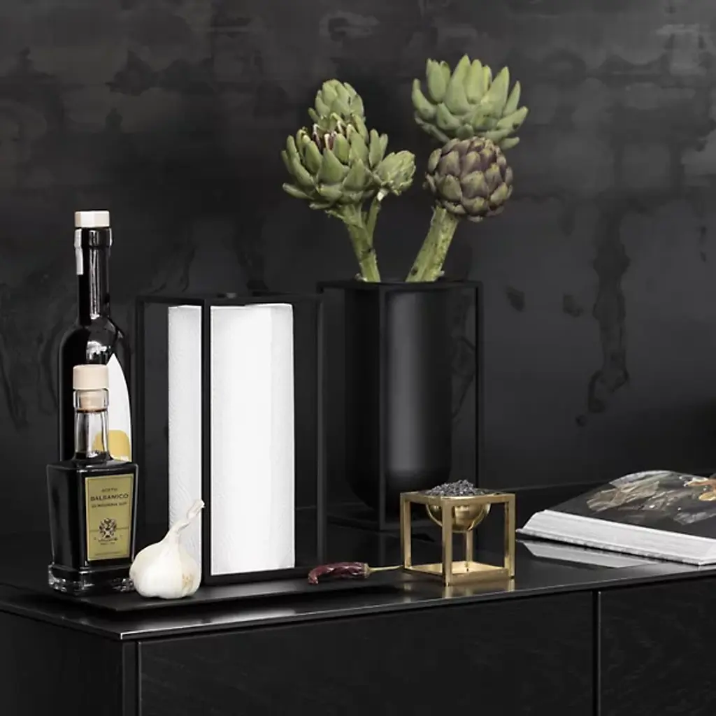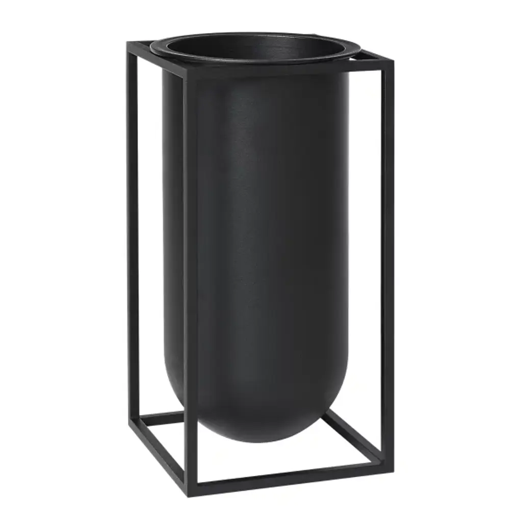 Lend an inspired addition to your inside spaces with the sleek surfaces and open construction of the Kubus Vase Audo Copenhagen, formerly known as Menu. It is designed by Soren Lassen who artfully blends Scandinavian and contemporary styles, working with zinc and aluminum. Starting with a tall rectangular prism frame, it seats an elongated dome that calls to mind an opaque test tube inside it, ideally sized to secure several stems upright. The powder-coated matte texture contrasts beautifully with colorful flowers or natural herbs placed inside it, ensuring they stand out proudly from the fixture.
