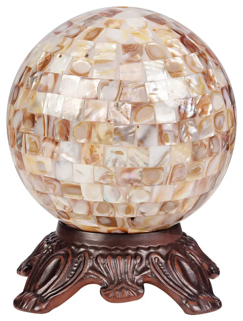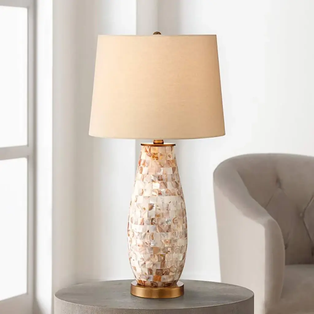 Product Details 26 1/2" high overall. Shade is 12" across the top x 14" across the bottom x 10" high. Uses one maximum 150 watt standard-medium base bulb (not included). On-off socket switch. Mother of pearl base. Glass construction. Warm brass finish accents. Metal construction. Beige fabric tapered drum lamp shade. 8-foot long cord.
