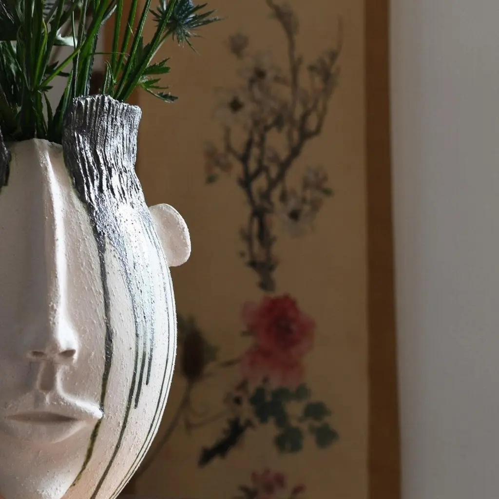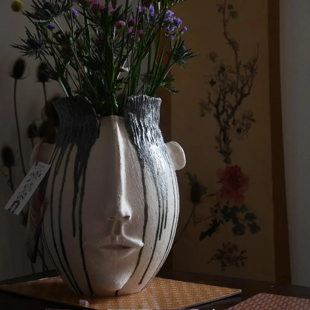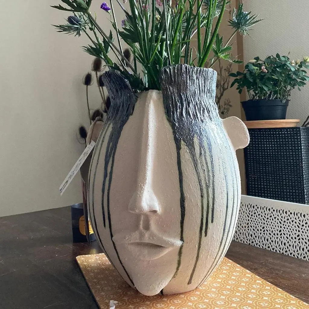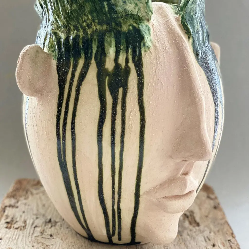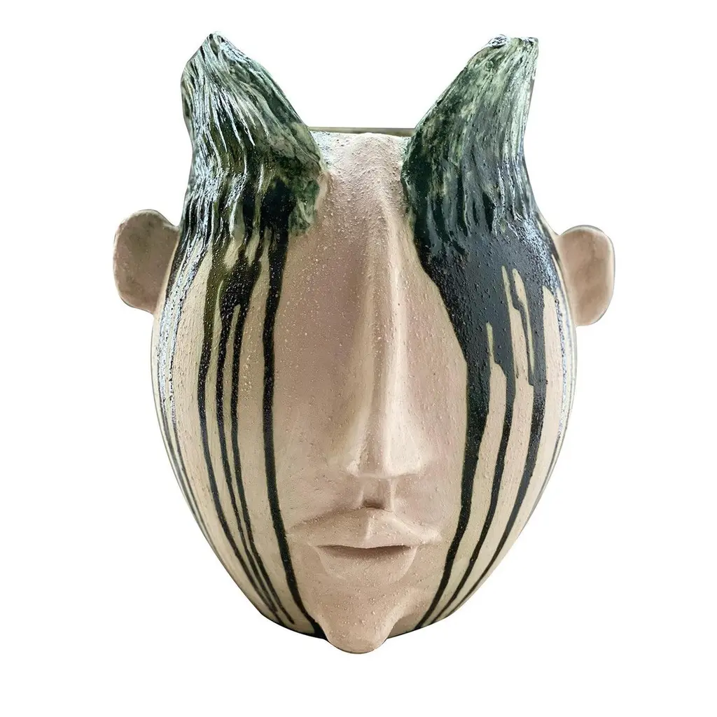 A true objet d'art with a high emotional value, this anthropomorphic vase is deftly handcrafted of ceramic finished with crystalline for a superb sandblasted finish. Prominent ears, chin, mouth, and nose are juxtaposed to an impactful dripping look obtained with green and black enamels pouring from a textured crown-like design, reminiscent of teardrops smudging an elaborate make-up. This singular piece can house glass vases or be displayed as a stunning sculpture in a modern interior.