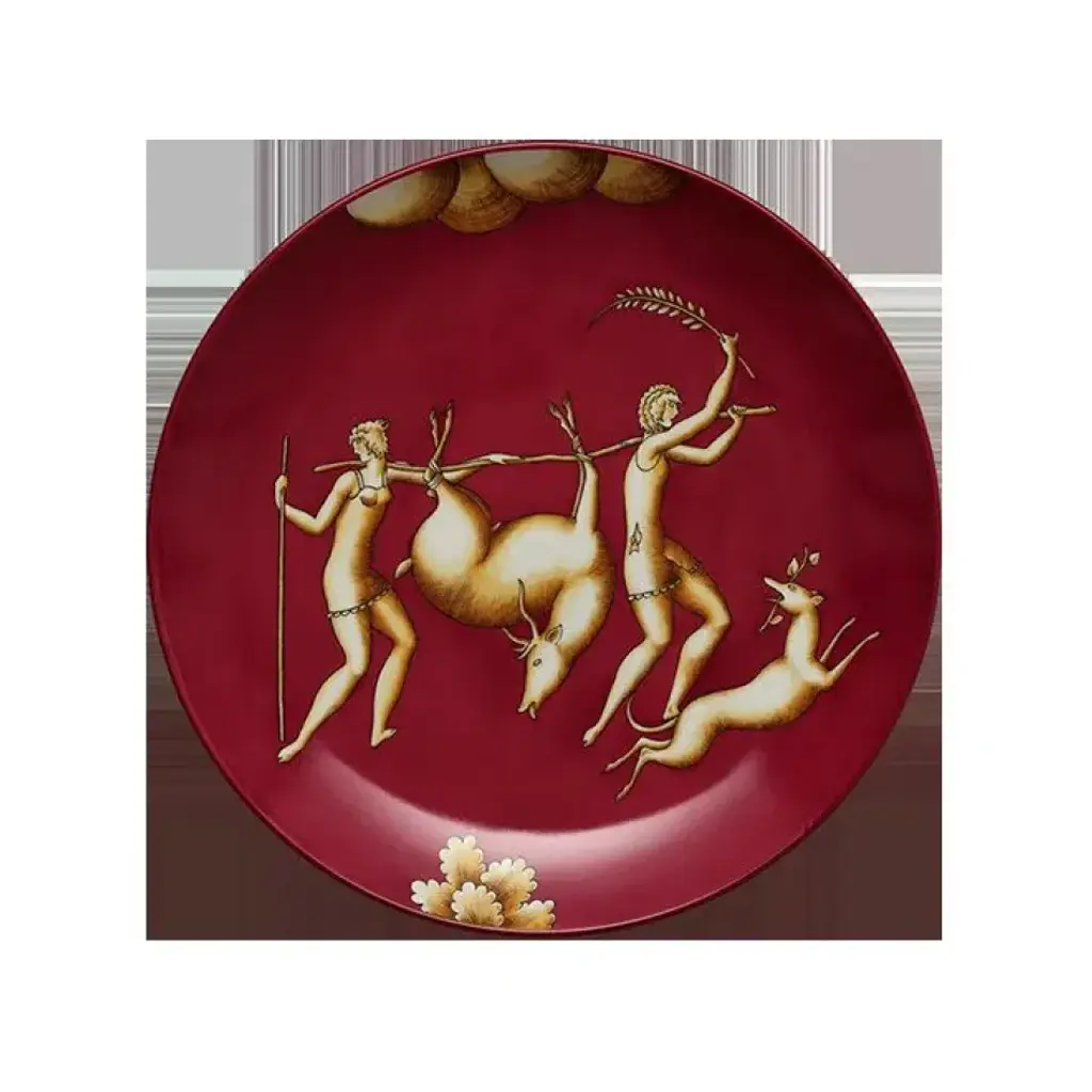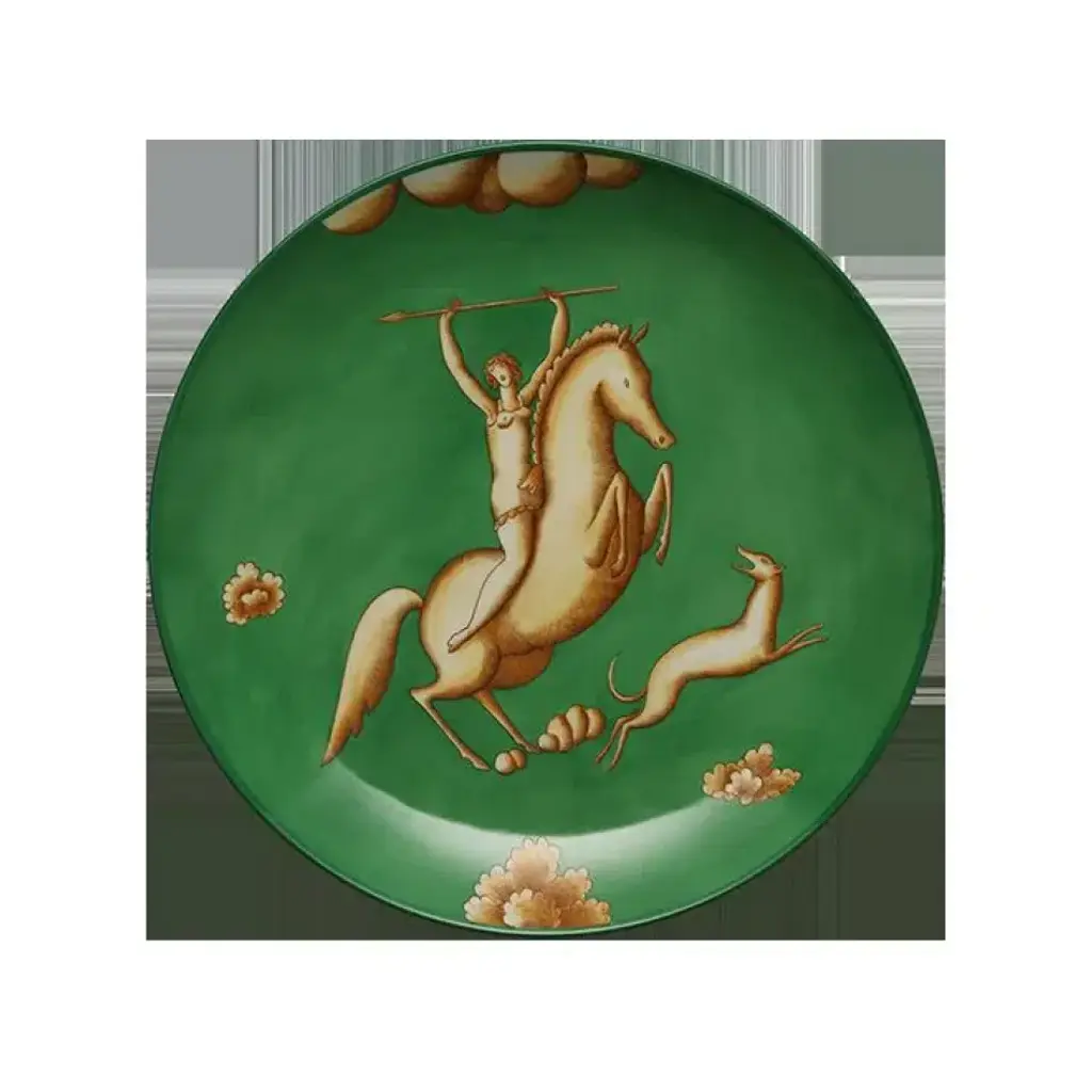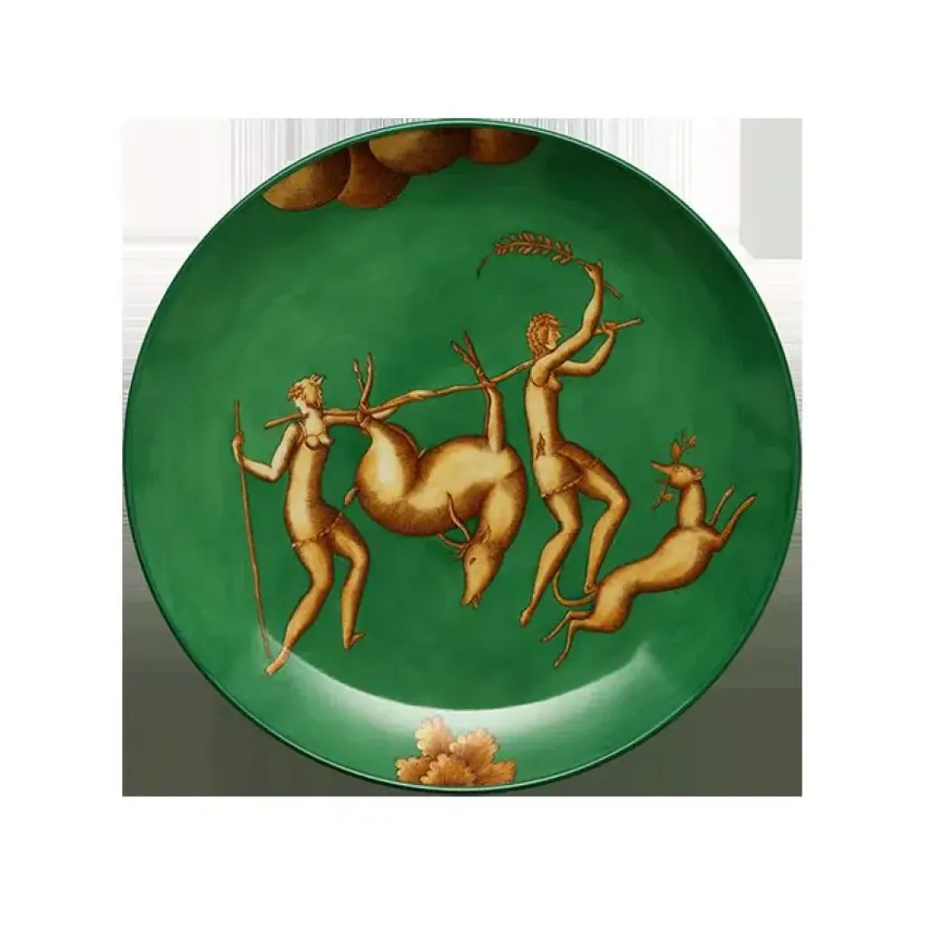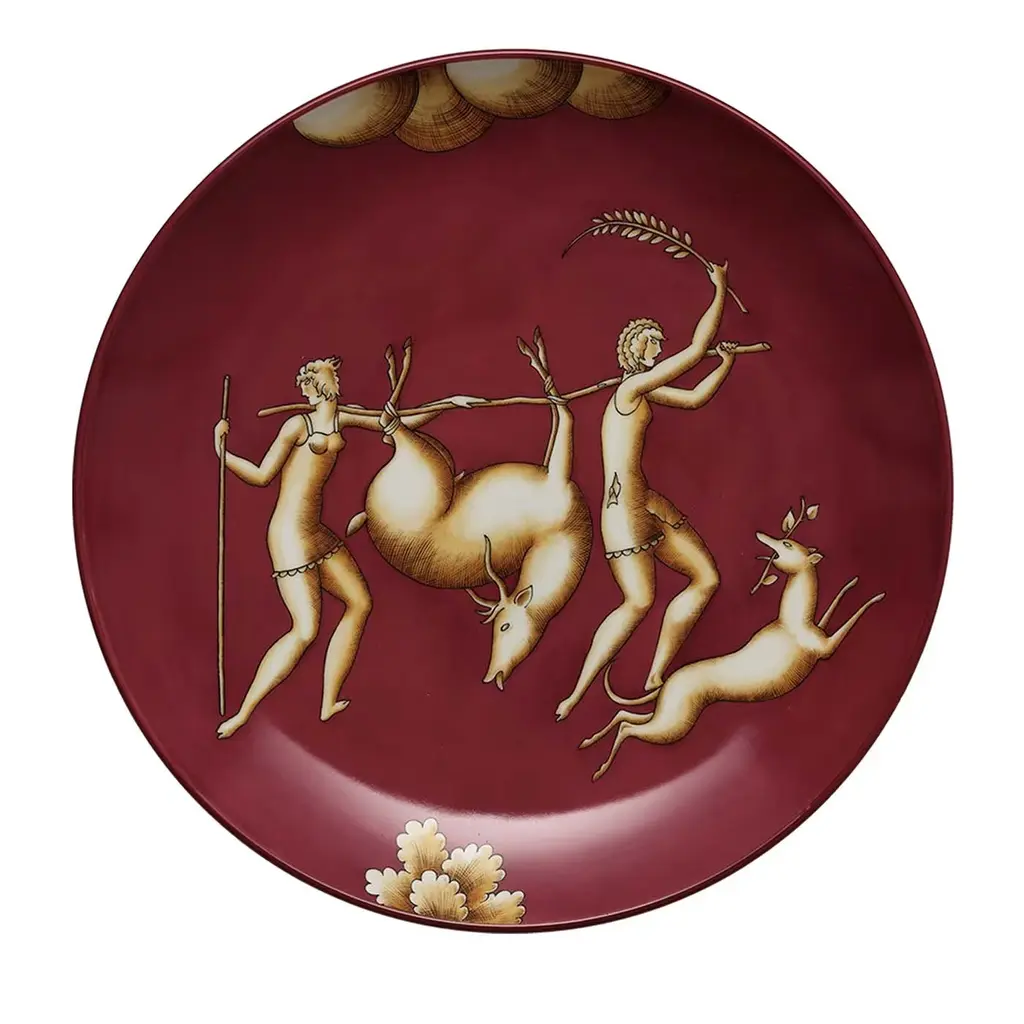 La Venatoria decoration was designed by Giò Ponti to be applied specifically to maiolica, even though he himself later arranged for it to be applied to porcelain, too, in gold etched with an agate tip. The name Venatoria was given to this series because of the narrative theme involving deer-hunting scenes with Amazon warriors, accompanied by their packs of dogs, and it is this narrative theme that is the distinguishing element of the series: The scenes depicted on the plates have their own sequence, so first the prey is hunted down, and then it is carried off. The topic, inspired by Classical scenes with Amazons intent on the hunt or in battle, but more frequently with the goddess Diana as protagonist, was particularly well-suited to Art Deco. It is not known when this decoration was first developed, but we can be confident that it was already in production by 1928, when Ponti suggests in a letter sent to the then artistic director of the factory in Doccia, Luigi Tazzini, that the colour is too pale. The version being proposed by Richard Ginori is the fruit of continuous experimentation carried out by the company. In fact, the type of decoration used on maiolica is being offered here on porcelain: A uniform coloured background spread with an airbrush and retouched with a brush by the Pittoria master craftsmen to enliven the surface provides the background to the scenes.