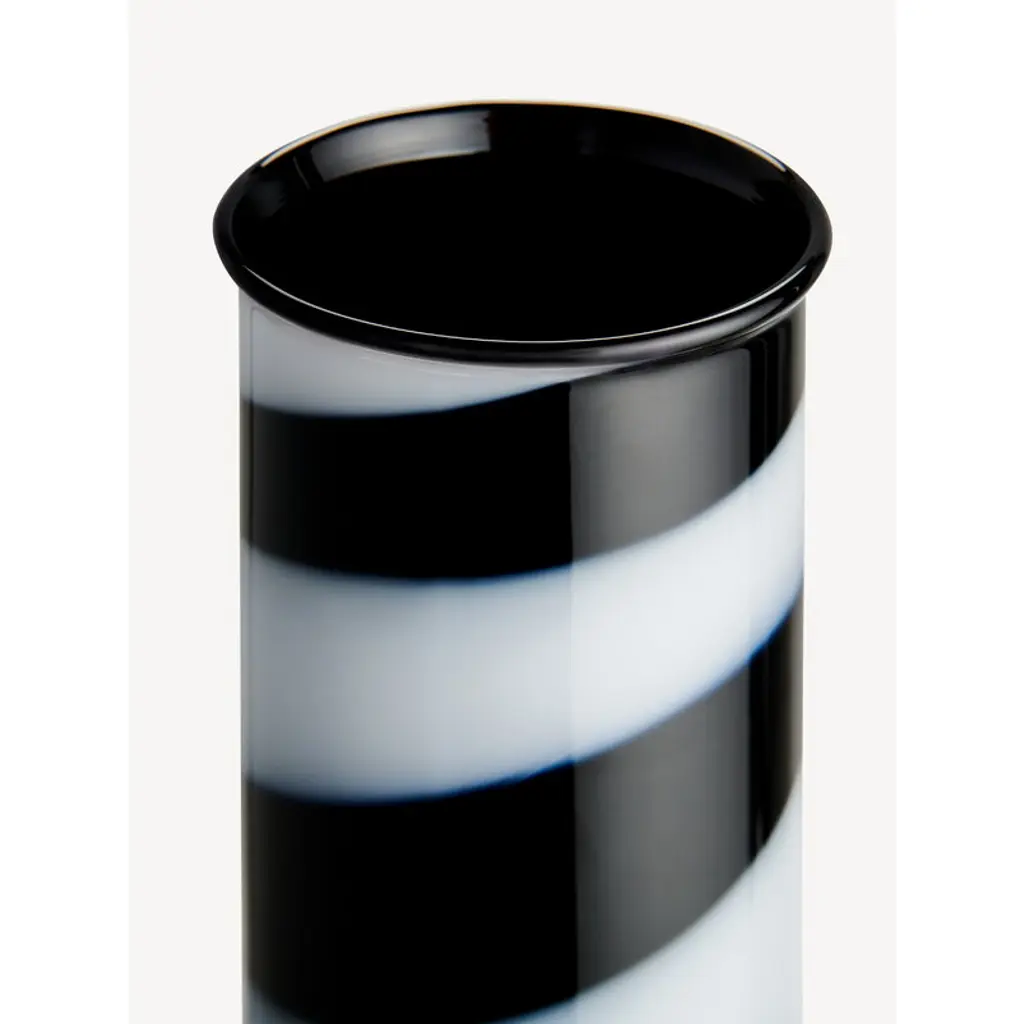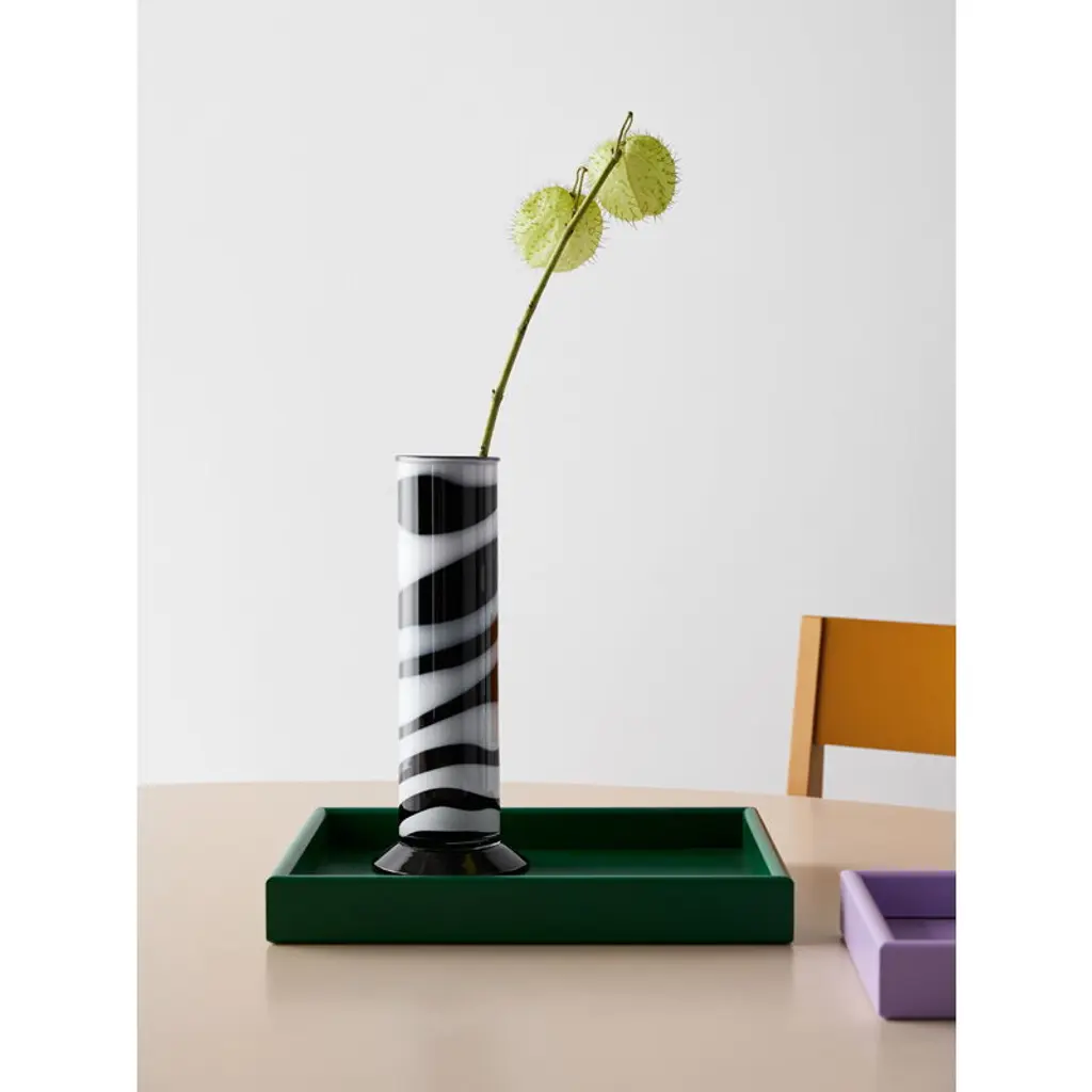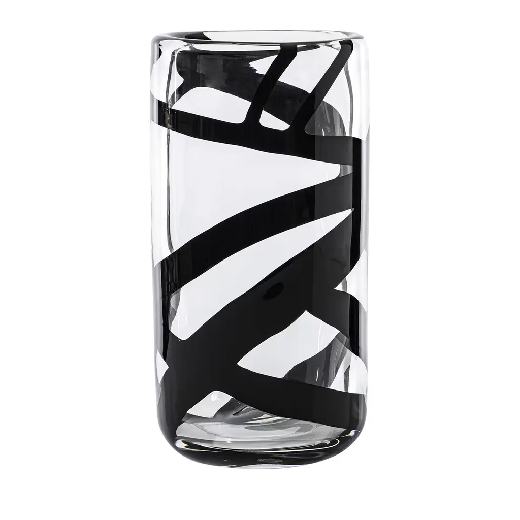 Kosta Boda’s Lab Cylinder vase features a distinctive, tall silhouette reminiscent of cylindrical flasks used in laboratories. Crafted by mouth-blowing lead-free crystal glass, this playful black-and-white vase works beautifully with both single stems and more abundant floral arrangements, while its artistic character makes it a striking decorative piece also on its own. Designer brothers Matti and Simon Klenell drew inspiration for the Lab series from the clean, geometric forms of laboratory measuring glasses. When paired with bold, unexpected colors, these classic shapes take on a whimsical and imaginative quality that invites creative plant styling.