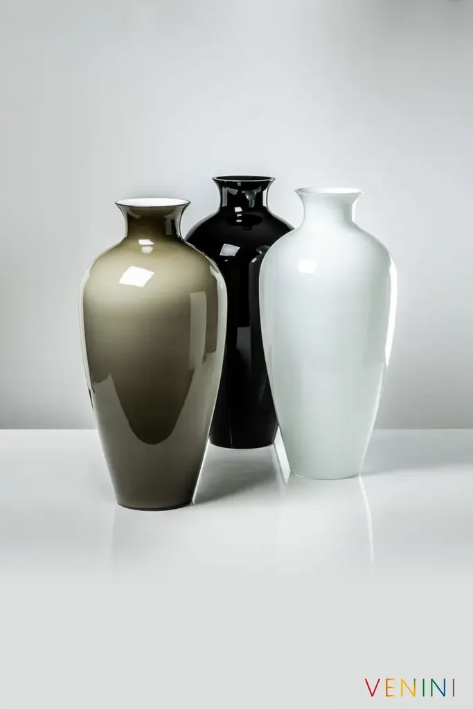 Labuan is a vase obtained by overlapping the milk with other glasses, the opal glass is blown and handcrafted. Drawing inspiration from exotic destinations in the Far East, Paolo Venini opted for a rich and intense color palette to present the Labuan vase to the world, sure to impress. A journey that started back in 1933 and is still ongoing. 2019 marks a milestone in its history, with the launch of a precious new re-edition.Colors:Milk-whiteGreyBlack2019 reissue