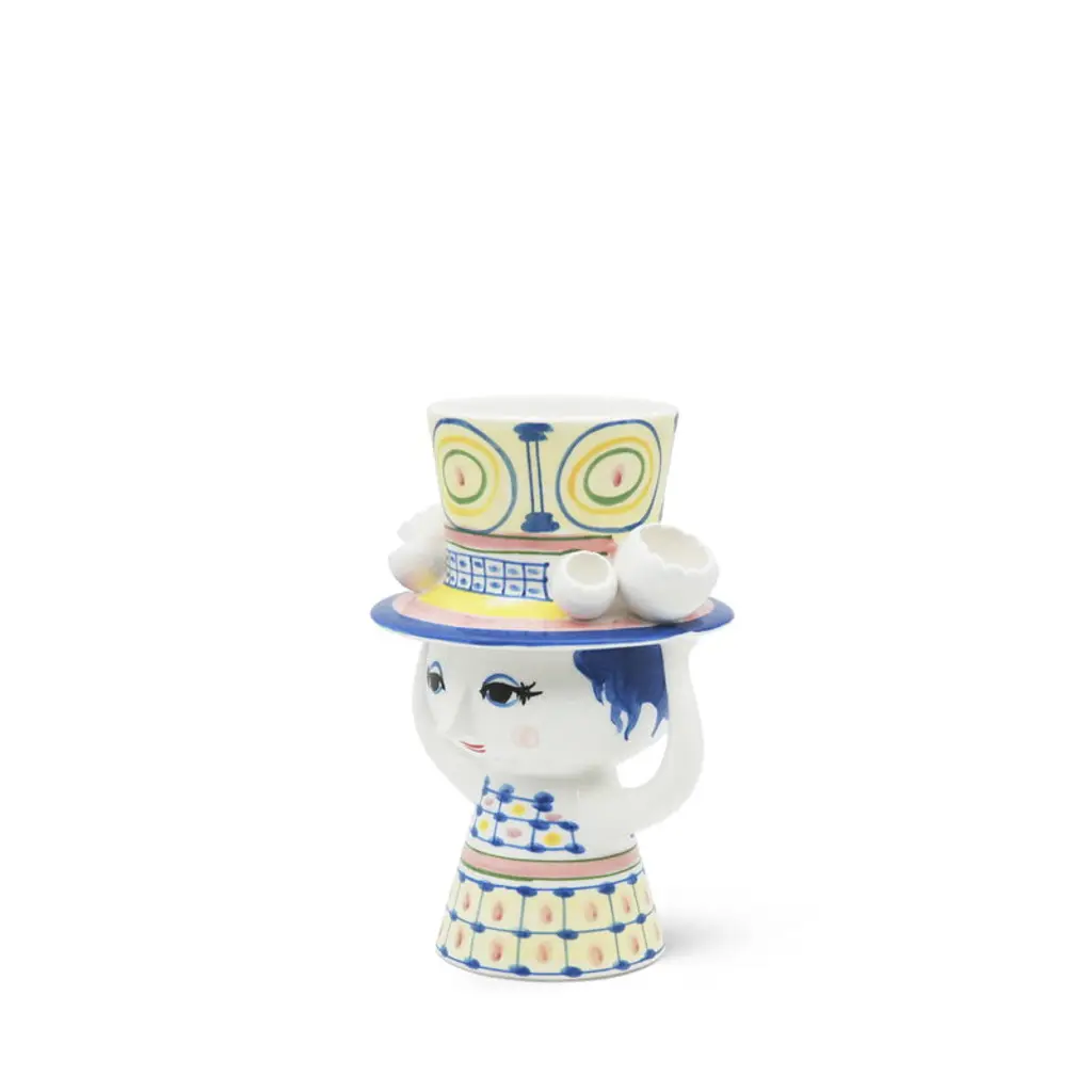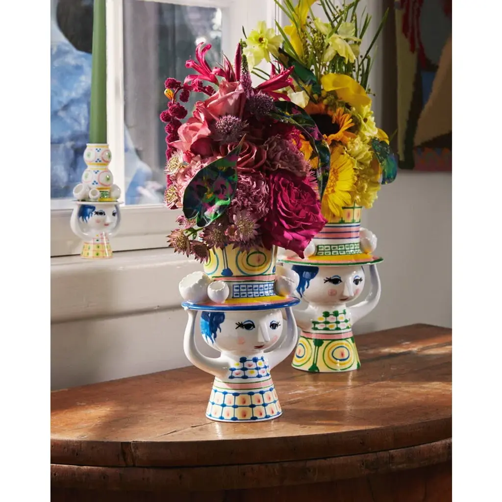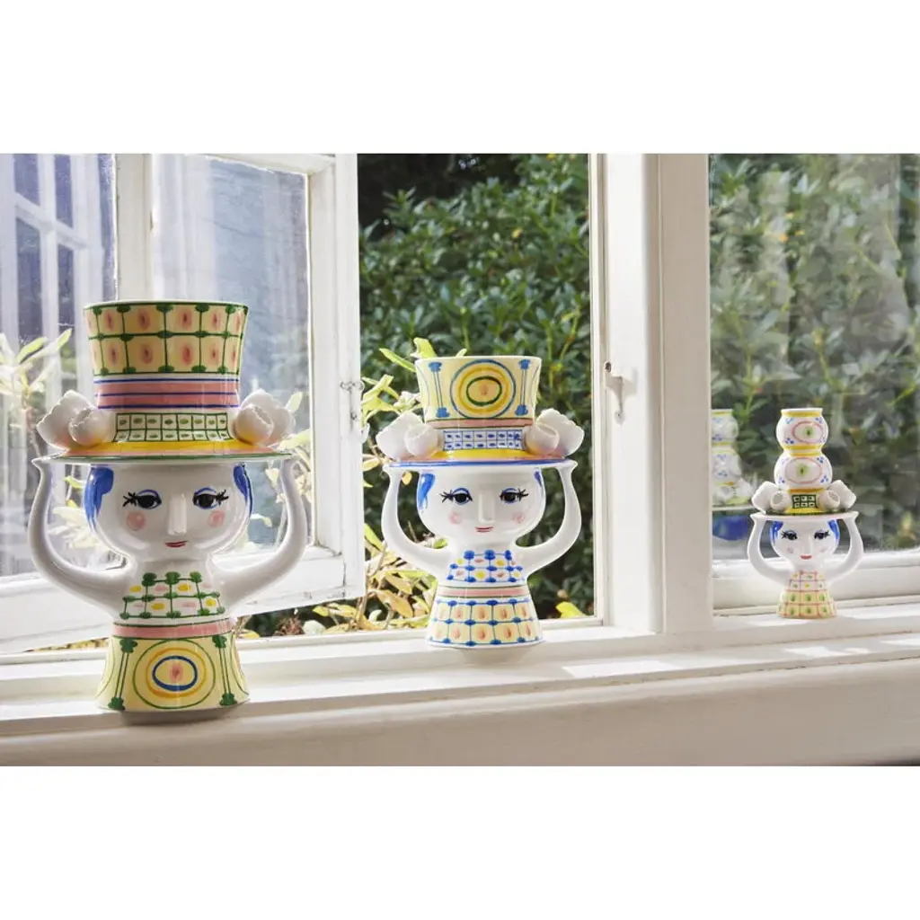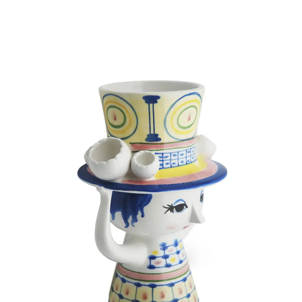 Bjørn Wiinblad's Lady with Hat vase showcases a charming female figure adorned with a vibrant, oversized hat, setting the perfect stage for a sprawling bouquet or arrangement. Even without the embellishment of blooms, this graceful lady, with her meticulously hand-painted attire, enchants any space with her presence. Beloved Danish artist Bjørn Wiinblad, renowned for his magical style and exquisite ornaments, created many feminine characters throughout his career. The Lady with Hat series captures his affinity for dramatic headpieces with a whimsical flair. Made from hand-painted ceramics, these figures radiate joy and serve as timeless tokens of affection, making them exceptional gifts as well.