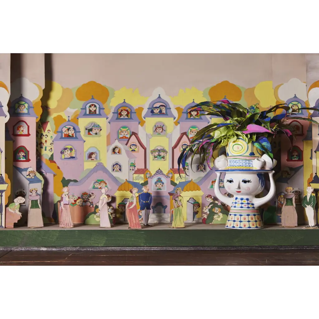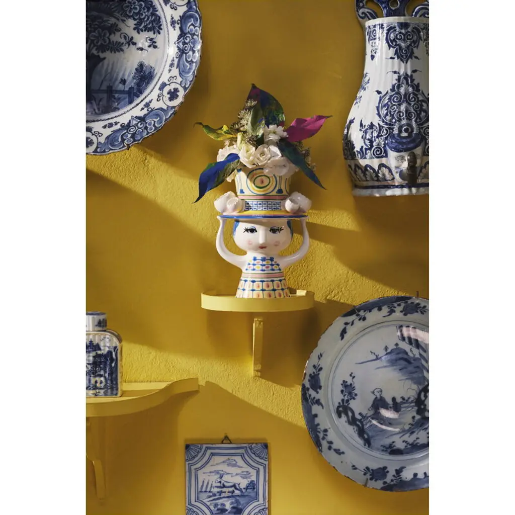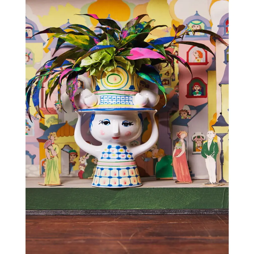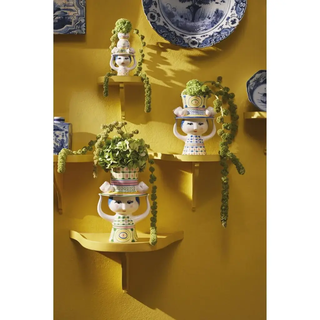Bjørn Wiinblad's Lady with Hat vase showcases a charming female figure adorned with a vibrant, oversized hat, setting the perfect stage for a sprawling bouquet or arrangement. Even without the embellishment of blooms, this graceful lady, with her meticulously hand-painted attire, enchants any space with her presence. Beloved Danish artist Bjørn Wiinblad, renowned for his magical style and exquisite ornaments, created many feminine characters throughout his career. The Lady with Hat series captures his affinity for dramatic headpieces with a whimsical flair. Made from hand-painted ceramics, these figures radiate joy and serve as timeless tokens of affection, making them exceptional gifts as well.