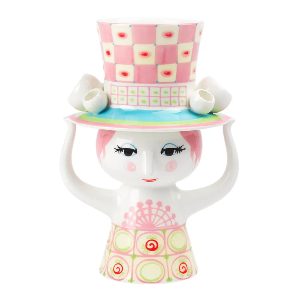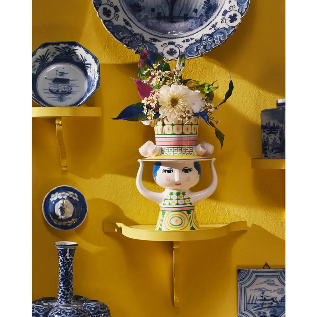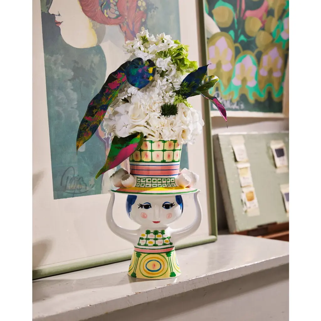 Bjørn Wiinblad's Lady with Hat vase showcases a charming female figure adorned with a vibrant, oversized hat, setting the perfect stage for a sprawling bouquet or arrangement. Even without the embellishment of blooms, this graceful lady, with her meticulously hand-painted attire, enchants any space with her presence. Beloved Danish artist Bjørn Wiinblad, renowned for his magical style and exquisite ornaments, created many feminine characters throughout his career. The Lady with Hat series captures his affinity for dramatic headpieces with a whimsical flair. Made from hand-painted ceramics, these figures radiate joy and serve as timeless tokens of affection, making them exceptional gifts as well.